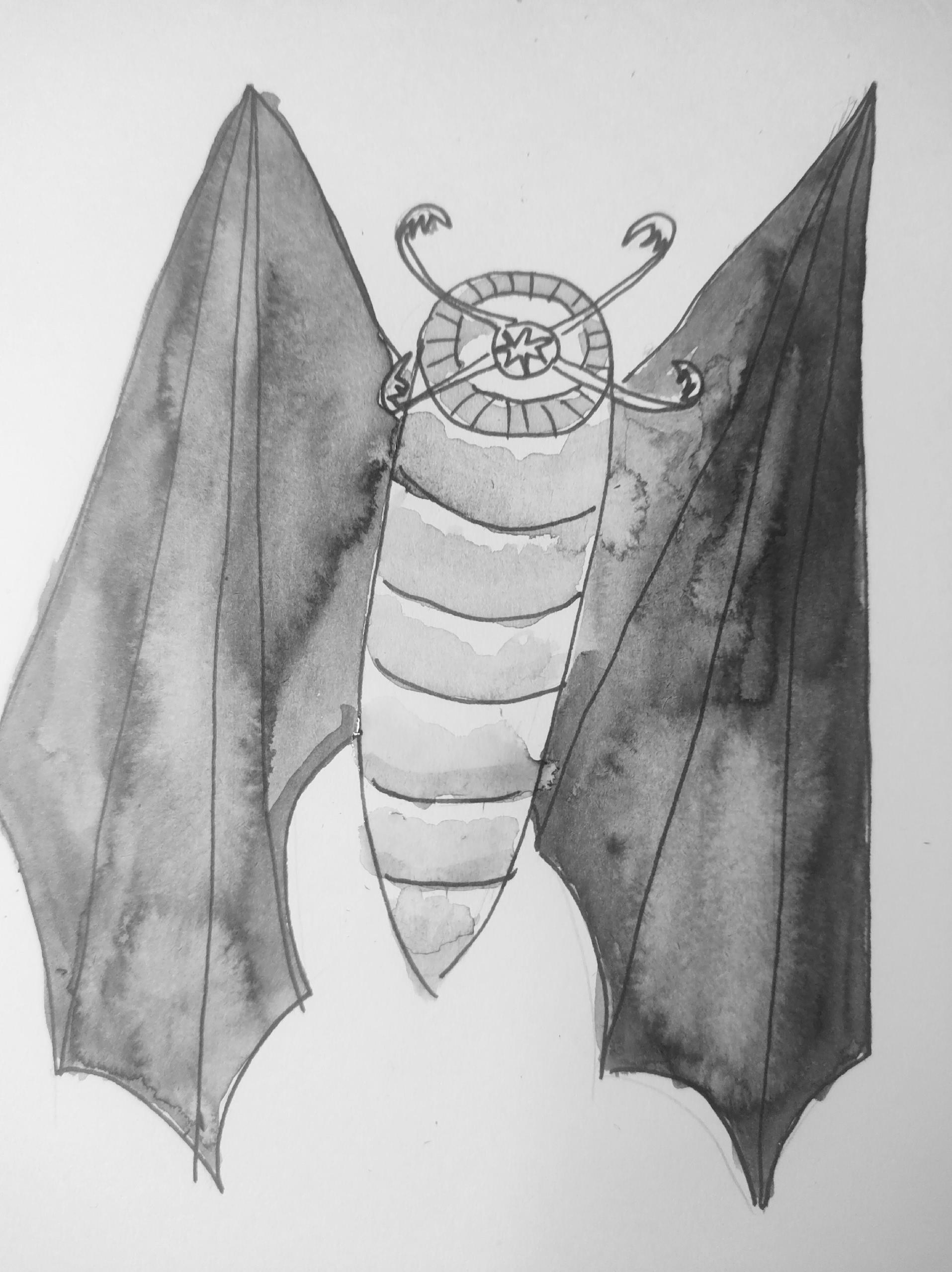 Личинка внешне издали напоминает большую летучую мышь, в близи - помесь летучей мыши с червяком - то есть небольшое кольчатое тело со слабодиференциируемой головой и округлой пастью с 4 клыками-крюками, и довольно большими перепончатыми крыльями.