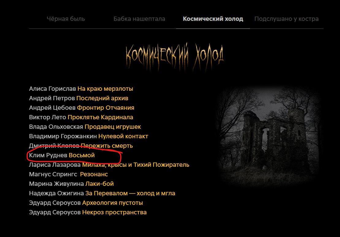 Автор: Клим РудневСегодня стали известны участники, вошедшие в лонг-лист конкурса "Полночные сказки" на Литрес. И я в их числе! Подавался в номинацию "Космический холод" с "Восьмым" и прошел)