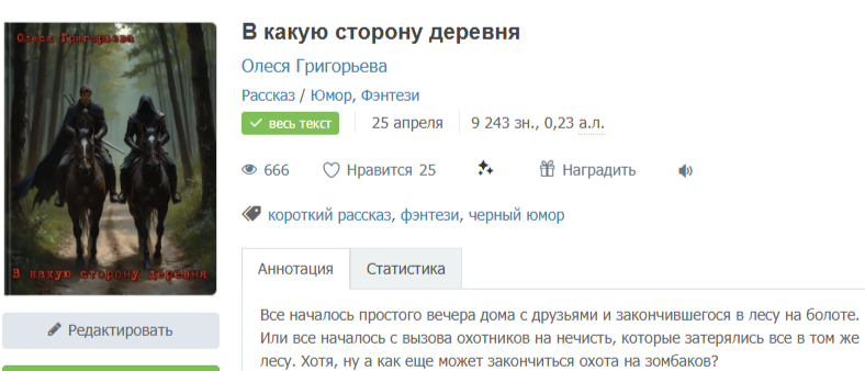 Но для меня, конечно, веселее другая, найденная мной цифра в рассказе "В какую сторону деревня" - это 666 просмотров