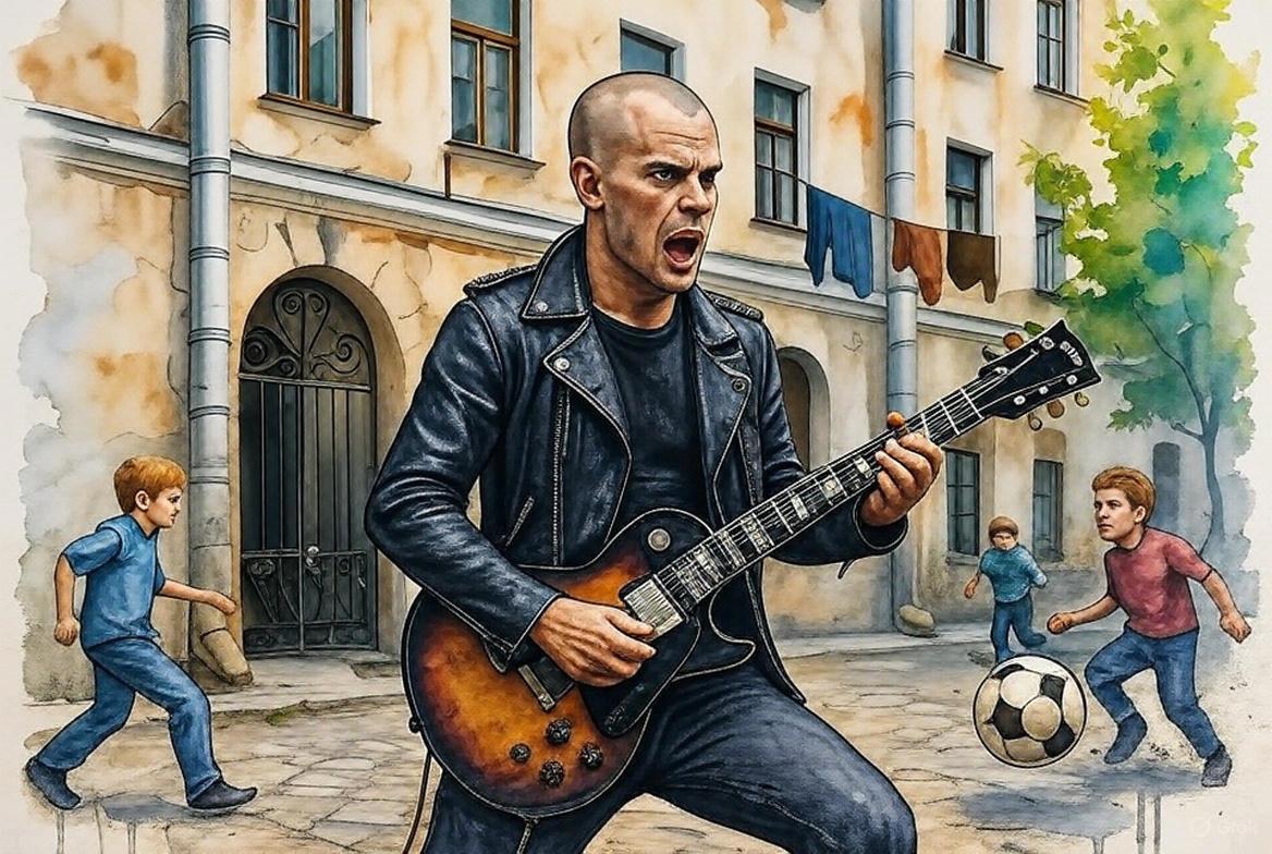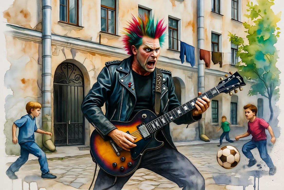 Например, тут я сразу попросил ИИ сделать мне панка поющего во дворе.