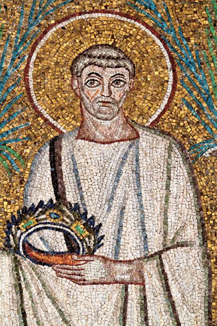 Самое раннее изображение св. Себастьяна. Равенна, VI век, мозаика. Немолод, в тоге, в волосах и бороде седина. Логично...