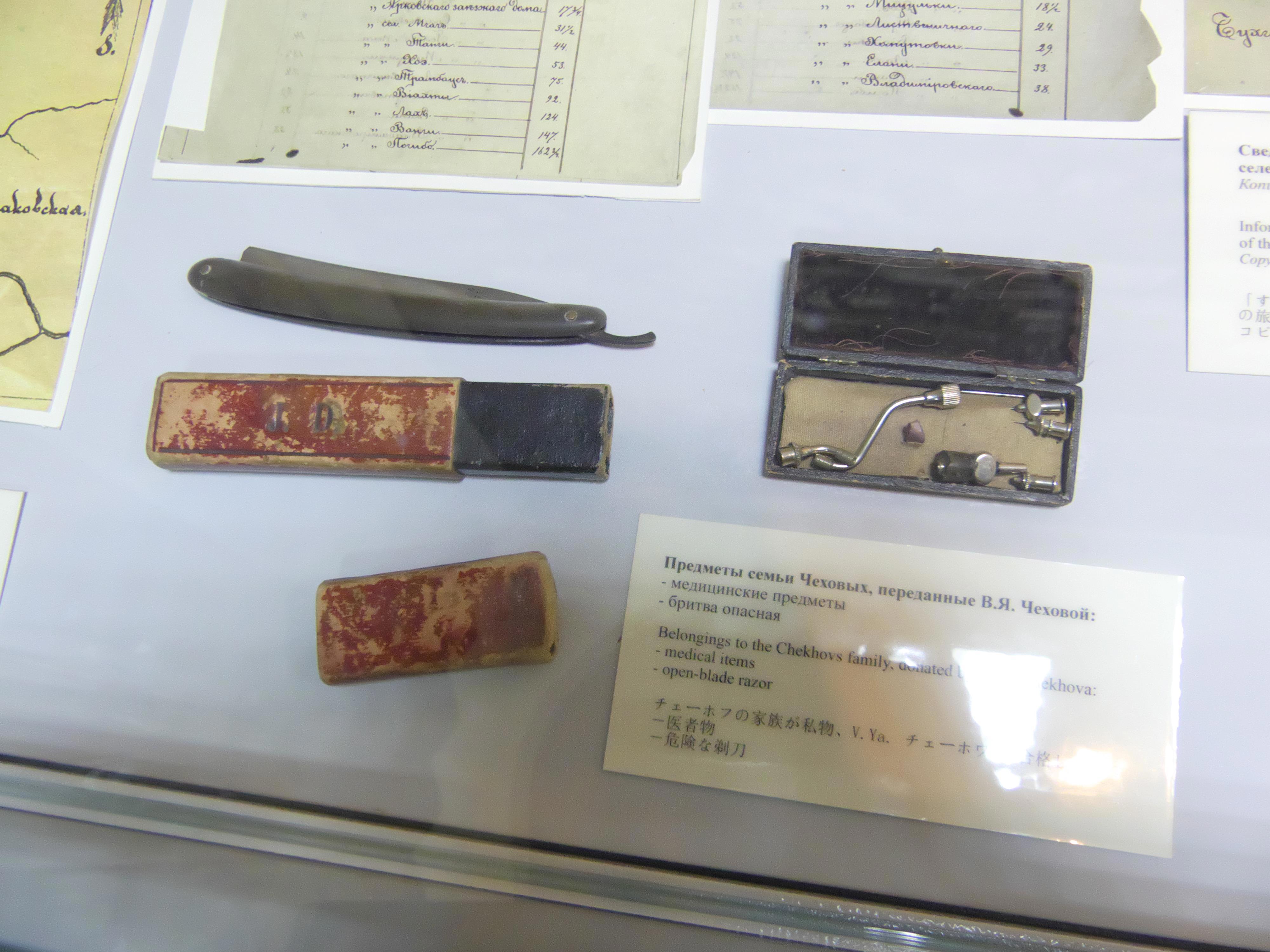 Среди них подлинные вещи семьи Чеховых: дорожная сумка, медицинские иглы, опасная бритва, щипцы для колки сахара, лампадка, таз для варки варенья.