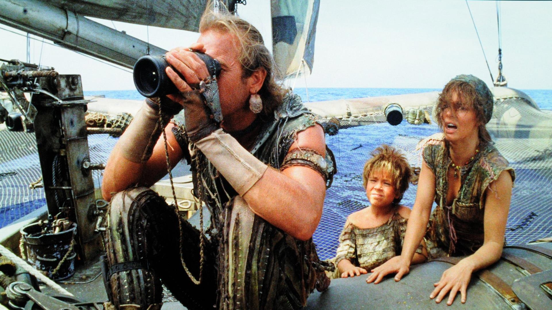 Жизнь на затопленной Земле сурова. Люди пьют собственную мочу, меняются потерявшими смысл артефактами, используют умерших в качестве удобрений. Кругом вода и почва является главной ценностью, но рыбу в фильме никто не ловит (каннибализм при этом не наблюдается). В 1995-м году Костнер шагнул в пятый десяток, потому фильм отличается от типичных боевиков «минимум диалогов / максимум мускулов». Актер компенсировал недостаток фактуры молчаливой брутальностью таинственного Морехода (Mariner). Образ понятен — не можешь быть сильным, будь умным и находчивым. Мореход как будто таким и является, но поступки ихтиосапиенса с амплуа сообразительного персонажа не согласуются. Сперва Морехода обкрадывают, затем он прибывает на мены и отказывается от предложения передать свое семя девушке. Мореход не хитрит, не выжидает момент, чтобы покинуть атолл, он оскорбляет местных грубым отказом и попадает в клетку.