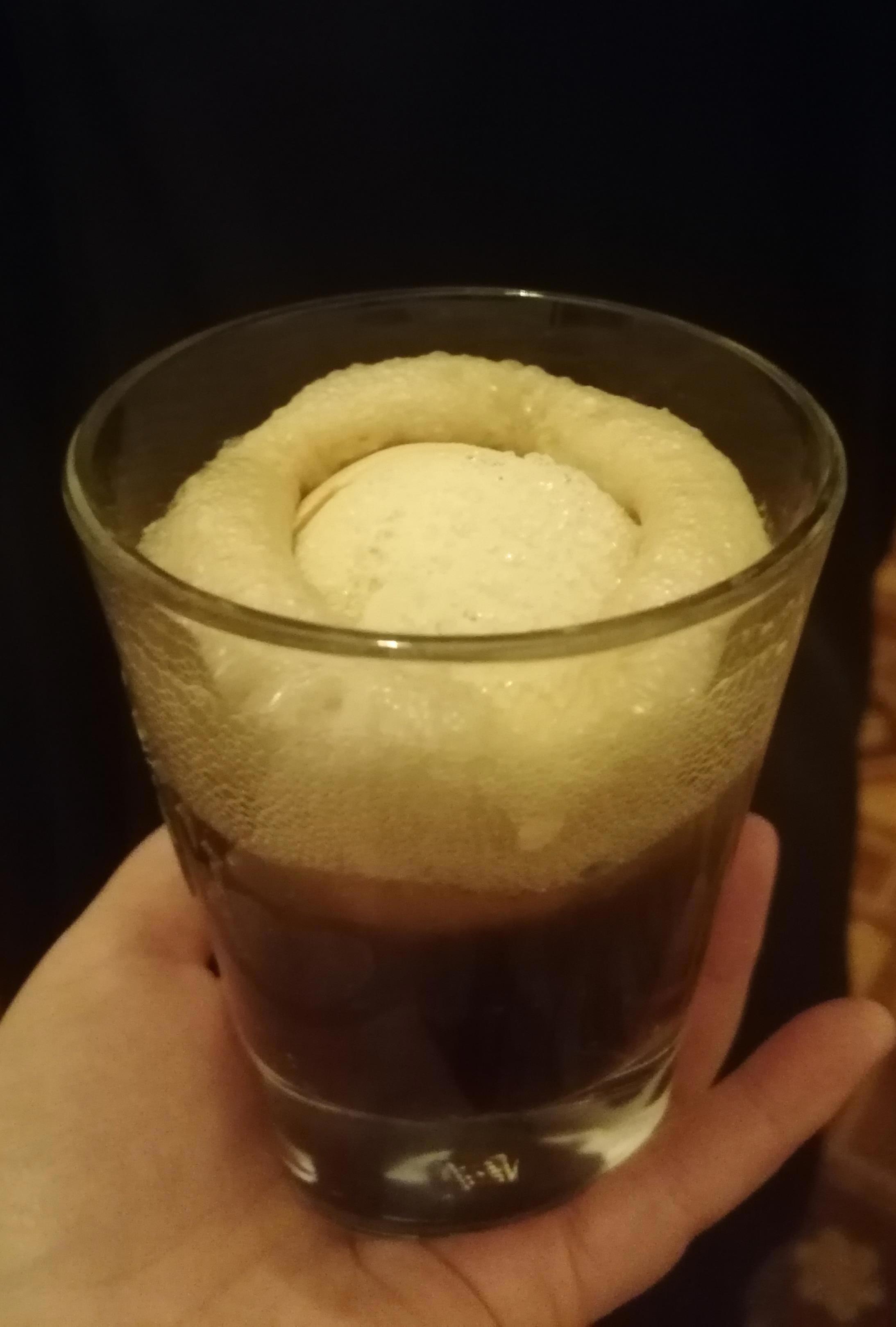 И состав простейший — кола и мороженое))) на удивление зубы не расплавились, желудок не отвалился. Вообще странное дело — вкусы, сладкие (!), смешались и дали неожиданный эффект — коктейль получился комнатной температуры и почти не сладким. Что там за реакция происходила не понятно, но мороженое было из морозилки, кола из холодильника