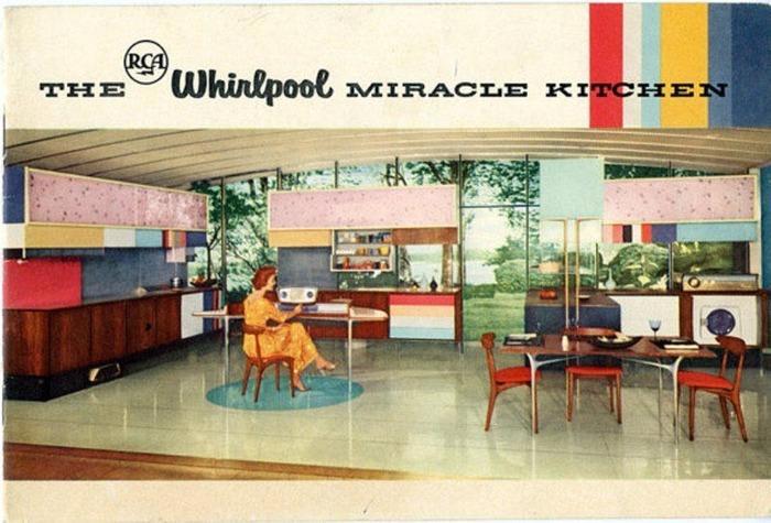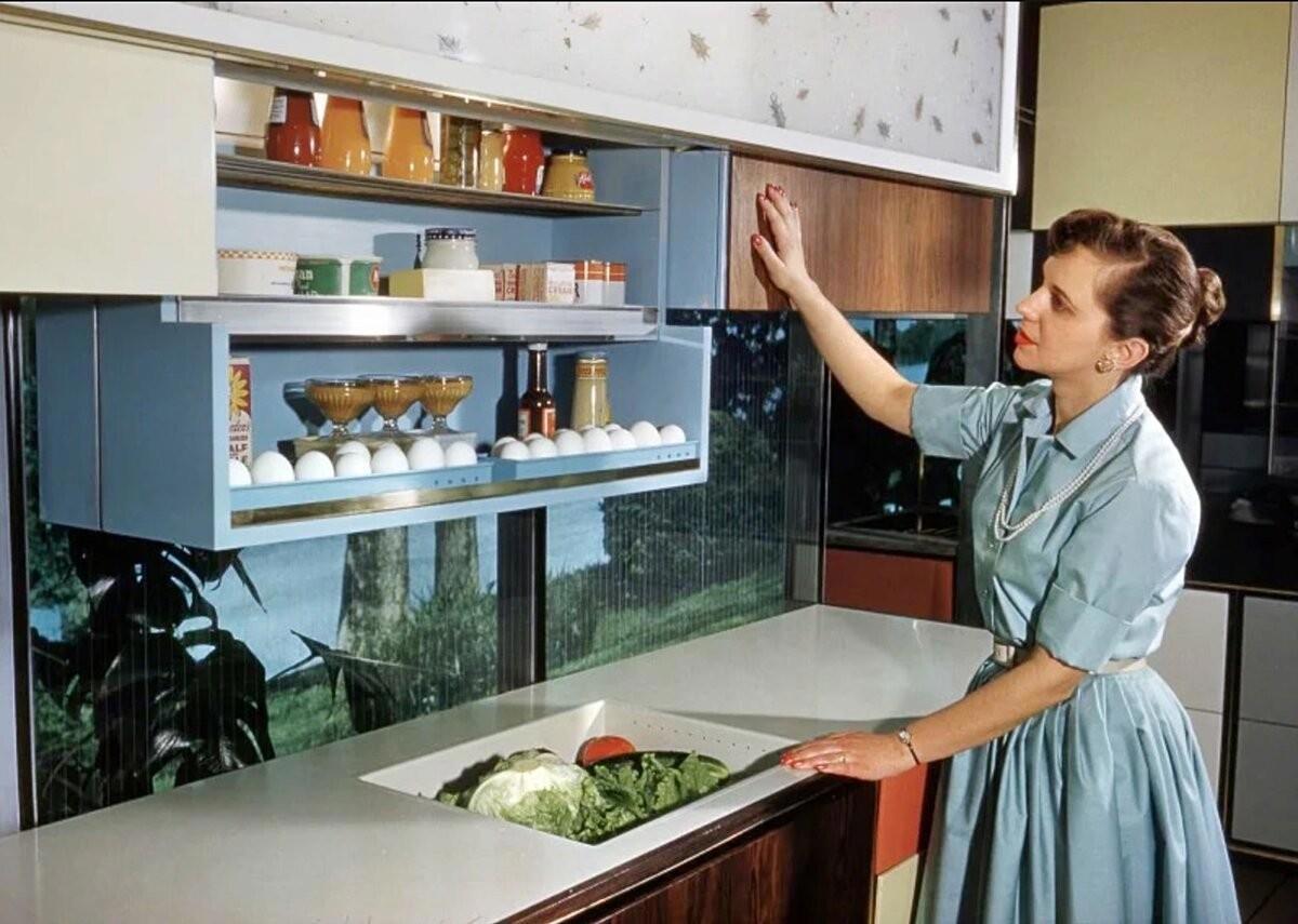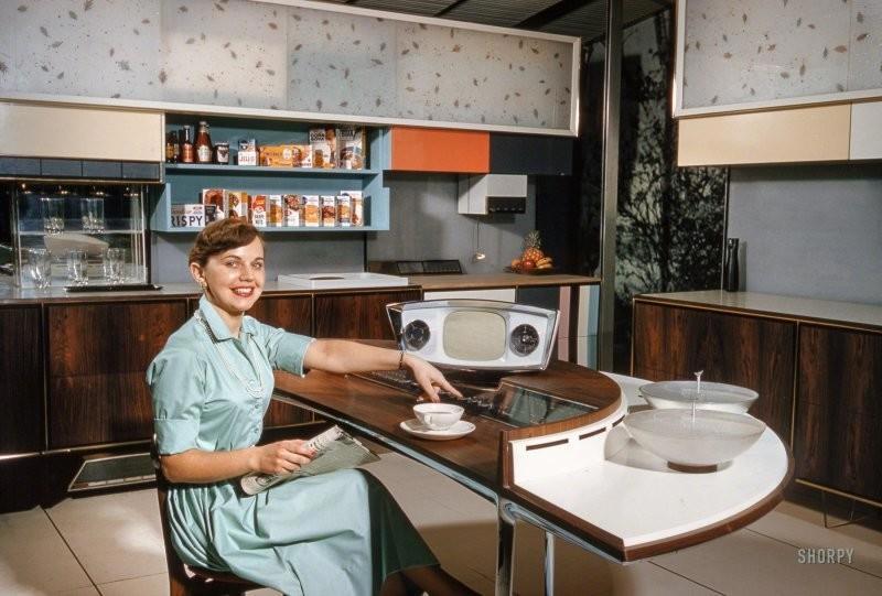 Автор: Марципана КонфитюрНашла интересное! Добрые люди выложили на Ютуб (а я скачала) видео с кухней мечты "Вирпул" с американской выставки в Сокольниках 1959 года. На этой выставке показывали американские моды, автомобили, бытовые вещи, в том числе обстановку тамошнего жилья. Выставка прославилась дебатами Хрущева и тогдашнего вице-президента Никсона на кухне в муляже американского дома. А тут другая кухня - сверхтехнологичная, из будущего, со встроенным миксером, самоходными и самодвижущимся шкафами, крутящимся телевизором необычной формы и даже с роботом-пылесосом! Прямо ретрофутуризм, как я люблю. Именно такими вещами был вдохновлен "Атомный пирог". А еще в этом видео можно в очень хорошем качестве посмотреть моды, цены, улицы и разные реалии времен Оттепели/раннего рок-н-ролла. Очень пятидесятно :)