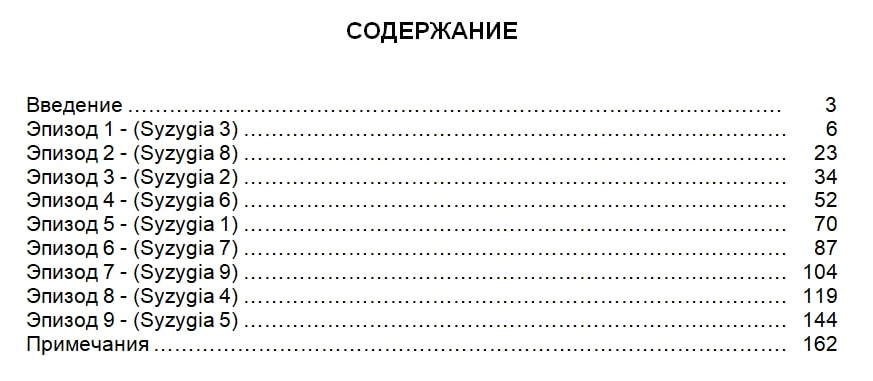 Именно содержание/оглавление, а так же НУМЕРАЦИЯ ПРИМЕЧАНИЙ – и являются своеобразной ПОДСКАЗКОЙ для читателя!!! Когда читатель открывает первый эпизод, «первую» главу романа, но видит надпись в заглавии: «Syzigia-3», а так же сноску к названию эпизода/главы с номером 9 (а не 1), вот уже тогда он и получает свою первую подсказку к разгадке ребуса всего романа!
