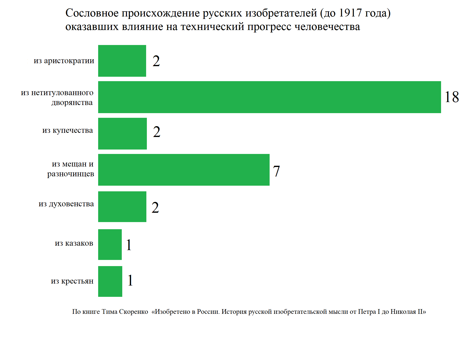 Если число изобретателей поделить на численность "сословной группы", то наилучшие показатели будут у аристократии (которой было ничтожно мало), далее у потомственного дворянства составлявшего около 1% населения. Наихудшие показатели у крестьянства - детство в крестьянской семье очень сильно подавляло творческие способности человека.