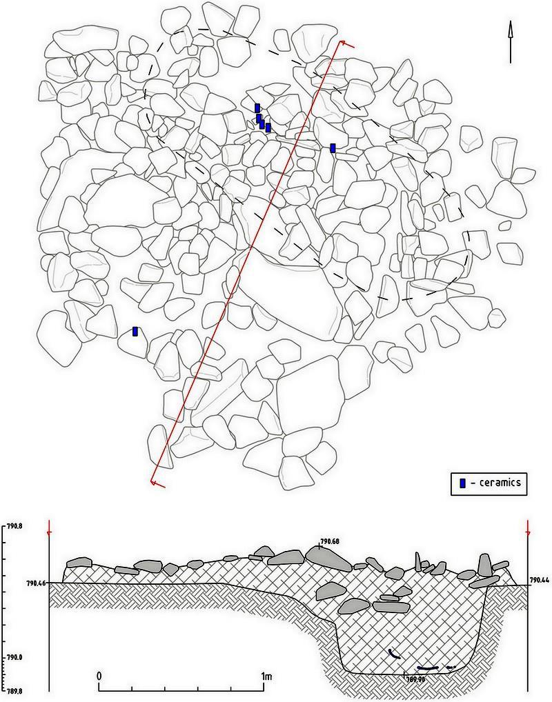 В одних были похоронены несколько людей, другие захоронения были одиночными. Мужских захоронений больше, чем женских. Часть захоронений были беспредметными. Однако это не значит, что хоронили небрежно и наспех. Все могилы были закрыты сверху крупными камнями… трудоёмкий процесс. Вот конструкция «типичного» такого захоронения: