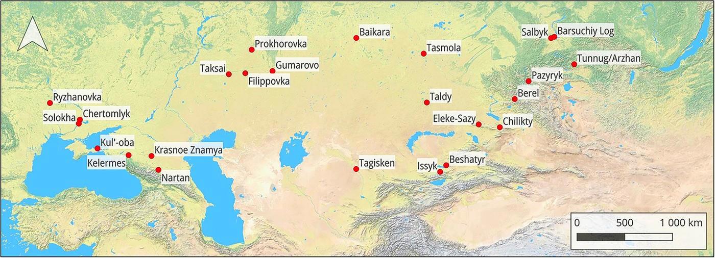 В этом плане интересны раскопки другого кургана. Его называют Кокель и находки, сделанные там настолько оригинальные и характерные, что его отметили отдельно, назвав в его честь целую «культуру». Однако курганы Туннуг-1 и Аржан-1 исследователи всё же относят к кокельской культуре. Вот карта с отмеченным на ней курганом Кокель: