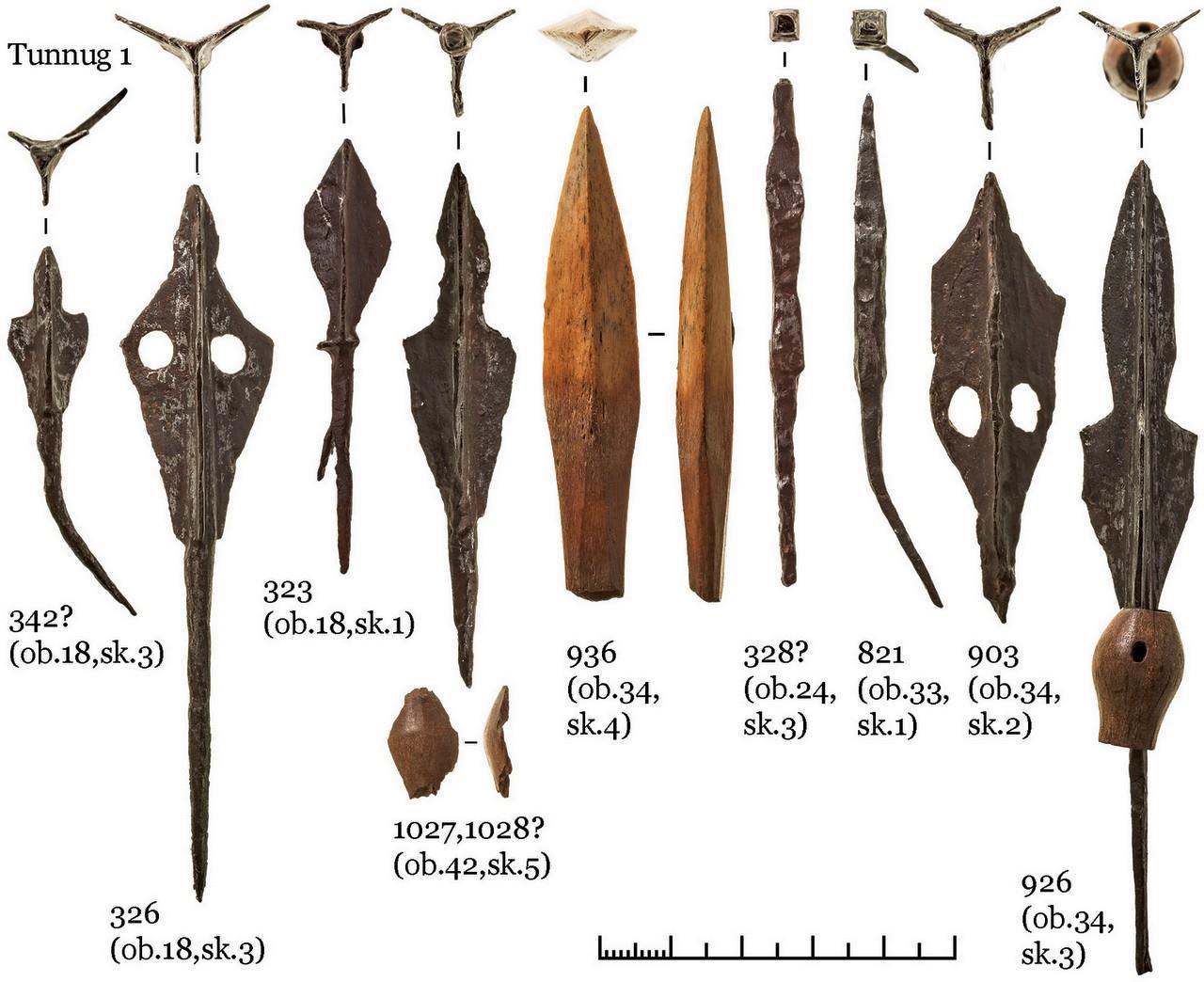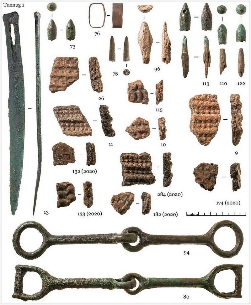 Вот ещё одна фотография, на которой показаны находки на поверхности кургана. Здесь, кроме деталей конской упряжи можно увидеть тот самый нож, который нашли рядом с одним из кинжалов, осколки керамики и наконечники стрел. Кстати, наконечники видимо применялись очень разные. Здесь они небольшого размера, хотя вряд ли это боевые наконечники: