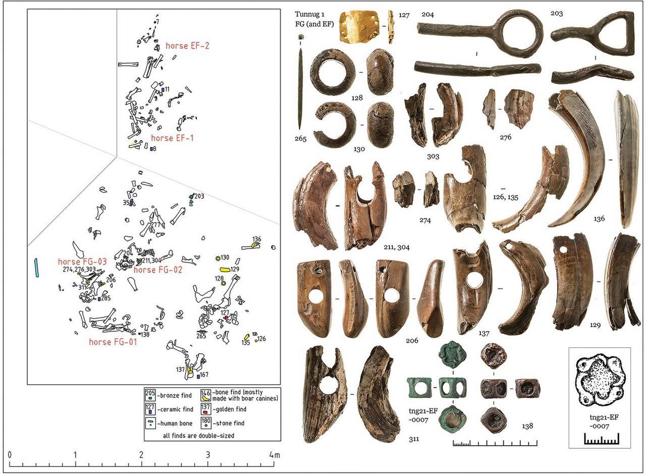 Ещё одна деталь говорит за то, что в текстах под брендом «Геродот» описание «призрачных всадников», то есть чучел всадников было настоящим. Вот часть описания находок: «…кости, лежащие поверх глины, сохранились плохо: кортикальный слой выветрился, а кости стали хрупкими и раскололись. Однако многие лошадиные кости были найдены в анатомически правильном положении, а конская сбруя часто располагалась рядом с раздробленными черепами и зубами. Под камнями лежало множество деревянных обломков, что позволяет предположить, что глиняная поверхность когда-то была покрыта деревянной платформой, на которой выставляли лошадей.» Вот схема (часть) расположения находок на поверхности кургана и сами находки: