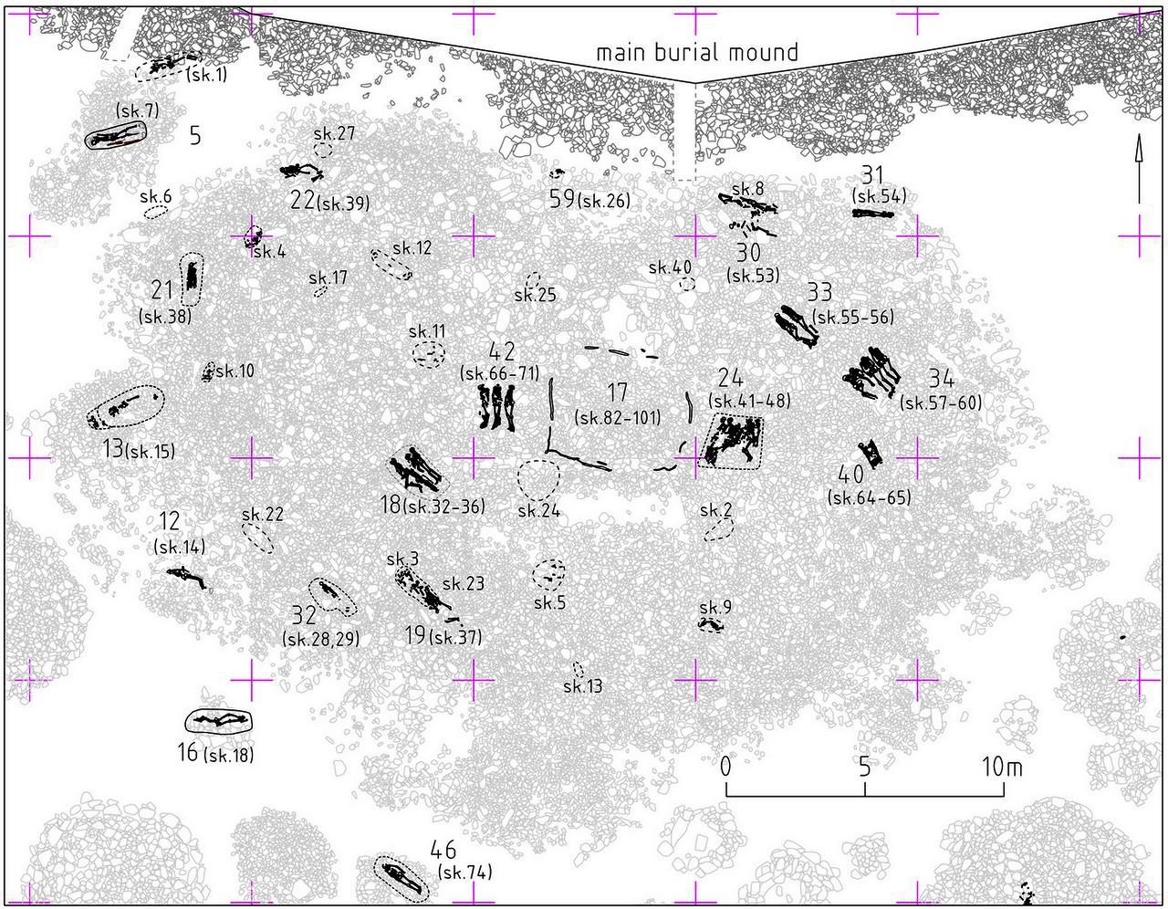 Древняя жизнь курганного комплекса была, по всей вероятности, долгой и насыщенной непростыми событиями. Это понятно по тому, что рядом с курганом (но не затрагивая его конструкцию) исследователи обнаружили много других могил. Вот схема части этих захоронений: