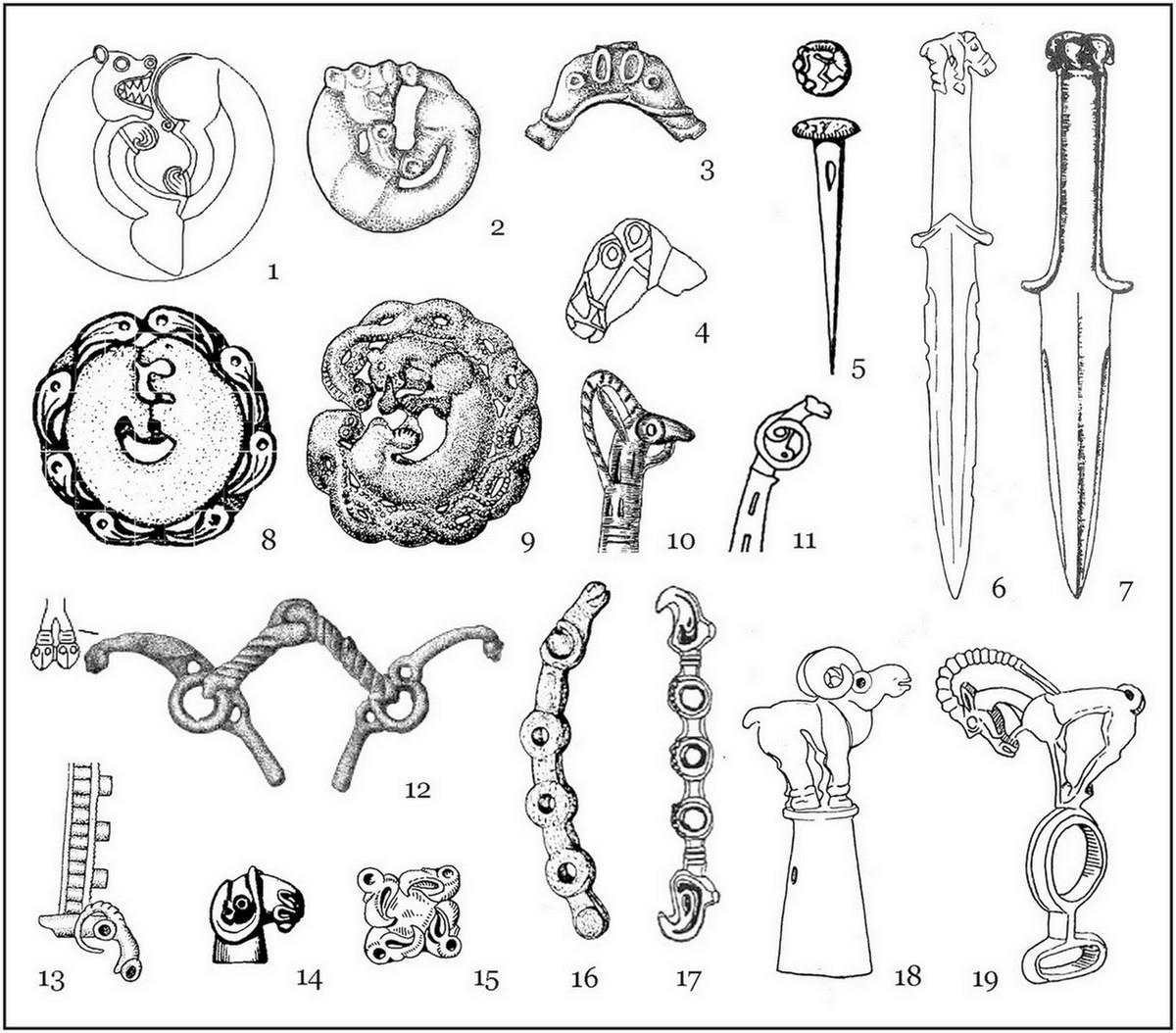 Отмечено, что самое частое изображение, которое найдено при раскопках – это головы хищных птиц. Однако все они были найдены на поверхности кургана среди лошадиных костей. То есть кони были в упряжи, украшенной этими отливками.
