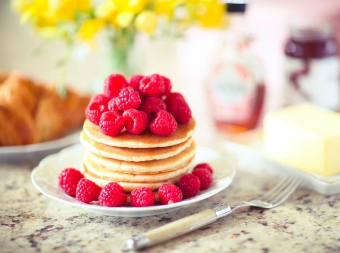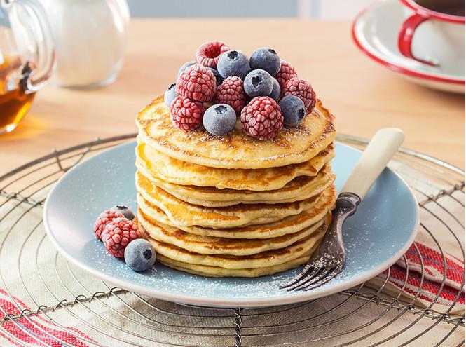Хорошенько взбейте молоко (или сливки) с яйцами, добавите к ним муку, сахар и пекарский порошок. Когда тесто поднимется, и по консистенции будет напоминать густую сметану, можно смазывать сковороду сливочным маслом. По американскому рецепту толстые блины также выпекают с двух сторон, пока они не подрумянятся. Перед подачей сложите их стопочкой и полейте их сладким сиропом, карамелью или сгущённым молоком.