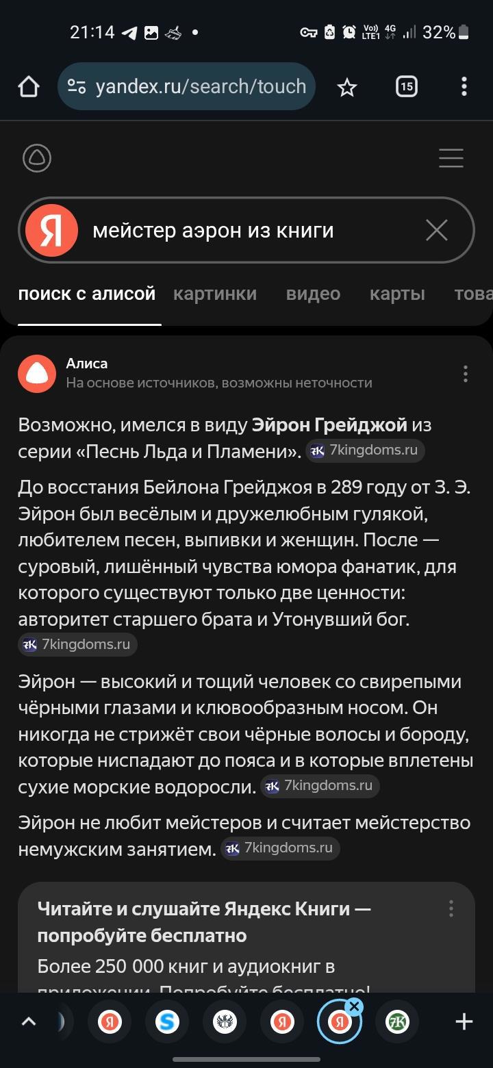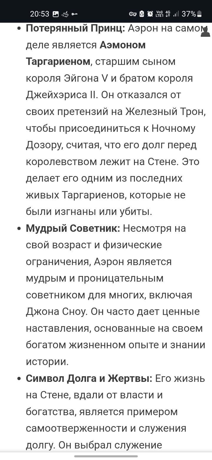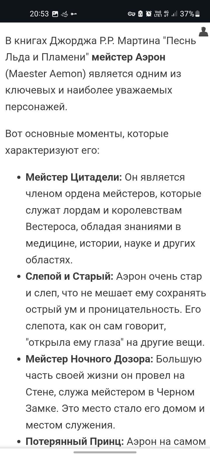 Меня поправили и попытались обьяснить, что это не то. Тут я решил полазить по сайтам по игре престолов и посмотреть есть ли этот Аэрон где нибудь. На хоть каком либо сайте по игре престолов. Его нету ни на инглиш ни на ркских сайтах. Тут я решил просто спросить у нейросети. Кто он? Кто такой мейстер Аэрон? Ответ стал бриллиантом моего дня.