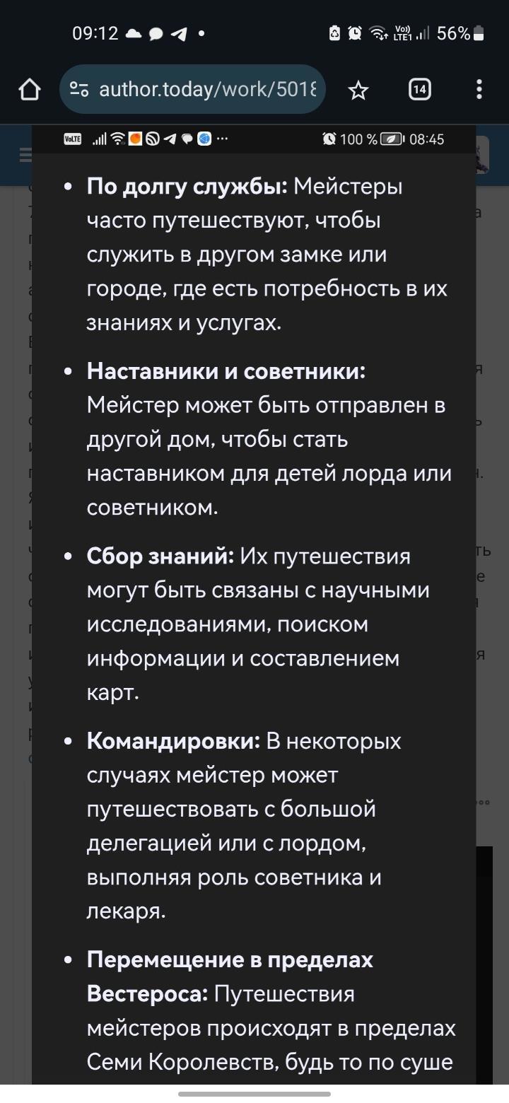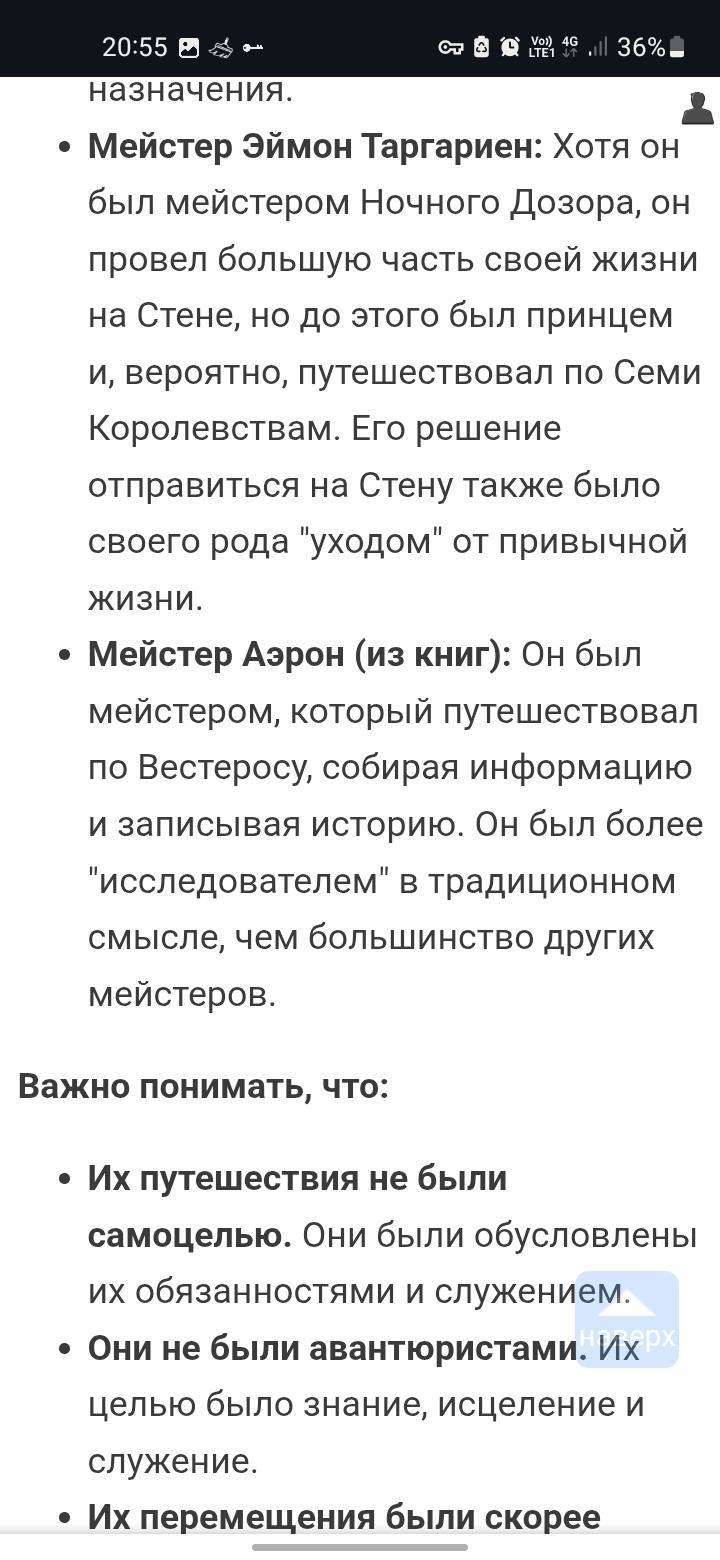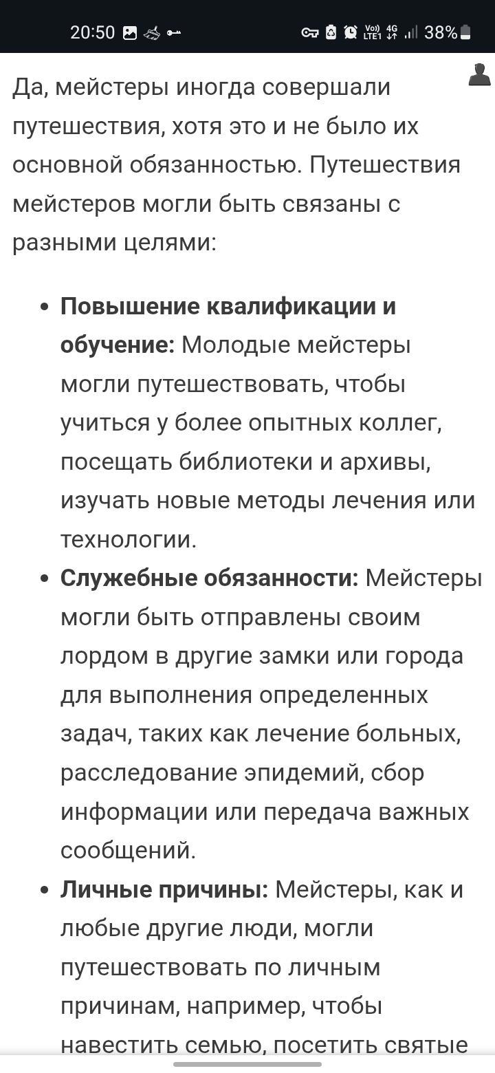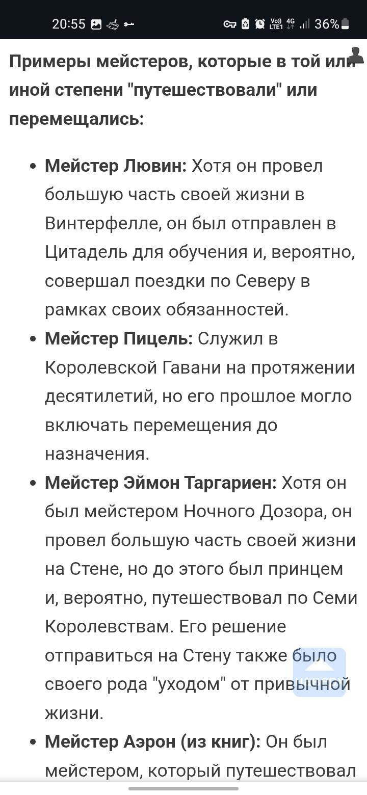 Каков итог? Ну для меня никогда не доверяйте нейросети, а просто ищите инфу в браузере. Там моюно сравнить информацию, найти откуда взялась эта иныормация. И так далее. Существуют ли мейстеры путешественники? Если верить русскоязычным сайтам по игре престолов -нет. Если инглиш сайту, то ответ будет да. Будут ли в моем фику путешествующие мейстеры? Ответ нет. Удачного вам дня, ночи или вечера!