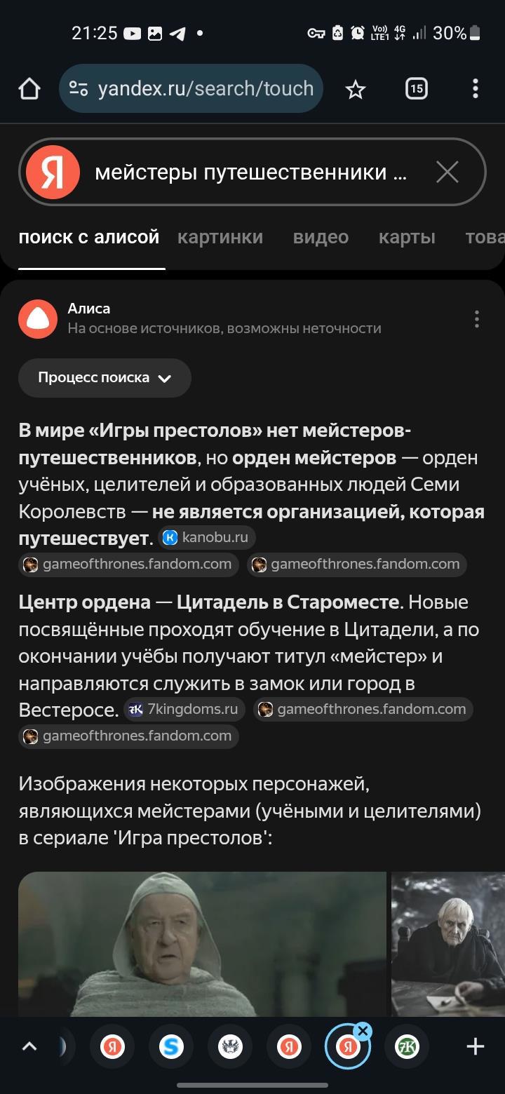 Лишь введя запрос: Проводят ли мейстеры путешествия?. Я смог найти сайт фандом с мейстерами и инглиш сайт по игре престолов. Начал проверять инфу по главам. На которые они ссылаются, я не нашел никакой инфы о том, что они утверждали на сайте в главах книги. Сделал вывод, что это ложь и думал забить. Предложив оппоненту, чтобы он потвердил свое утверждение. О том, что на сайте 7королевств есть инфа о путешествующих мейстеров скинув фото. Он так и не ответил, но мне стало интересно другое. Меня смущало фото о путешествующих мейстеров. Я не сразу сообразил, что это сформулировано на отдельном сайте с нейросетью. Да, я не сообразительный. Ведь им НИКОГДА не задавал вопросы. Как выяснилось, правильно делал. Но начнем с моего запроса нейросетям. Проводят ли мейстеры путешествия? Результат.