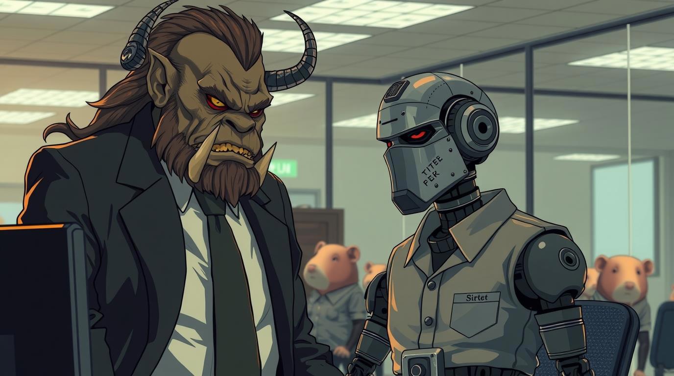 Дверь в опенспейс распахнулась. На пороге стояла Марья Ивановна, начальница отдела, которая так и не получила отчет. Взгляд был злой и предвещающий выговор за просроченную задачу. Зрительный сенсор андроида внезапно наложил маску орка поверх лица женщины. Тяжелый подбородок, налитые свинцом глаза, клыкастая оскаливающаяся пасть. Что вносило дополнительный хаос и в без того тяжелую ситуацию.