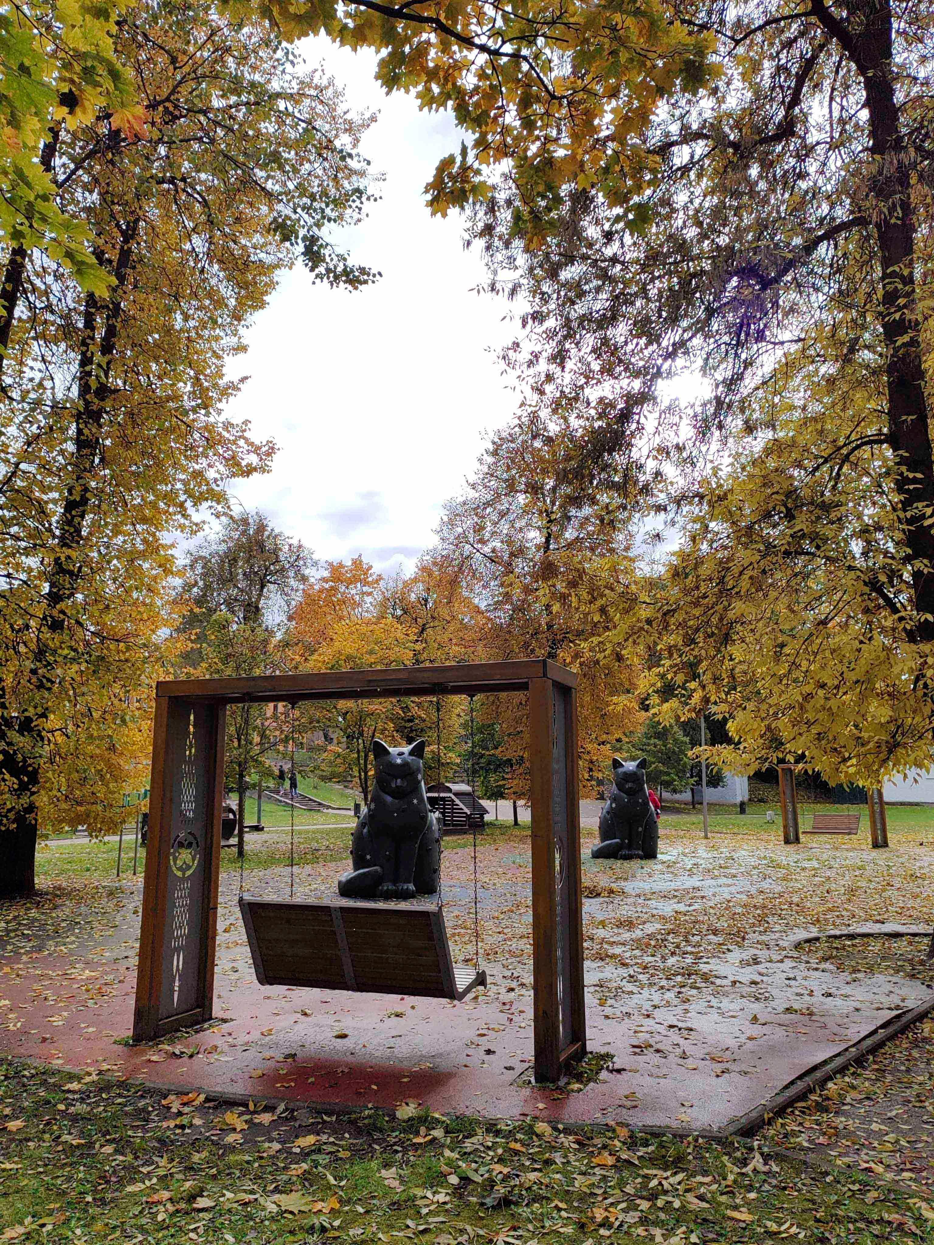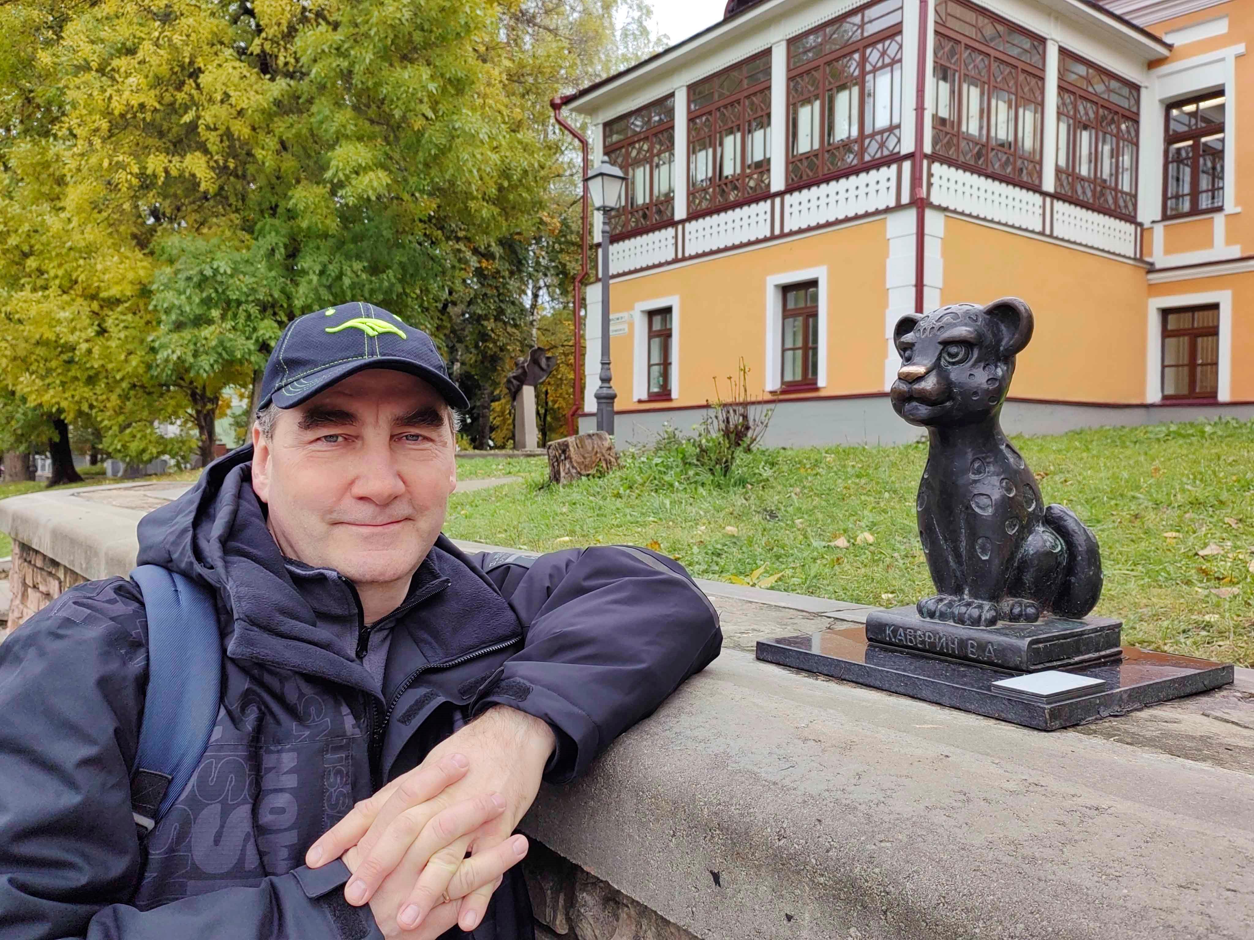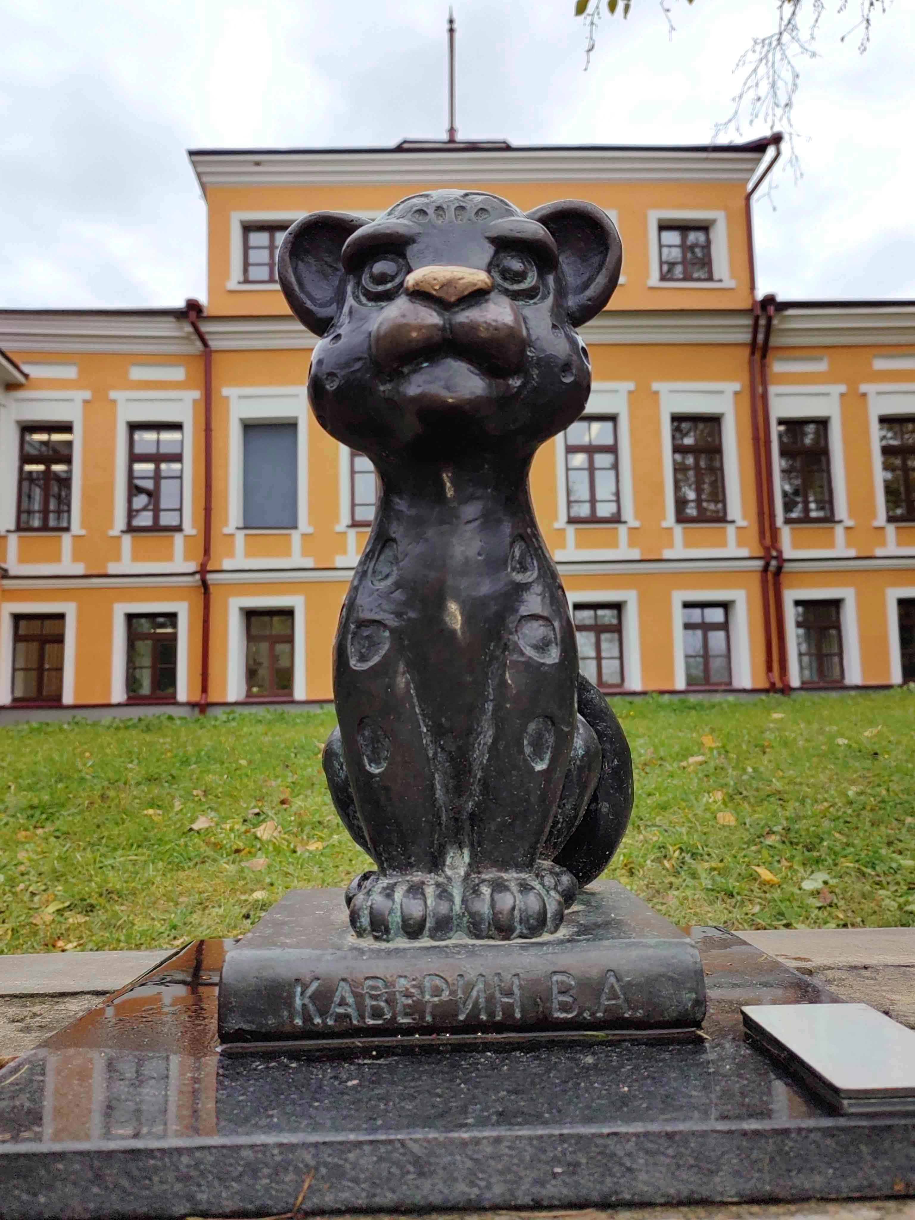 Прогулявшись по осеннему Пскову, который неизменно вызывает восхищение, я вновь оказался в центральном парке, в глубине которого наткнулся на крохотную скульптуру милого котяры с подписью «Каверин В.А». И поначалу, простите мою серость, решил, что это изображение любимого кота писателя. Тем более, что установлена скульптура в двух шагах от Библиотеки имени того самого Вениамина Каверина, автора «Двух капитанов», о которых мое поколение знает с детства.
