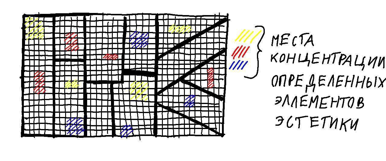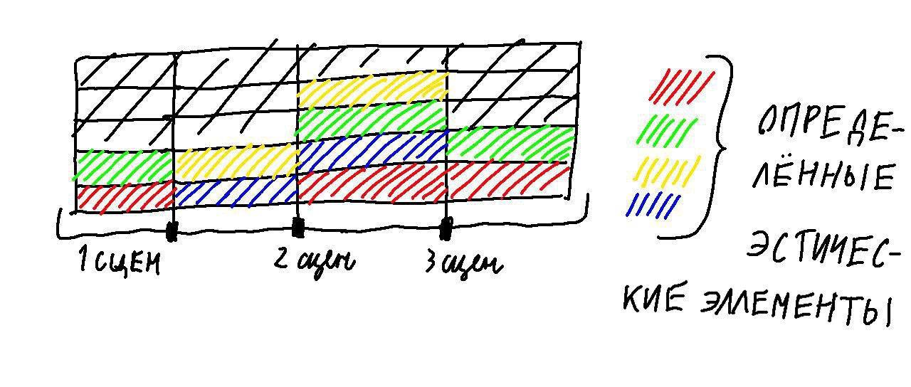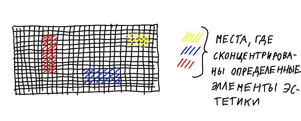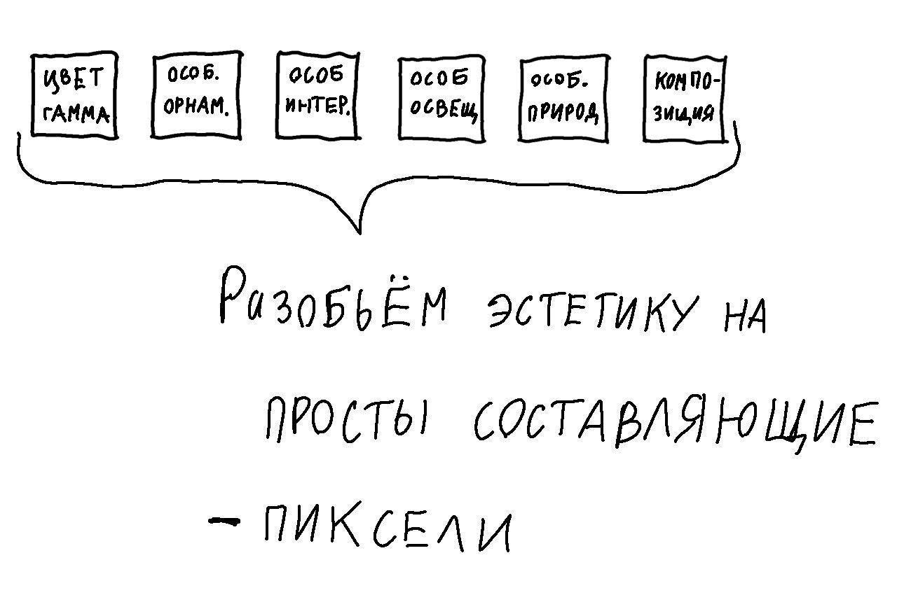Кино же состоит из череды картинок, меняющихся во времени, сцен, кадров. Каждый кадр можно рассматривать как столбец в некой таблице, составленный из пикселей, элементов той или иной эстетики, что в этой сцене проявились. И из набора таких столбцов, где проявлены те или иные элементы общей эстетики и рожается эстетика фильма в целом.
