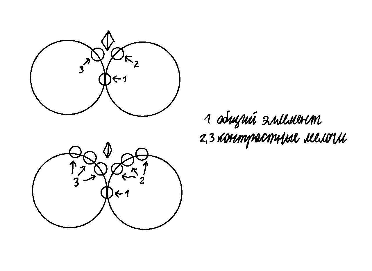 Что же до самих элементов, то их подборку я бы рассмотрел с помощью своих кругов, но использованных в ином контексте. В тех или иных элементах должно быть соединяющее их звено и набор элементов отзеркаливающих их. Отзеркаливаний может быть как много, так и совсем чуть-чуть.