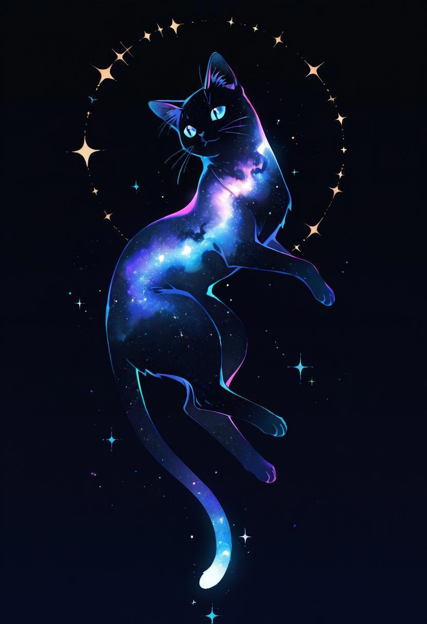masterpiece, best quality, simple illustration, 1cat, silhouette, full body, solo, dark background, sparkles, vivid colors, tail ,happy, no_outlines,no lineart, inner_galaxy, galaxy on silhouette,