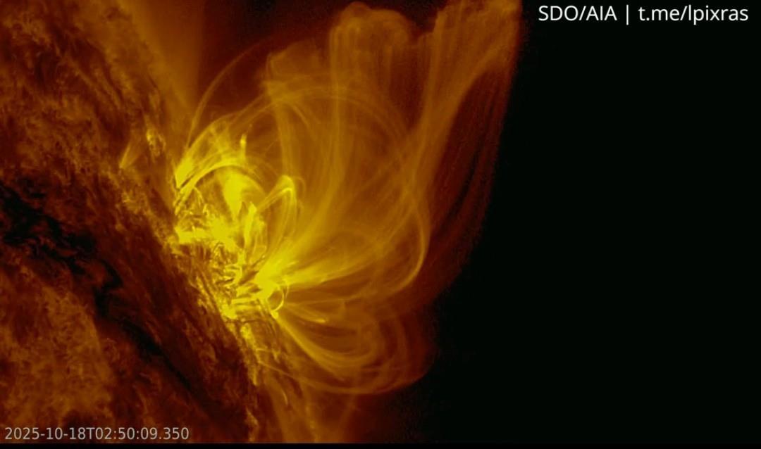 Видите, взрыв (не очень сильный, без выброса масс — петли закручиваются, плазма падает обратно на Солнце, не устремляясь в космос) произошел на правой стороне — очень красиво для съемки!