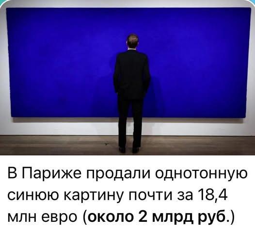 И нашелся же уникум альтернативно-одаренный, который выложил 18.4 млн евро и купил тупую синюю мазню размером два на четыре метра. Кажется, в Париже что-то сдохло или водичка из Сены приобрела интересные свойства помимо запаха дерьмократических свобод.