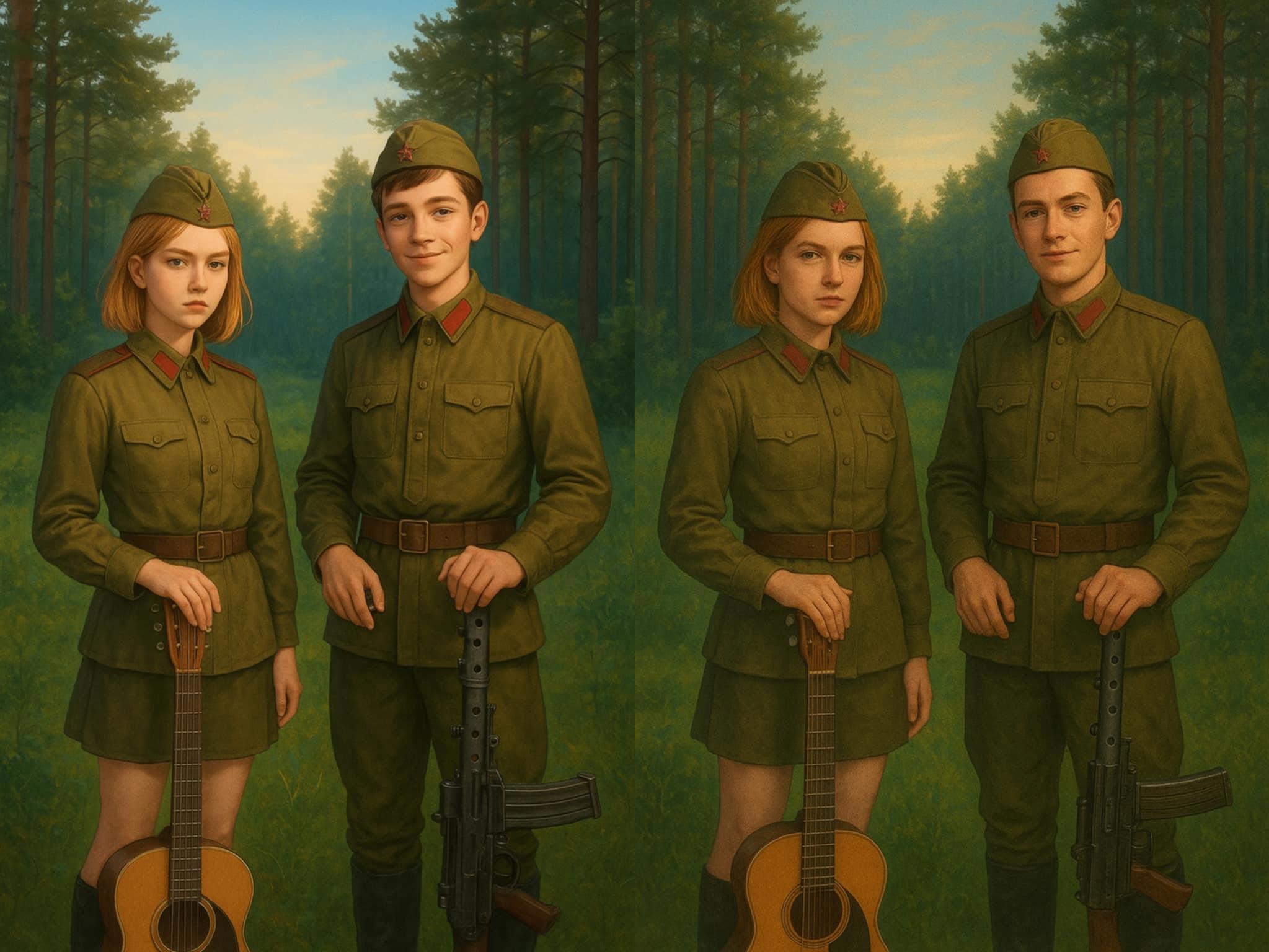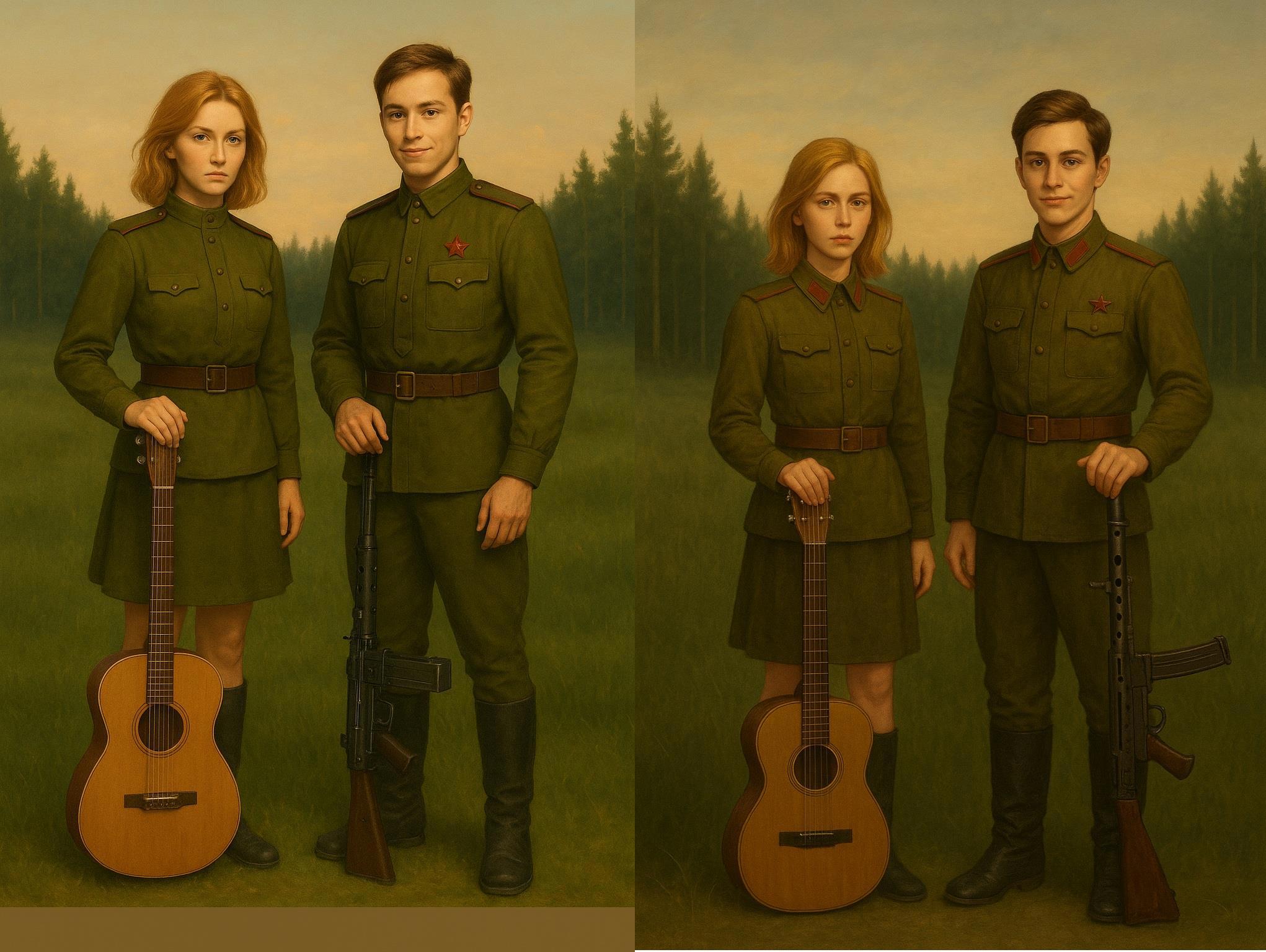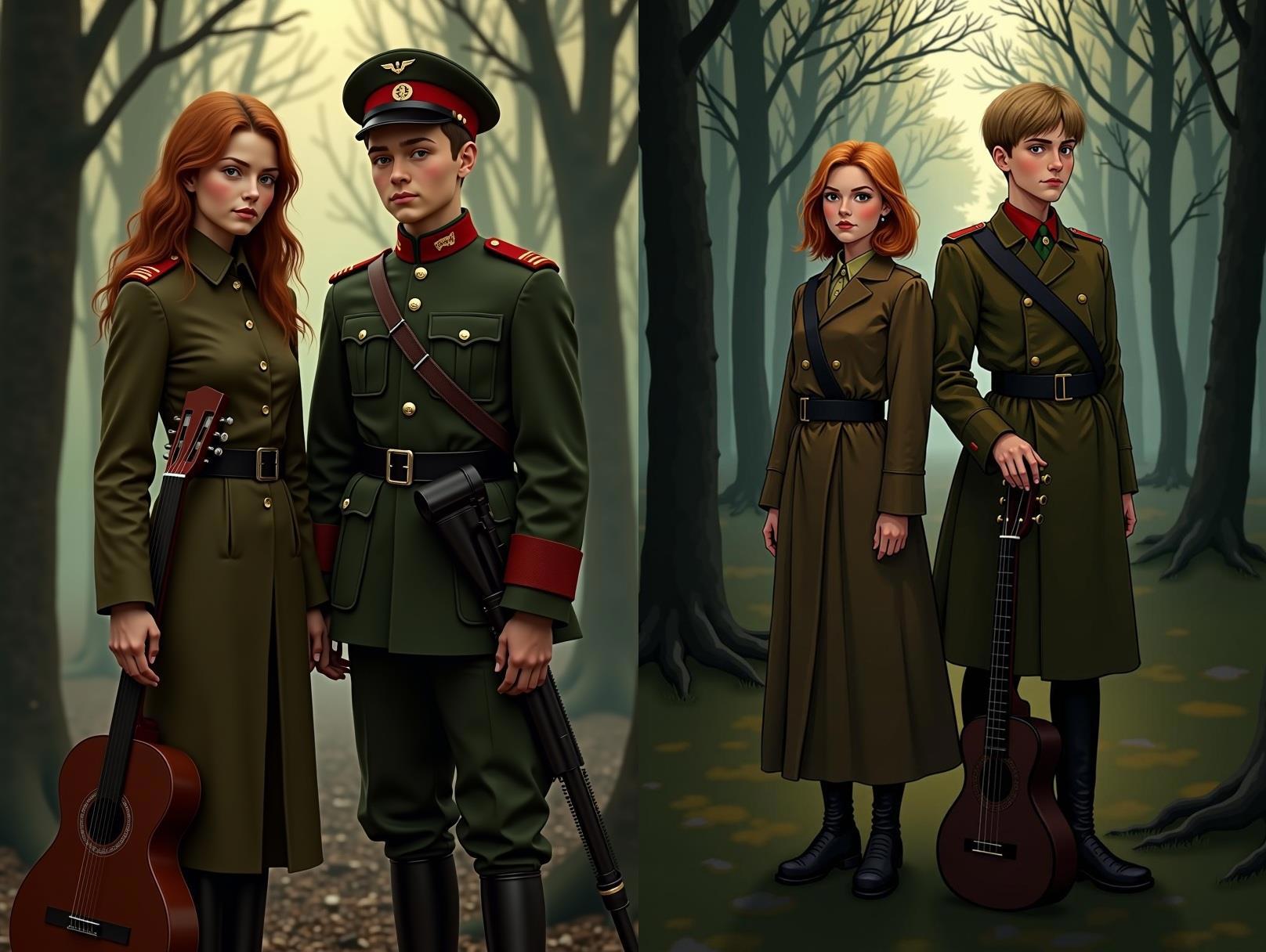 Слева героиня. Девушка — чуть рыжеватая блондинка (волосы до плеч, светлые, распущенные). Отдалённо напоминает героинь советского кино середины века. Только миниатюрнее стройнее и черты лица заострённее. Ближе к современным стандартам красоты, а не середины двадцатого века. Одета в женскую форму младшего командира РККА. Стоит опираясь на простую шестиструнную гитару. Смотрит немного хмурясь или свысока. На вид лет 20-21.