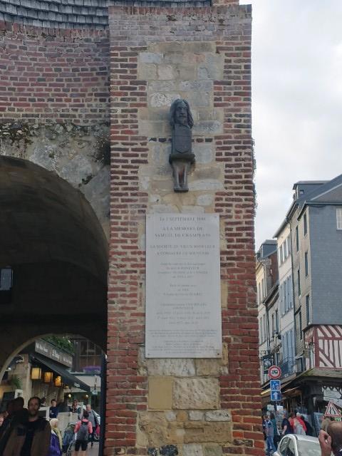Эта мемориальная доска была открыта мэром Онфлера, мэром Квебека и послом Канады во Франции 21 мая 1963 года по случаю 355-й годовщины основания Квебека. Почему такая некруглая дата? не 350 и не 400? Что это там у Шамплена внизу? Две собачьи лапы?