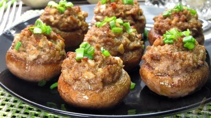 Я обычно покупаю в магазине шампиньоны и фарш в пачке, сыра тру грамм 200, сметаны добавляю ложки 4. Запихнуть всё это в шляпки не просто, но удаётся.