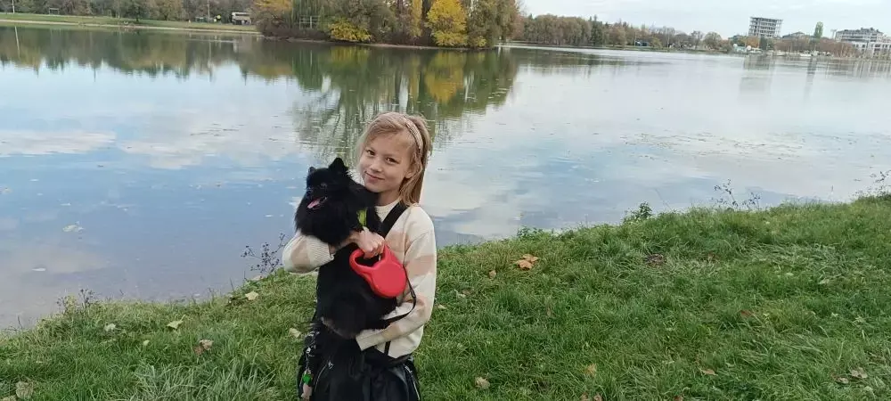 Взяли с собой на прогулку собаку и пошли вокруг озера. В будний день здесь немного народу. А то с ней чревато гулять. С нами злой шпиц, который охраняет нас ото всех.