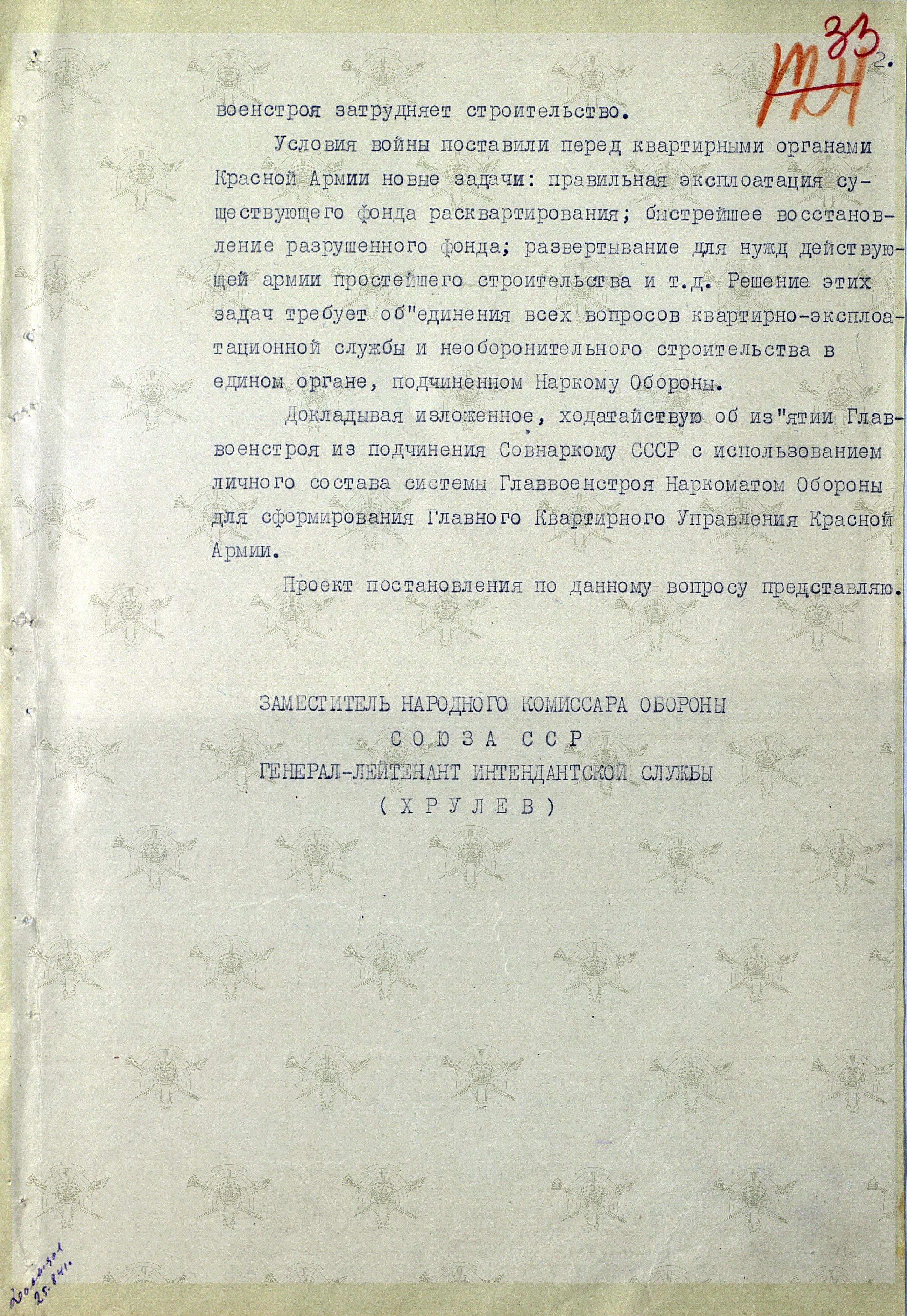 Для исключения срывов в строительстве, исключения двойственного подчинения, улучшения качества строящихся объектов, начальник Тыла Красной Армии генерал-лейтенант инт. службы А. В. Хрулёв предложил изъять Главвоенстрой из подчинения СНК СССР, с передачей всей системы в ведение Наркома обороны СССР.