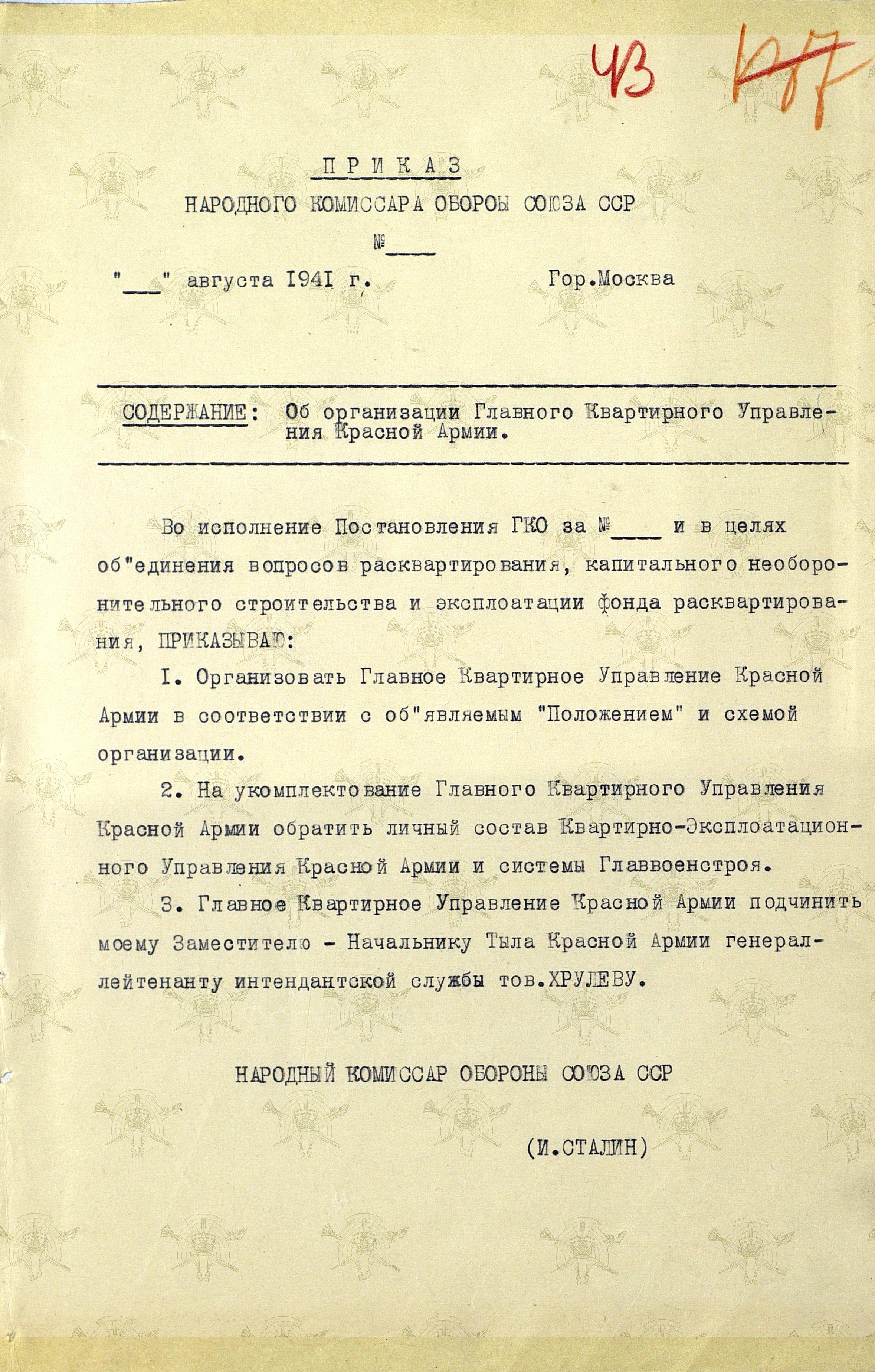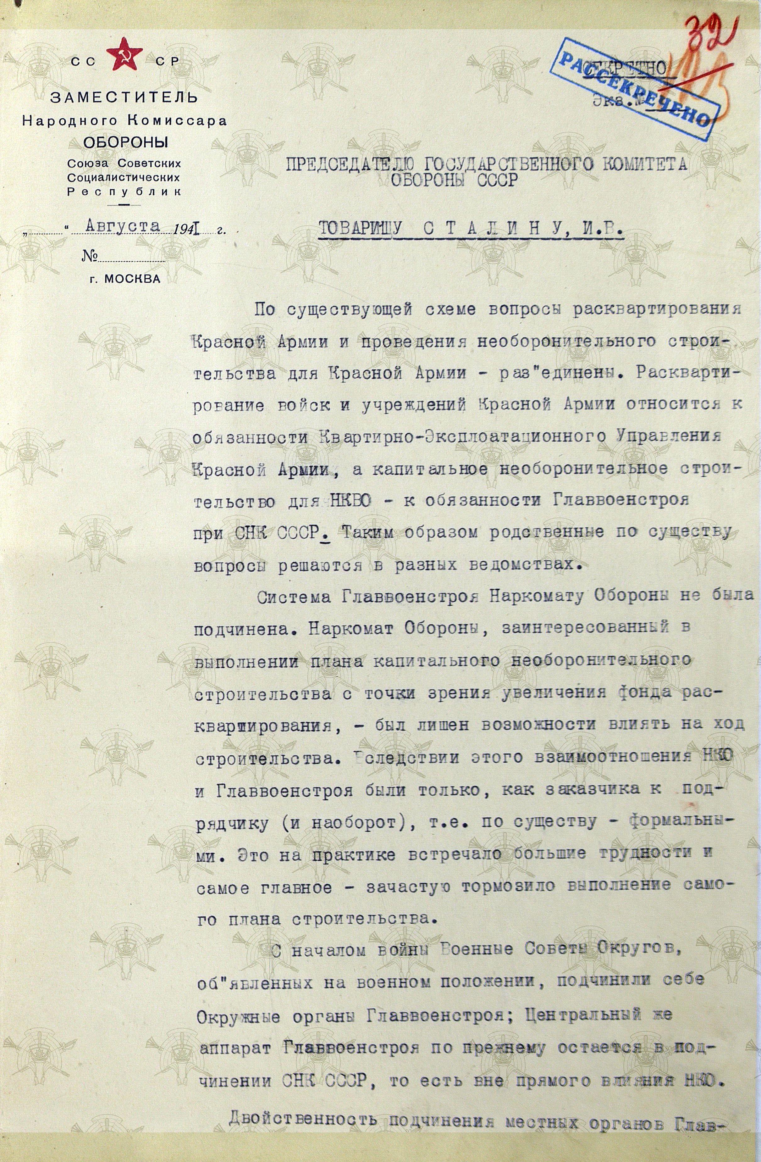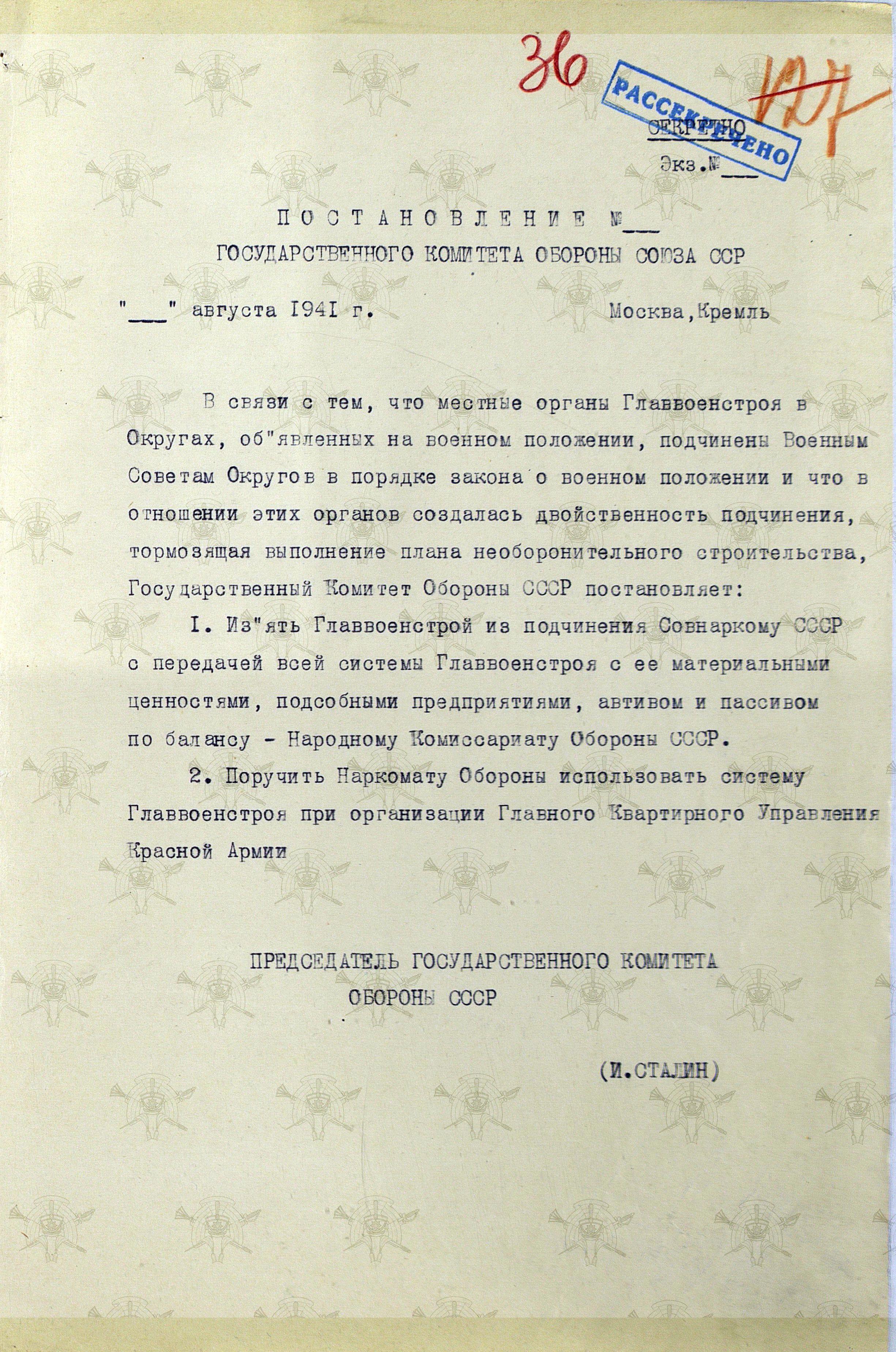 Но, ни постановление ГКО, ни приказ Наркома обороны И. В. Сталин так и не подписал. На одном из сайтов, посвященных деятельности квартирно-эксплуатационной службы встретилась только такая информация: «Распоряжением СНК СССР от 11 августа 1941 г. строительные организации Главвоенпромстроя на Дальневосточном фронте и в Забайкальском военном округе были переданы Народному комиссариату обороны СССР и приняты комиссиями от КЭУ ГИУ КА.»