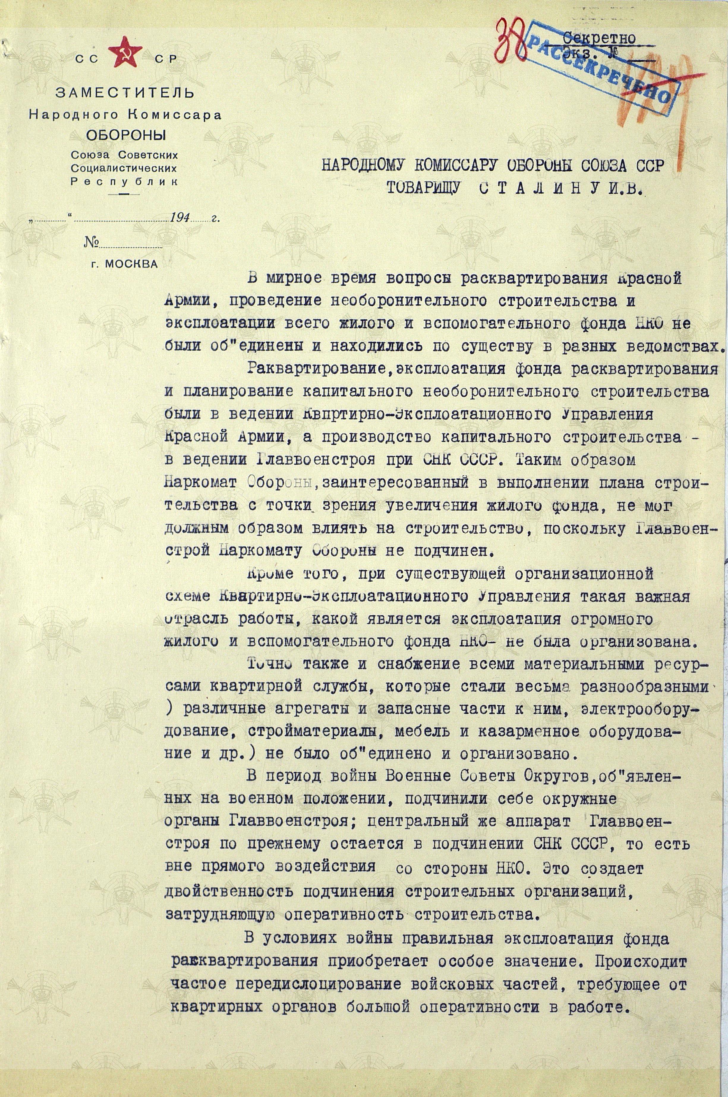 Но, дабы заметка не перешла в разряд «самопиара», предлагаю ознакомиться с комплектом документов, подготовленных Штабом Главного Управления Тыла Красной Армии и посвящённым вопросам расквартирования Красной Армии проведению необоронительного строительства, эксплуатации жилого и вспомогательного фонда Красной Армии. В чём была необходимость издания таких значимых документов, как постановление Государственного Комитете Обороны СССР и приказа Наркома обороны СССР? Дело в том, что до войны, работы по капитальному строительству находились в ведении Главвоенстроя при Совете Народных Комиссаров СССР, а за расквартирование, эксплуатацию жилого и вспомогательного фонда и даже планирование отвечало КЭУ ГИУ Красной Армии.