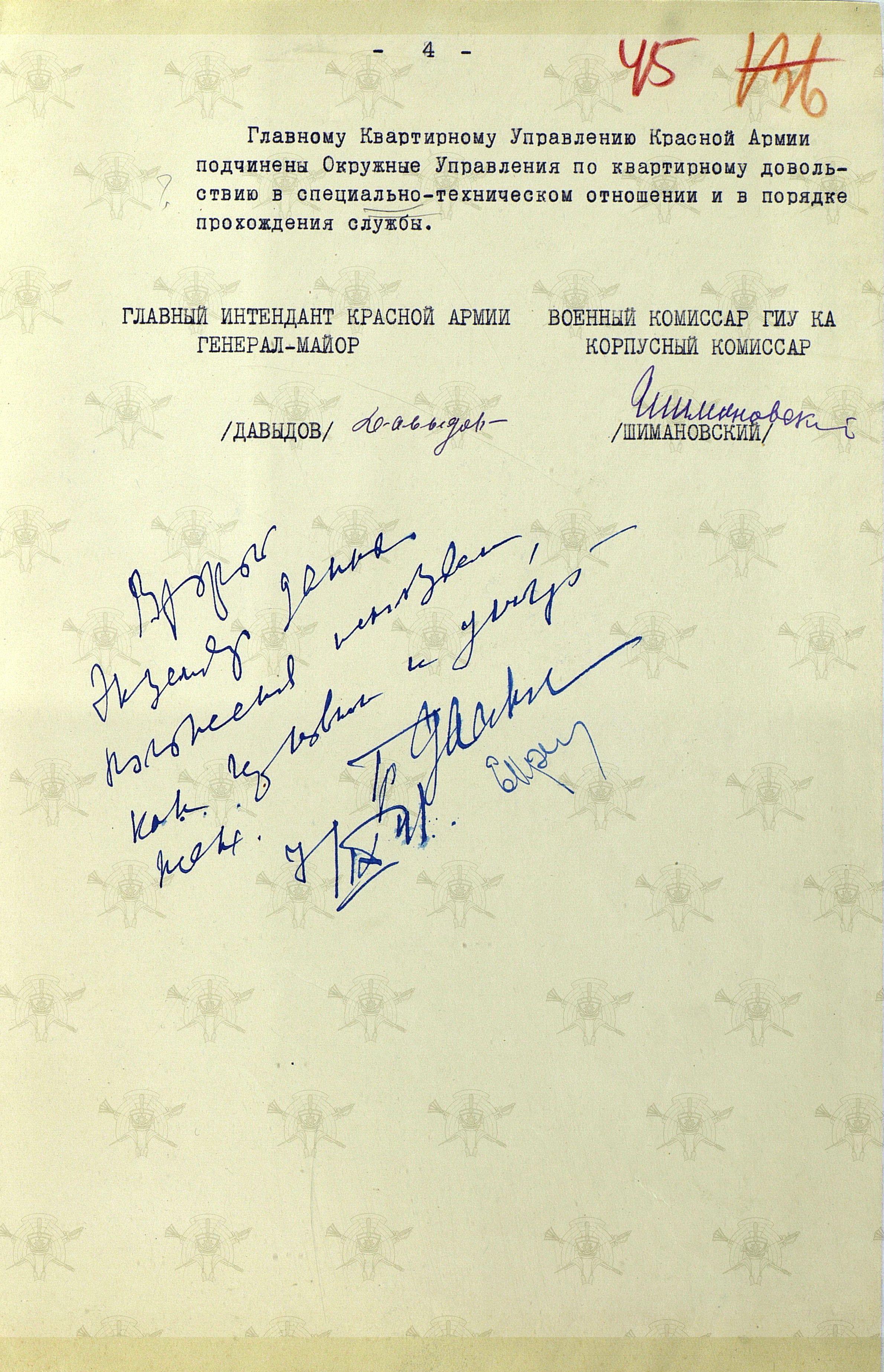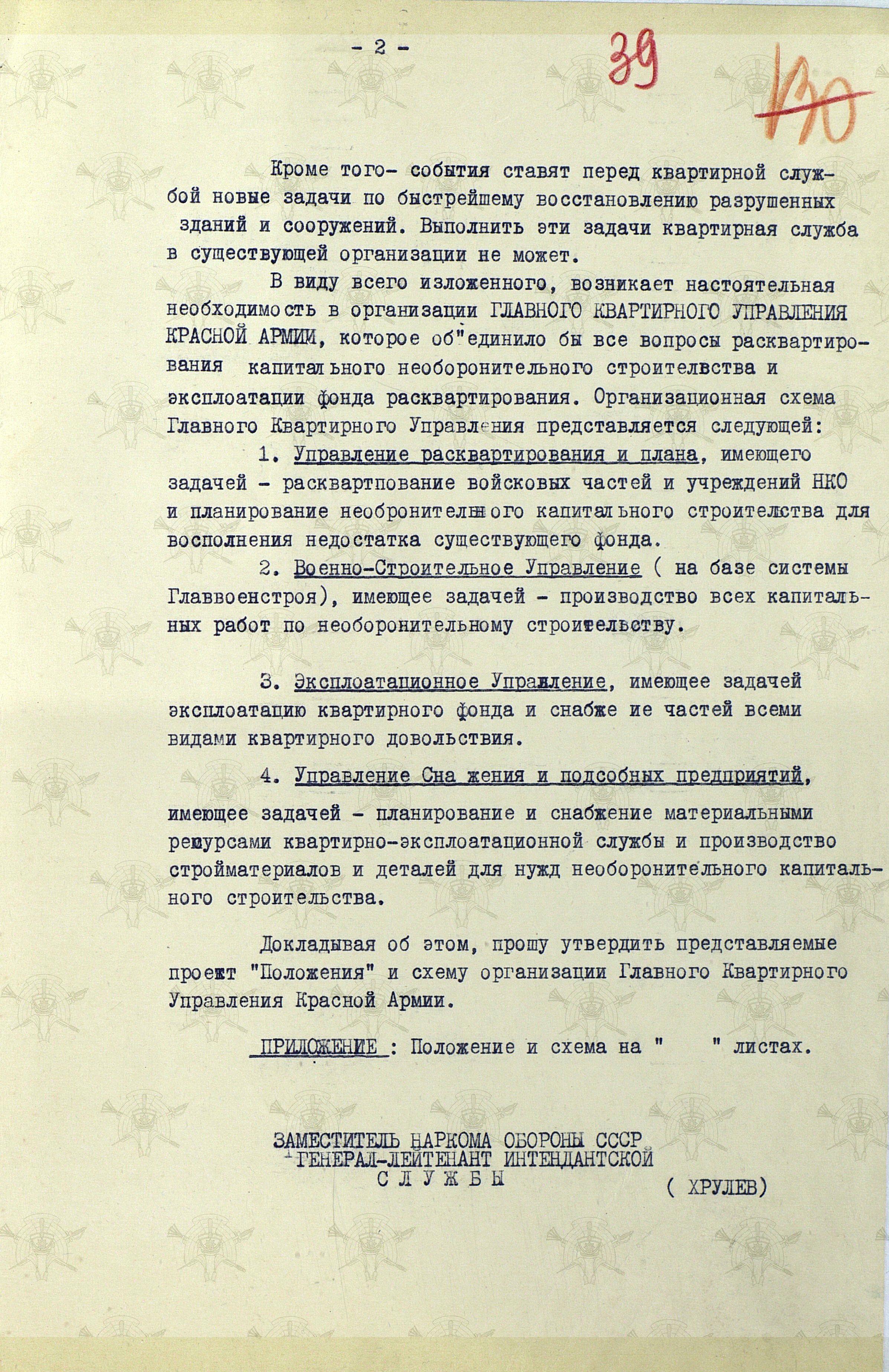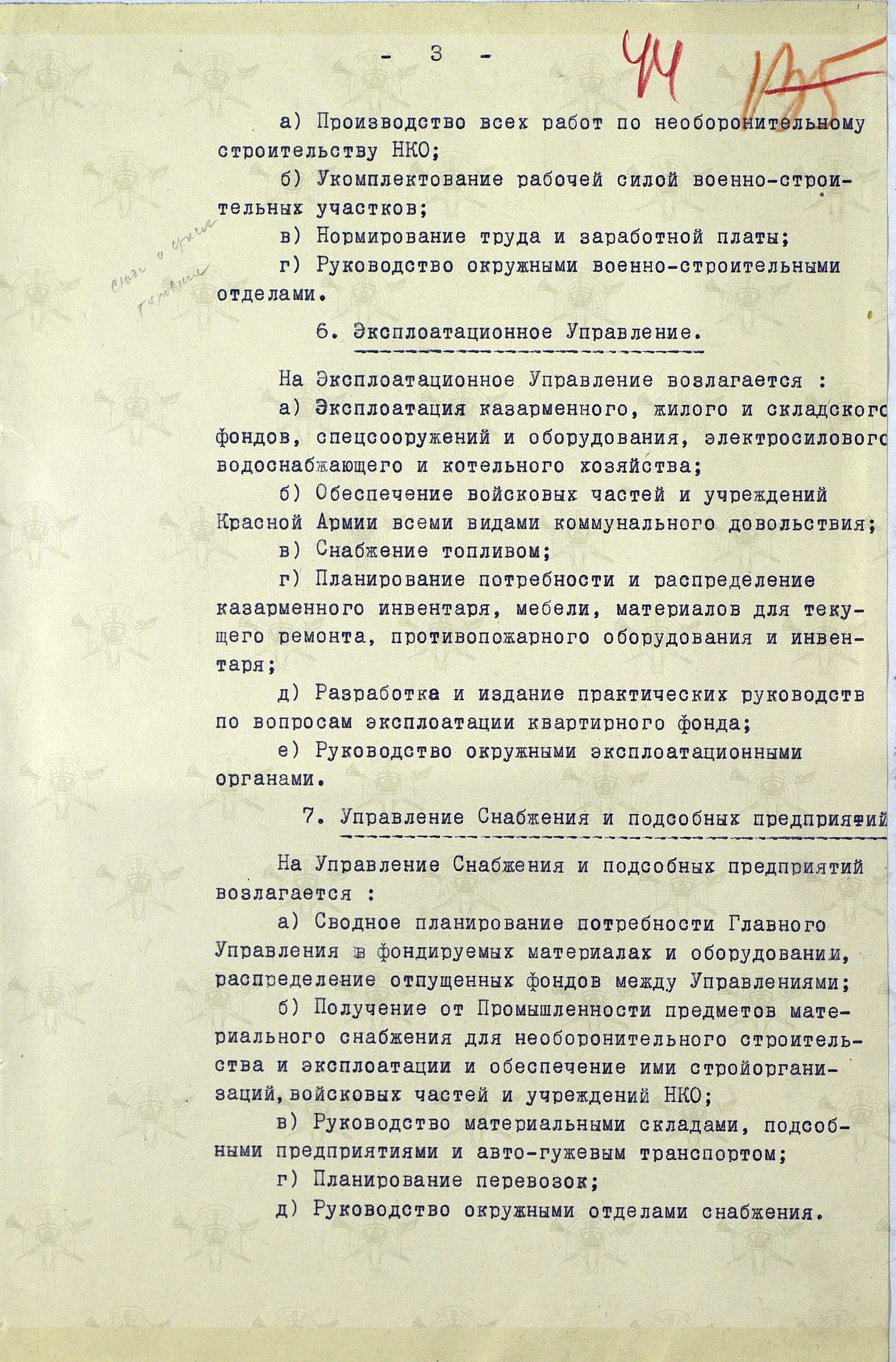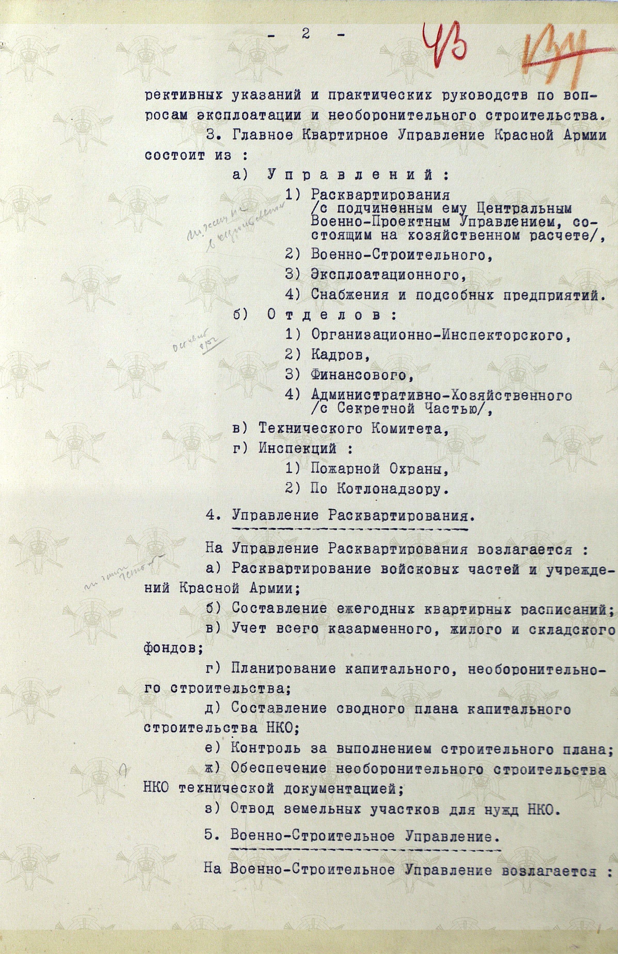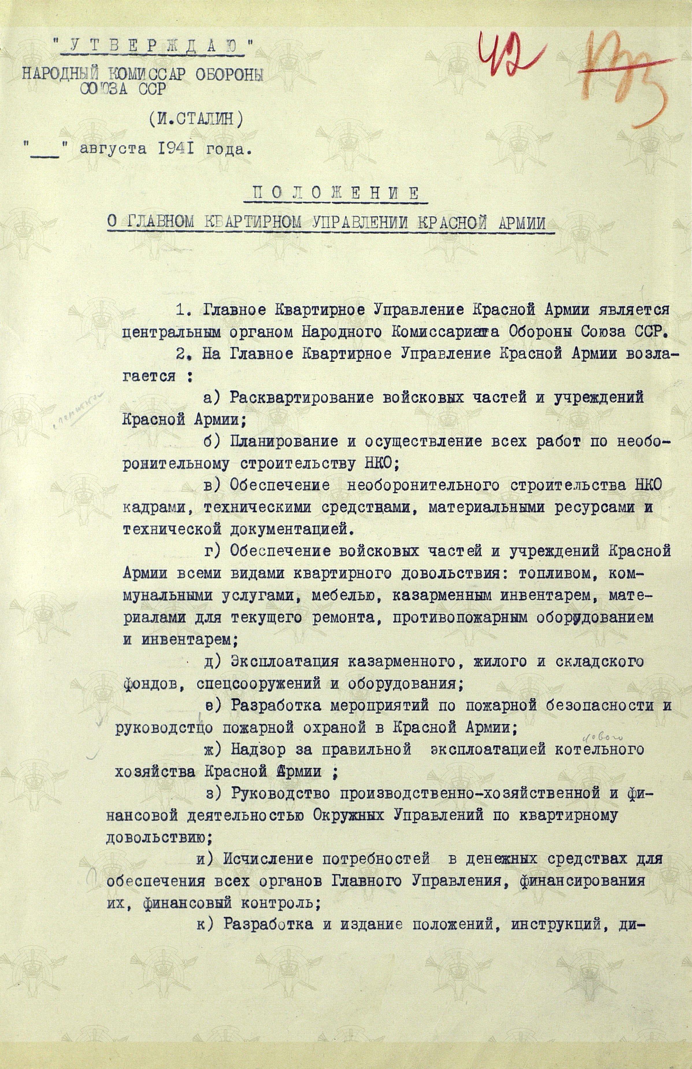 А так как, передача строительного ведомства влекла за собой изменения и в функционале КЭУ ГИУ КА, то Штабом Главного Управления Тыла Красной Армии был разработан приказ Наркома обороны СССР «Положение о Главном Квартирном Управлении Красной Армии»: