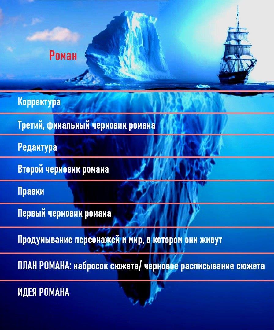 Автор: Андрей ЩегловКак-то попалась на глаза картинка с «айсбергом творчества», где было всего пять пунктов по написанию романа (в частности). Улыбнули эти пункты и решил нарисовать свой «айсберг» — исключительно тезисно, без углубления (если что-то упустил — буду рад, если поправите/дополните).