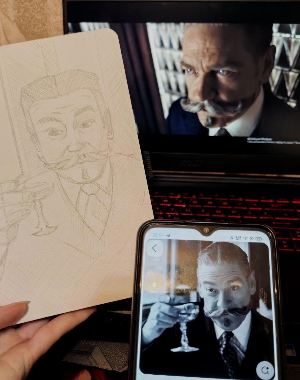 Пока работа с текстами не прекращается, но творчество требует того, чтобы хоть как-то находить выход. Так или иначе, пока месье Пуаро раскрывал убийство в восточном экспрессе, я же пыталась раскрыть все детали на кадре из фильма. Вроде даже похоже получилось, но не со 100% точностью.