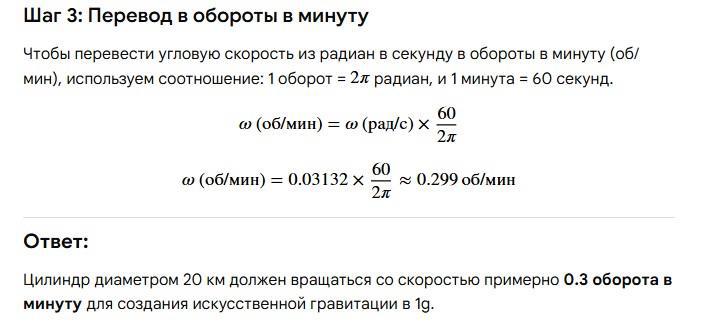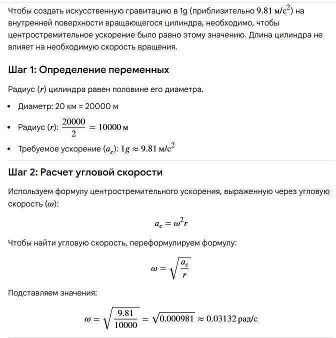 Спросил у ИИ с какой скоростью надо вращать стокилометровый цилиндр в космосе, диаметр которого составляет двадцать километров, чтобы создать гравитацию 1g?