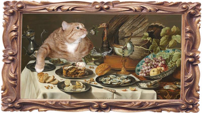 Но миссис Хадсон, художник выразил свое восхищение и подарил ей эту самую картину. Ибо, по его словам, только эта милая Леди, хоть что то, поняла в его искусстве. А миссис Хадсон, продала эту картину за двести гиней и купила картину Питера Класа "Натюрморт с Котом, интересующимся пирогом с индейкой", который повесила в своей столовой. А Холмс и Ватсон, прозвали этот натюрморт - "Кот ловящий колибри".