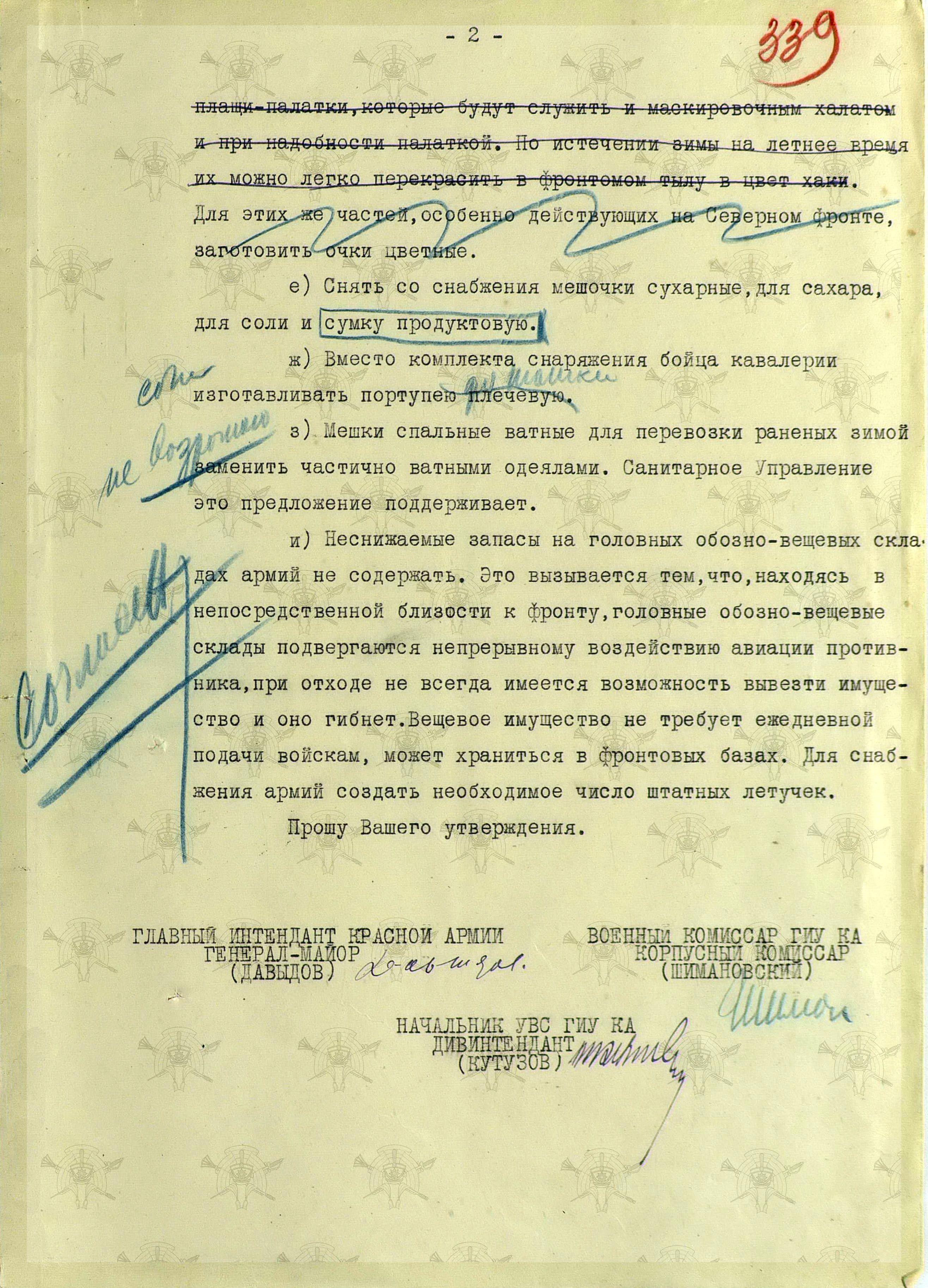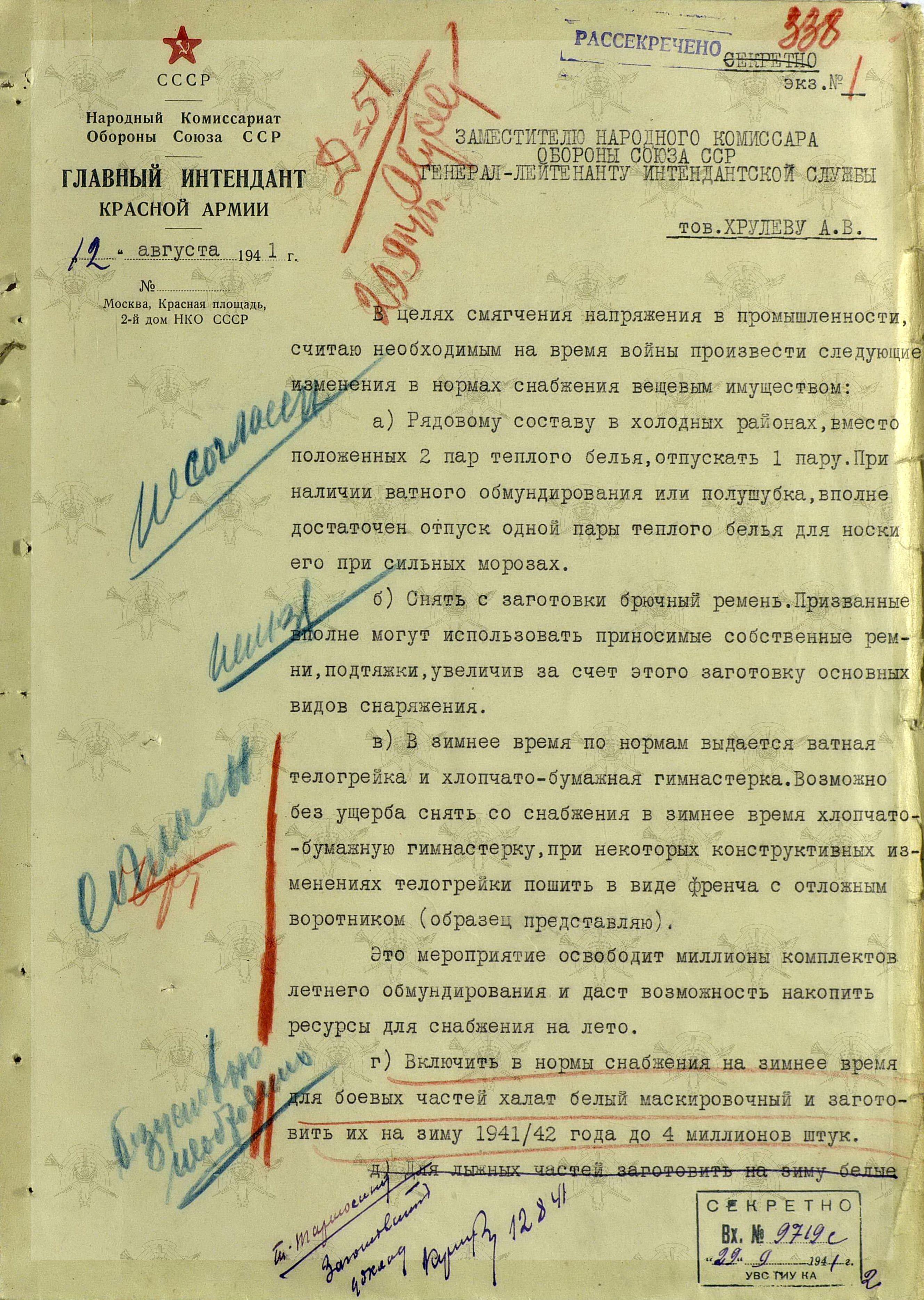 Вопросы изменения норм снабжения появились задолго до зимы. Один из докладов Главного Интенданта Красной Армии генерал-майора П.Д. Давыдова на имя заместителя Наркома обороны СССР генерал-лейтенанта инт. сл. А.В. Хрулёва, как раз и содержит такие предложения: