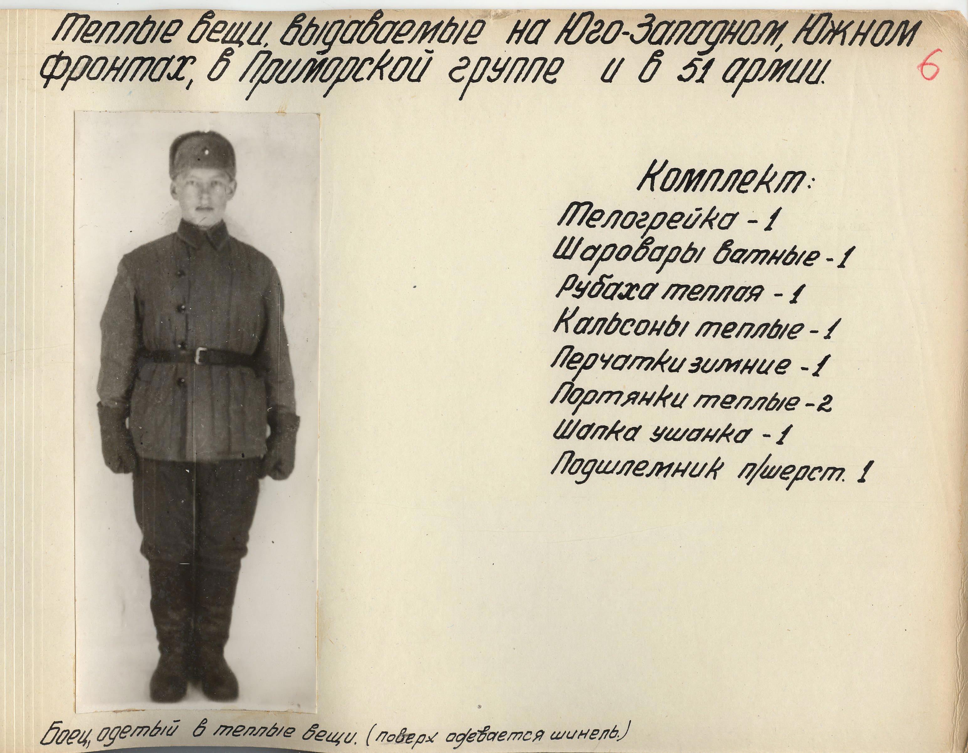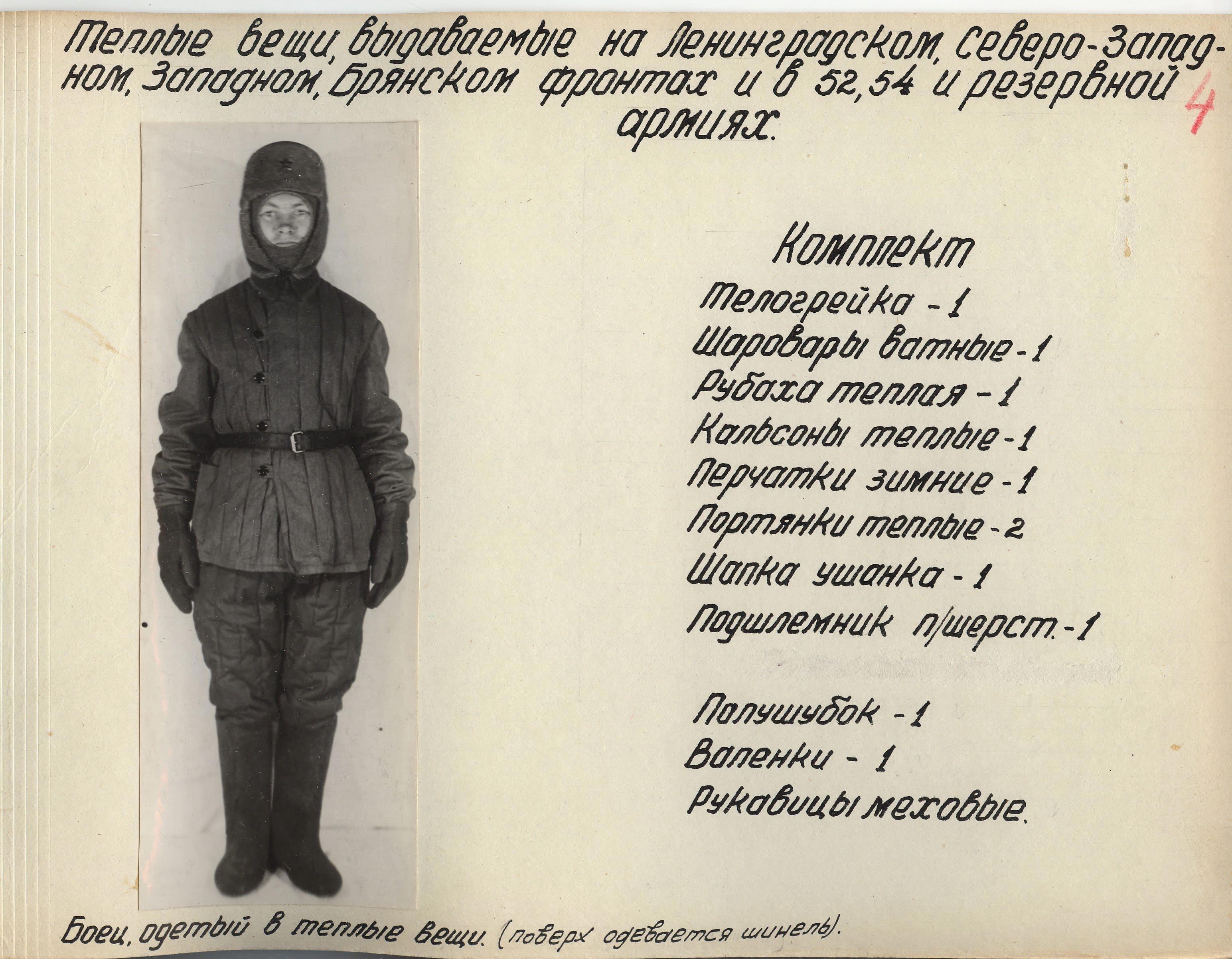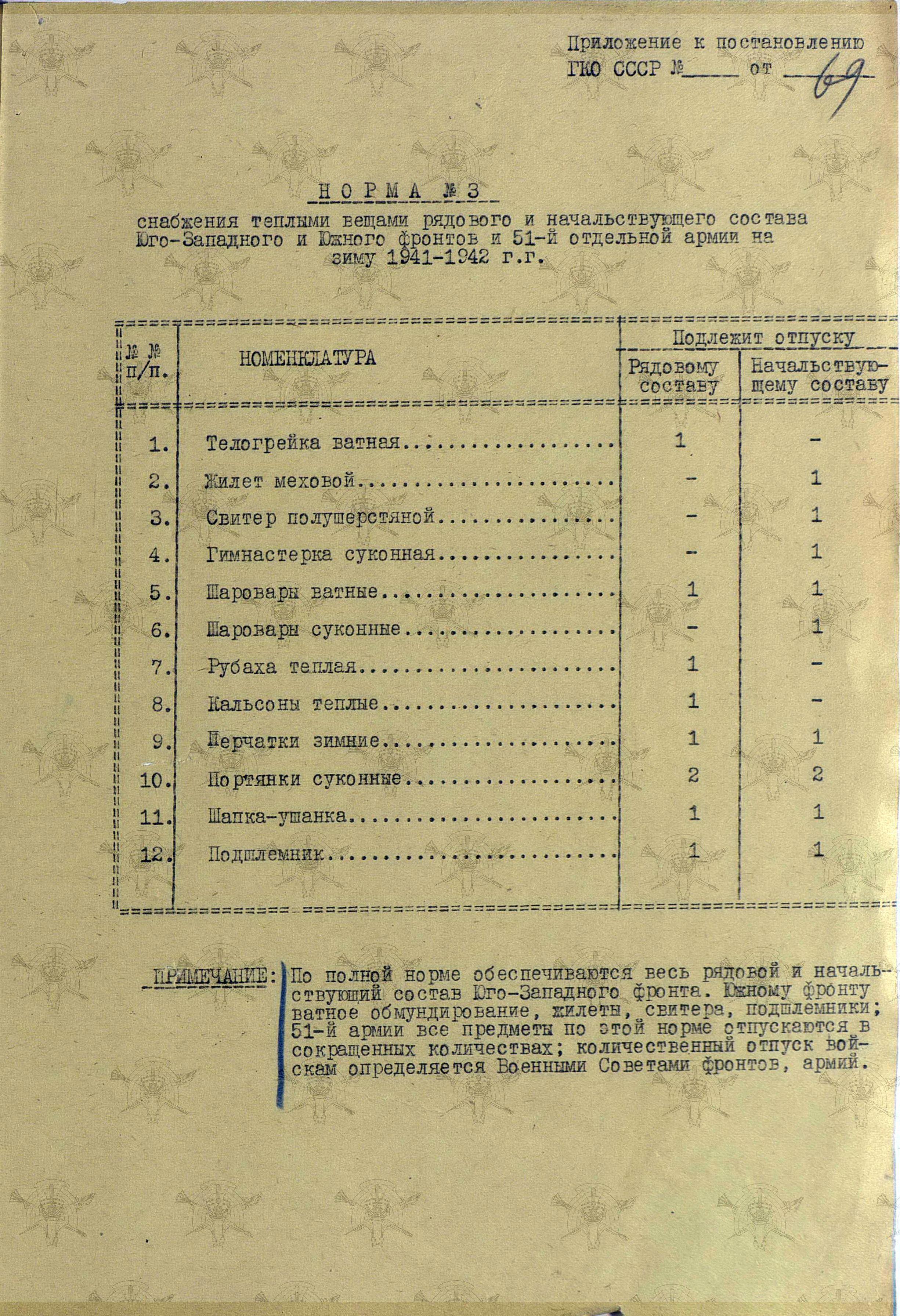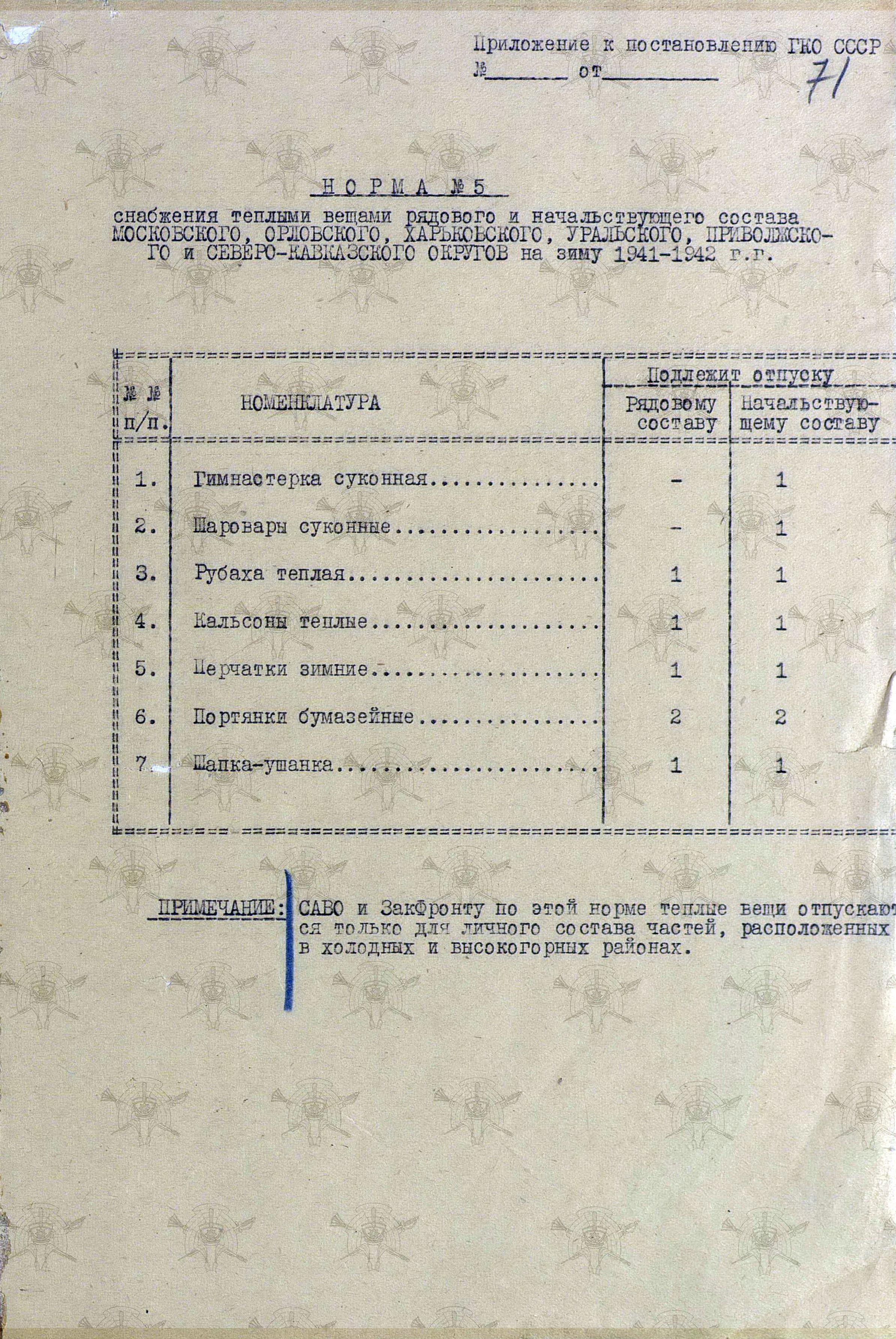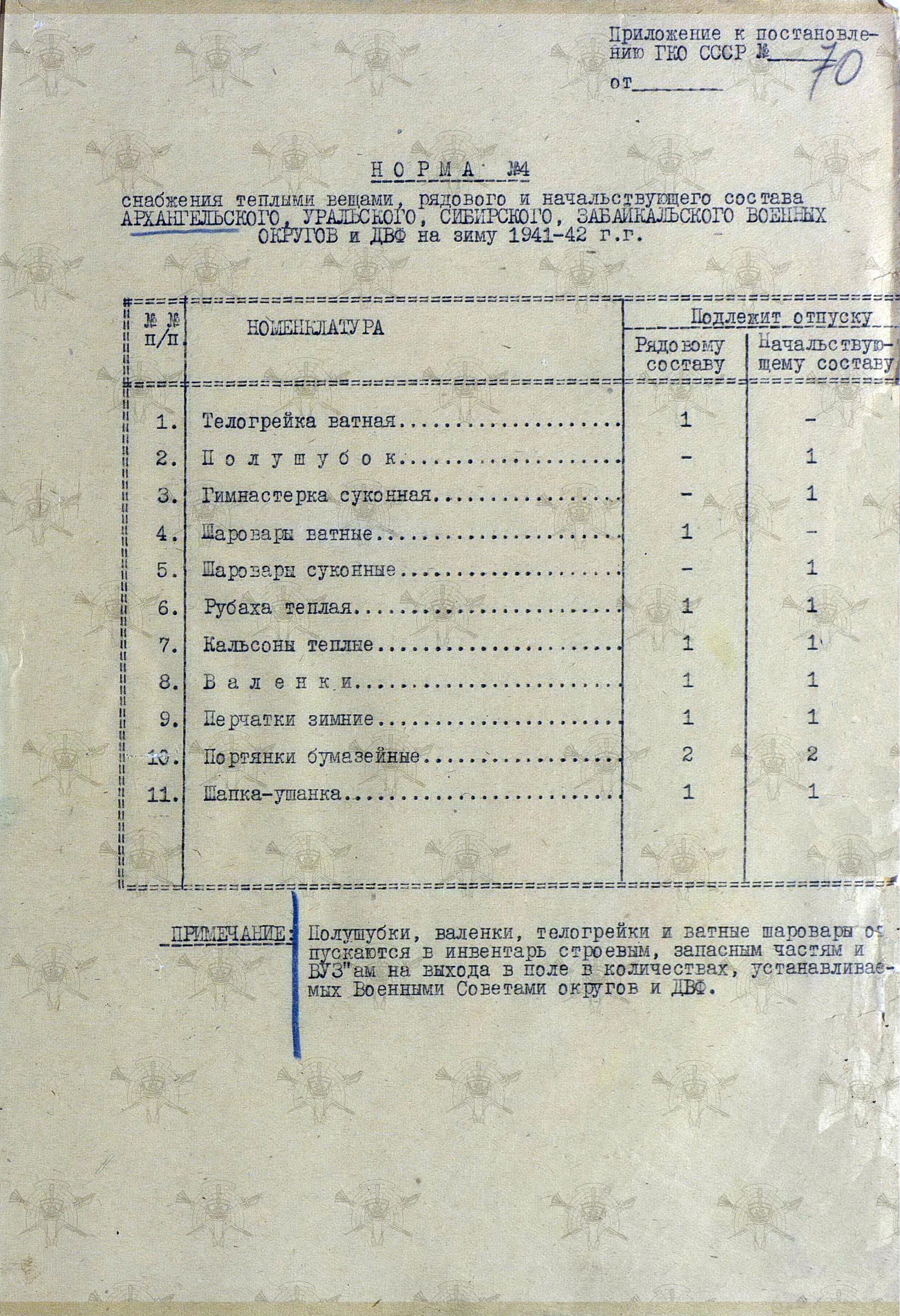 «Во время войны теплые вещи отпускались по особым нормам, которые утверждались ежегодно Государственным Комитетом Обороны. Нормы теплых вещей, объявленные в приказе НКО СССР № 145-42г. оказались практически не приемлемыми, вследствие разнообразных климатических условий и погоды для каждого фронта. Нормы отпуска теплых вещей по годам снабжения приведены в приложении № 10.».