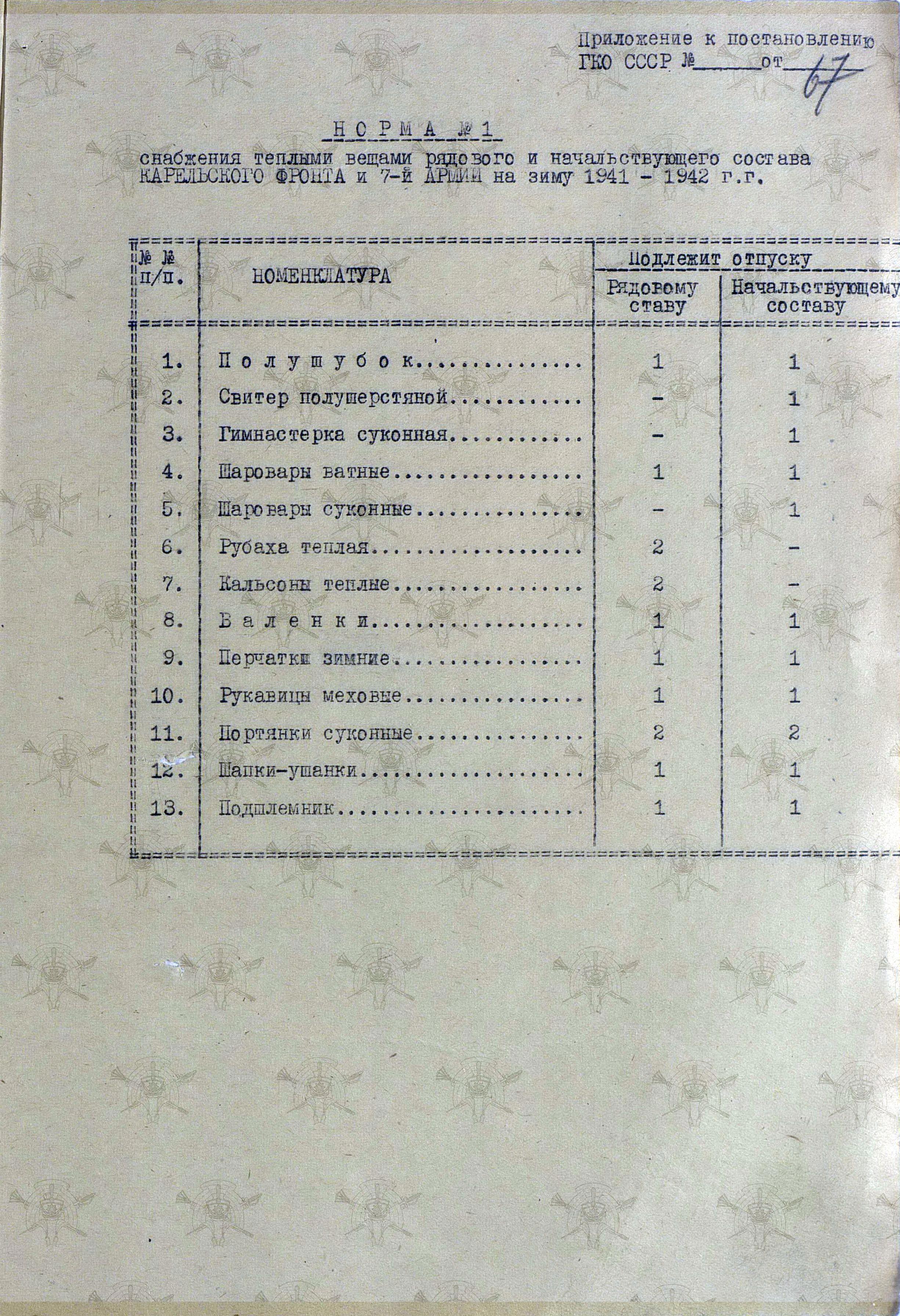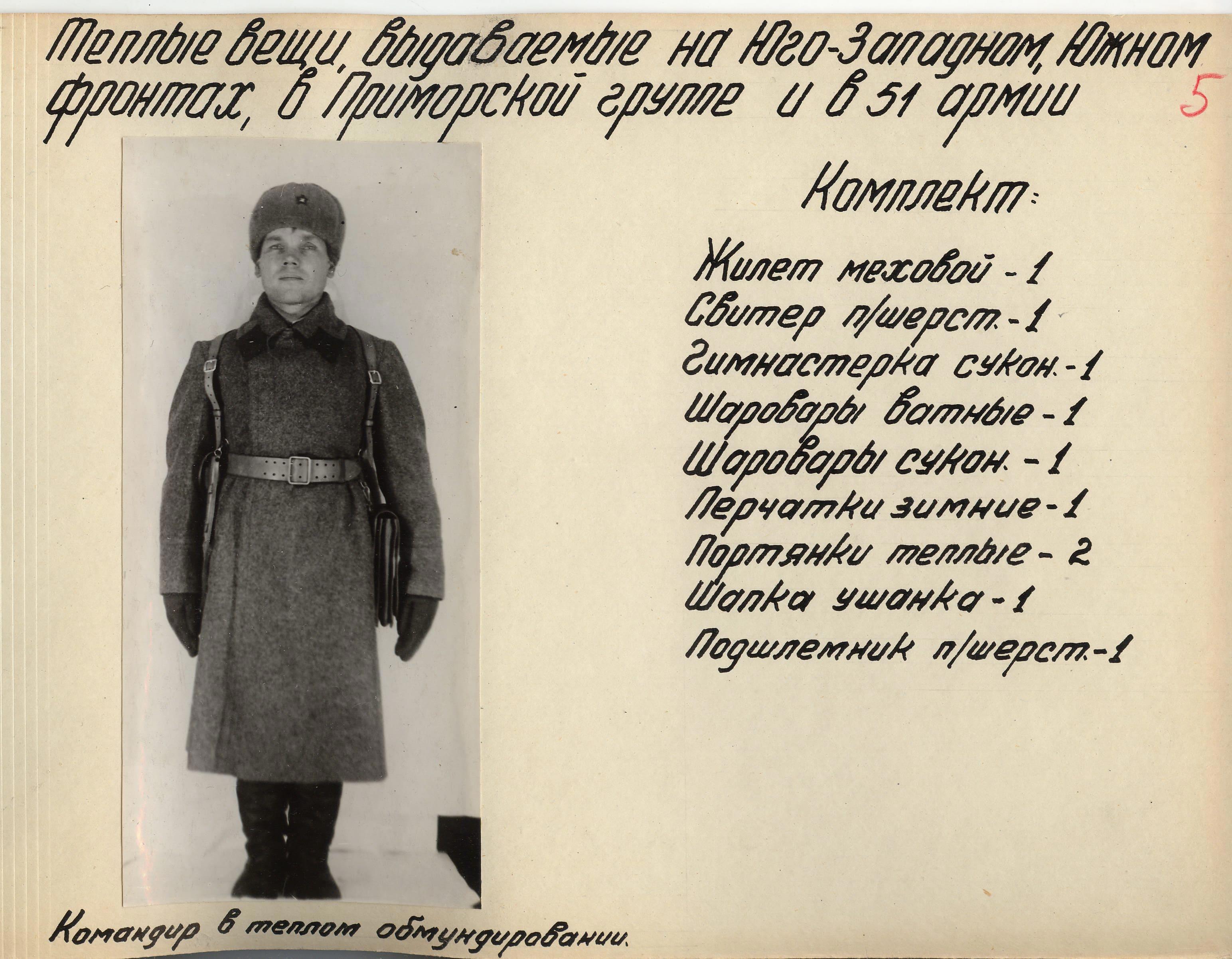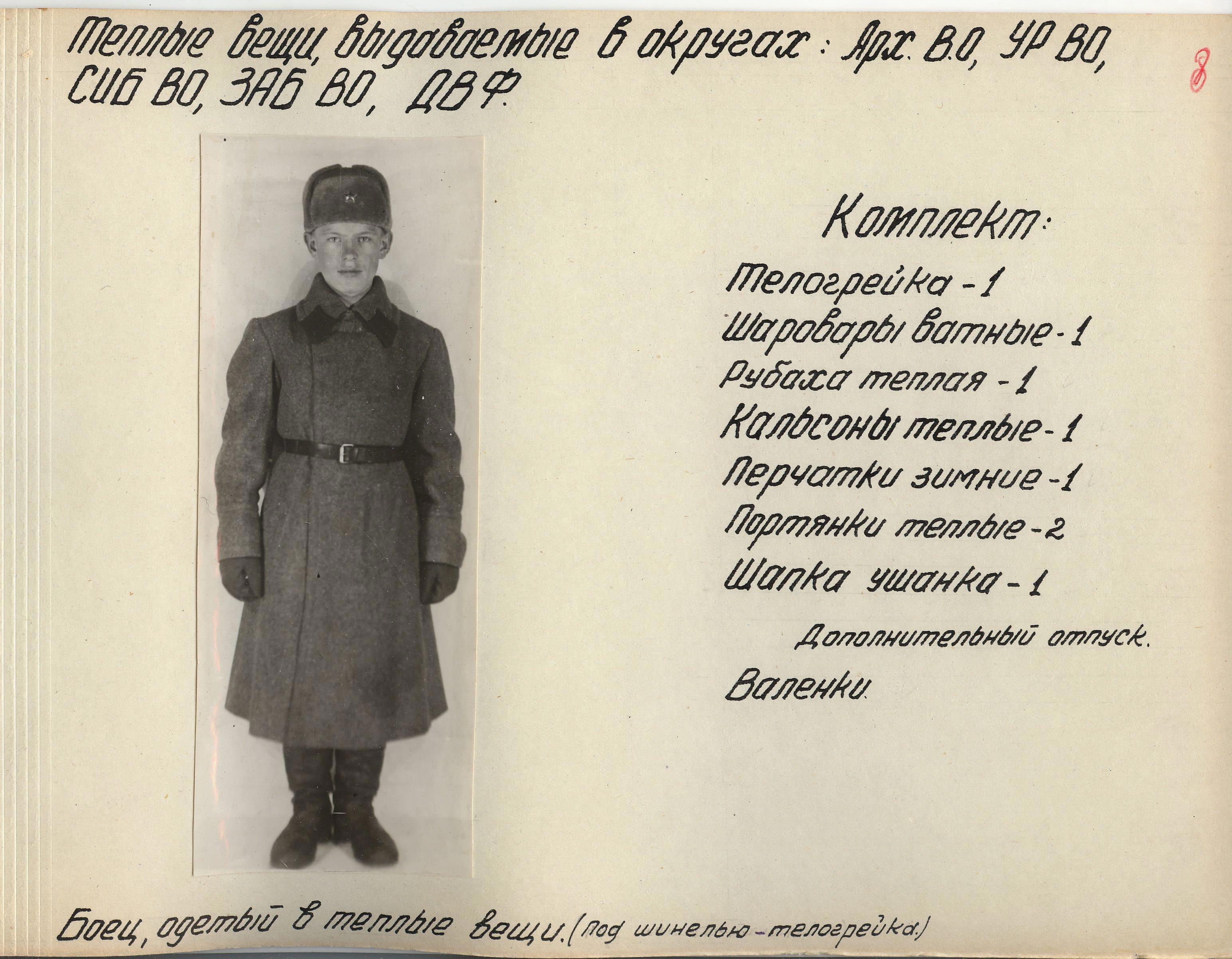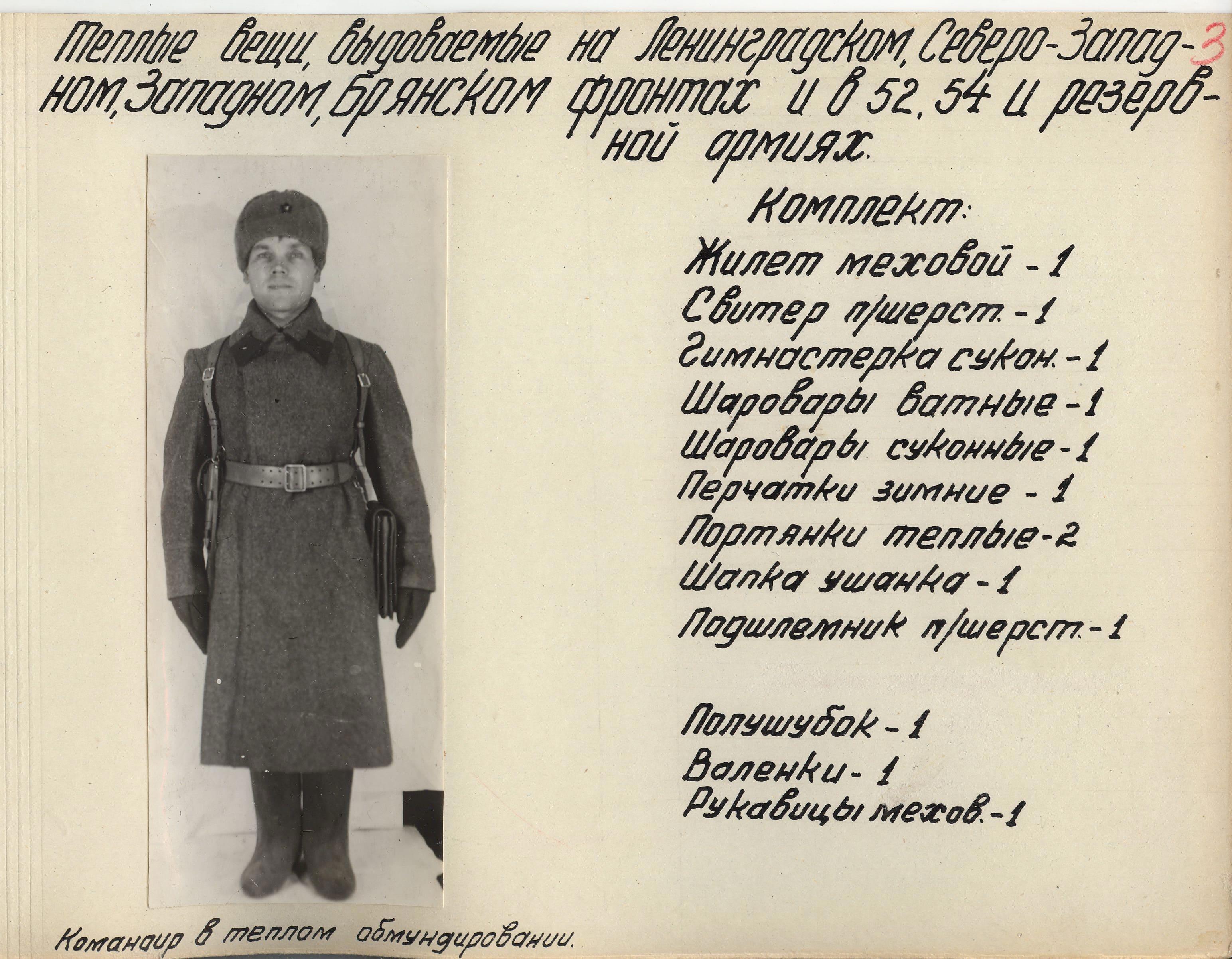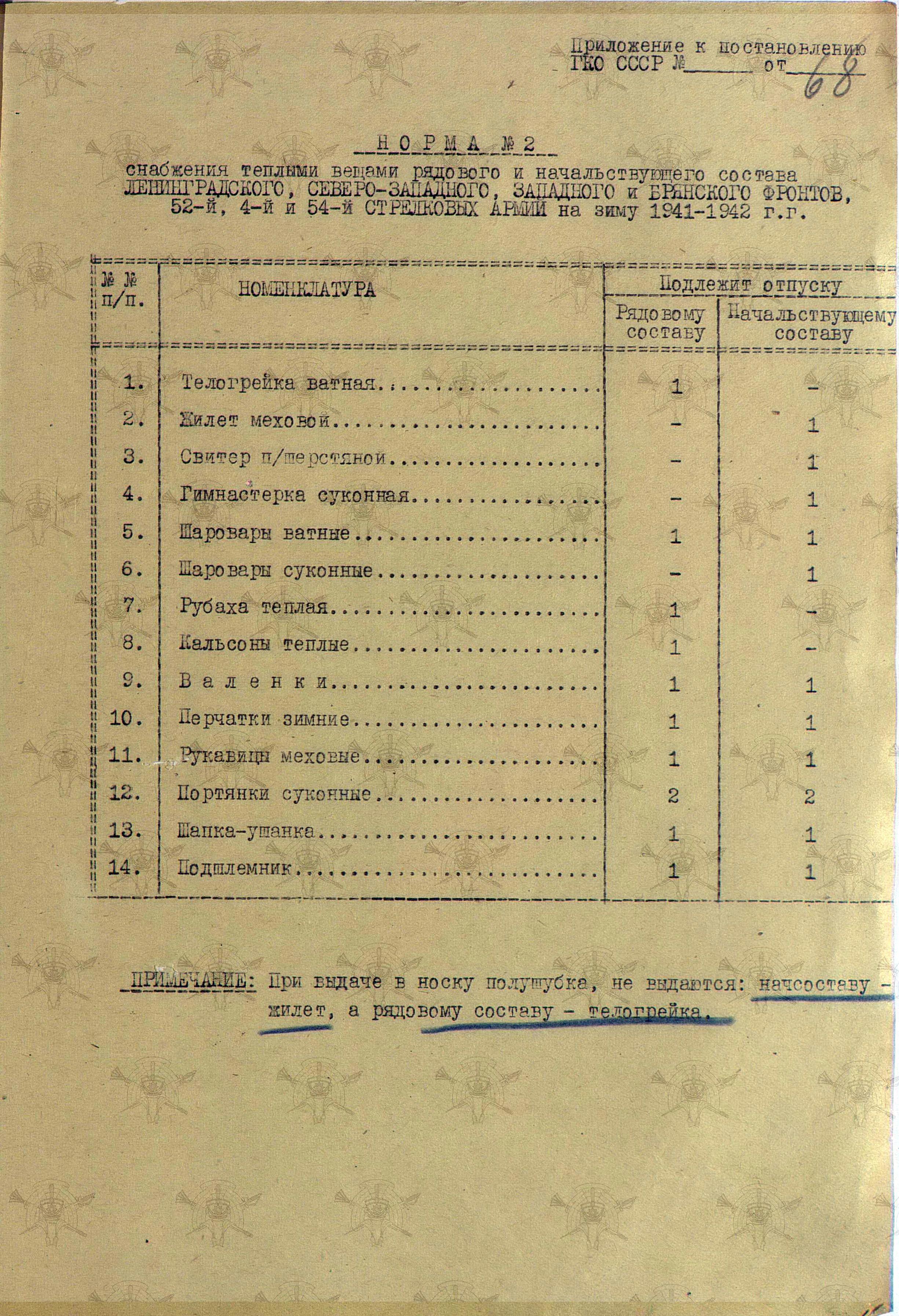 «Во время войны теплые вещи отпускались по особым нормам, которые утверждались ежегодно Государственным Комитетом Обороны. Нормы теплых вещей, объявленные в приказе НКО СССР № 145-42г. оказались практически не приемлемыми, вследствие разнообразных климатических условий и погоды для каждого фронта. Нормы отпуска теплых вещей по годам снабжения приведены в приложении № 10.».