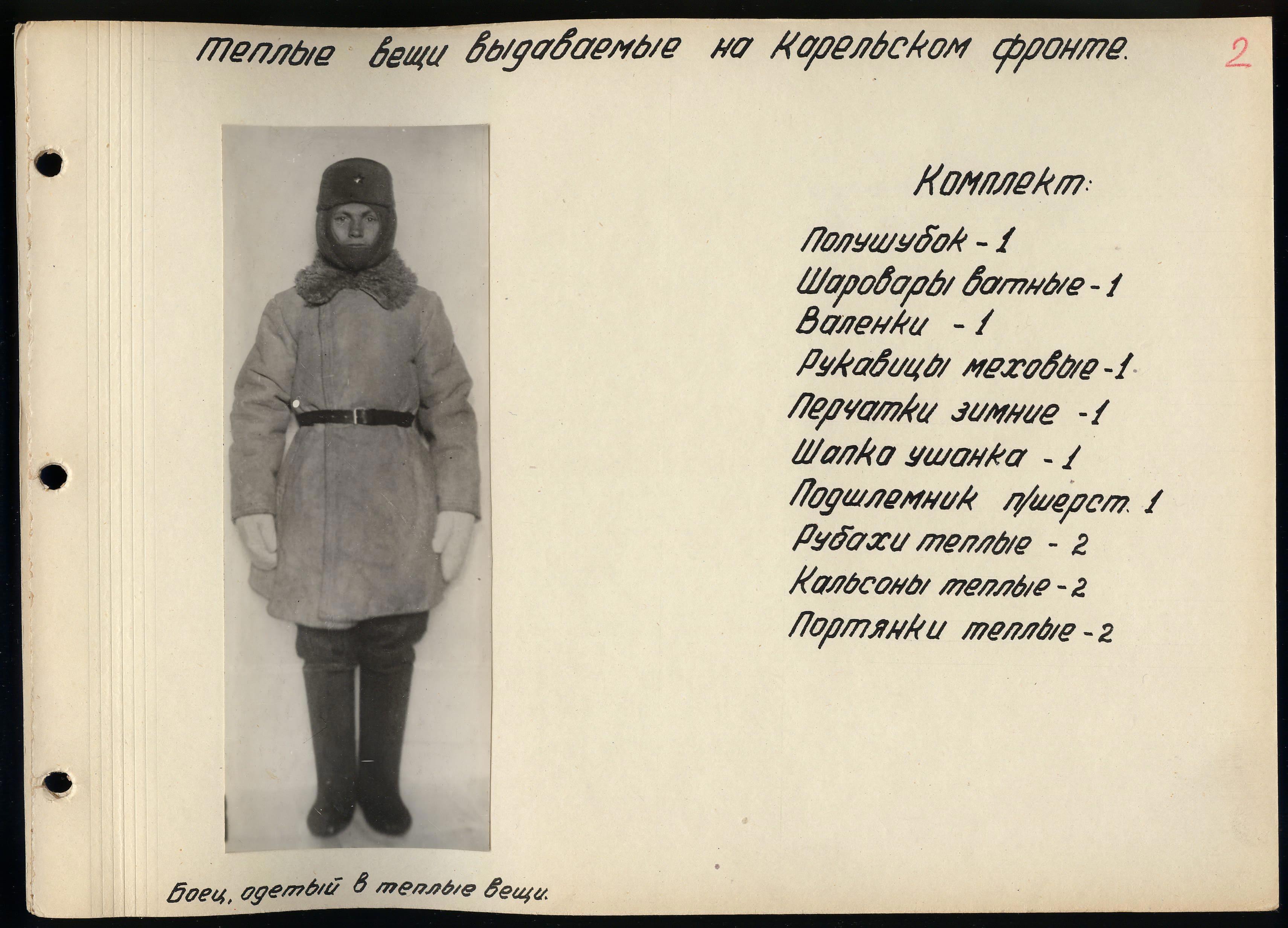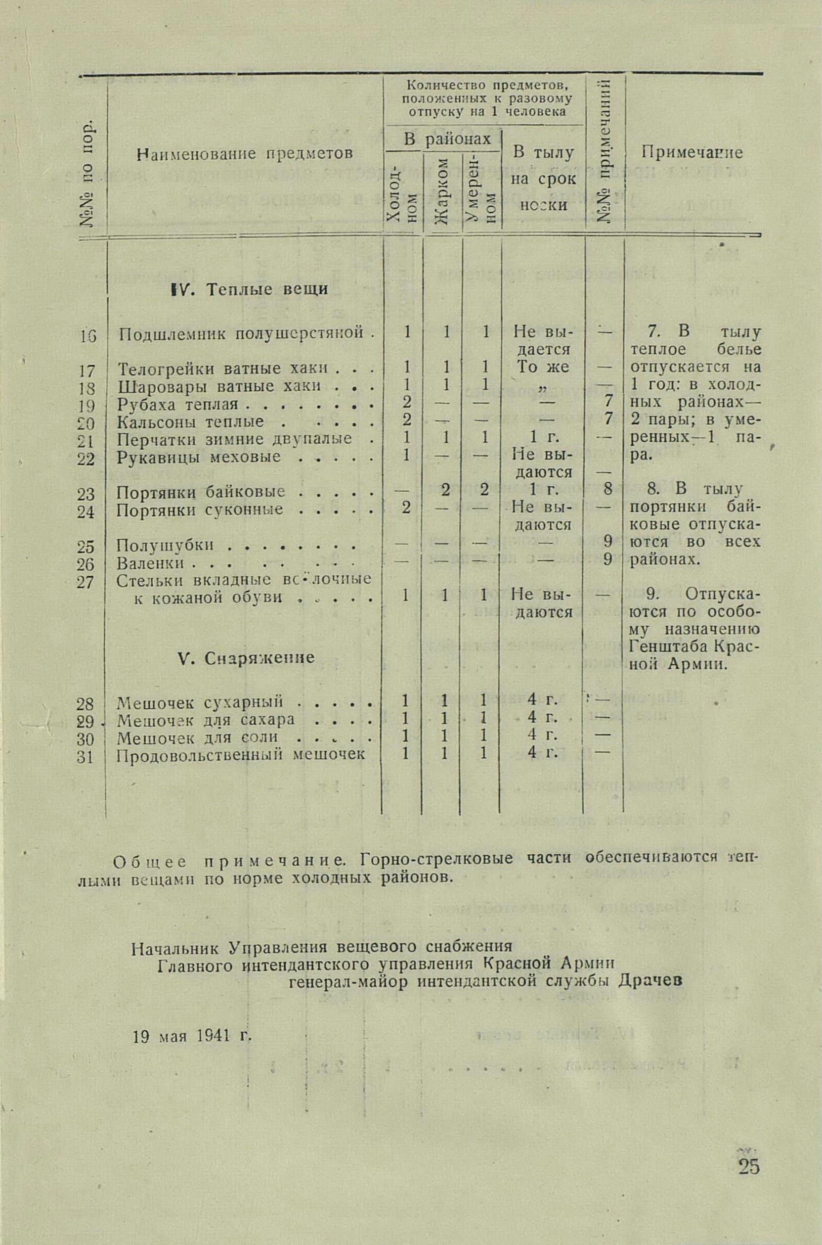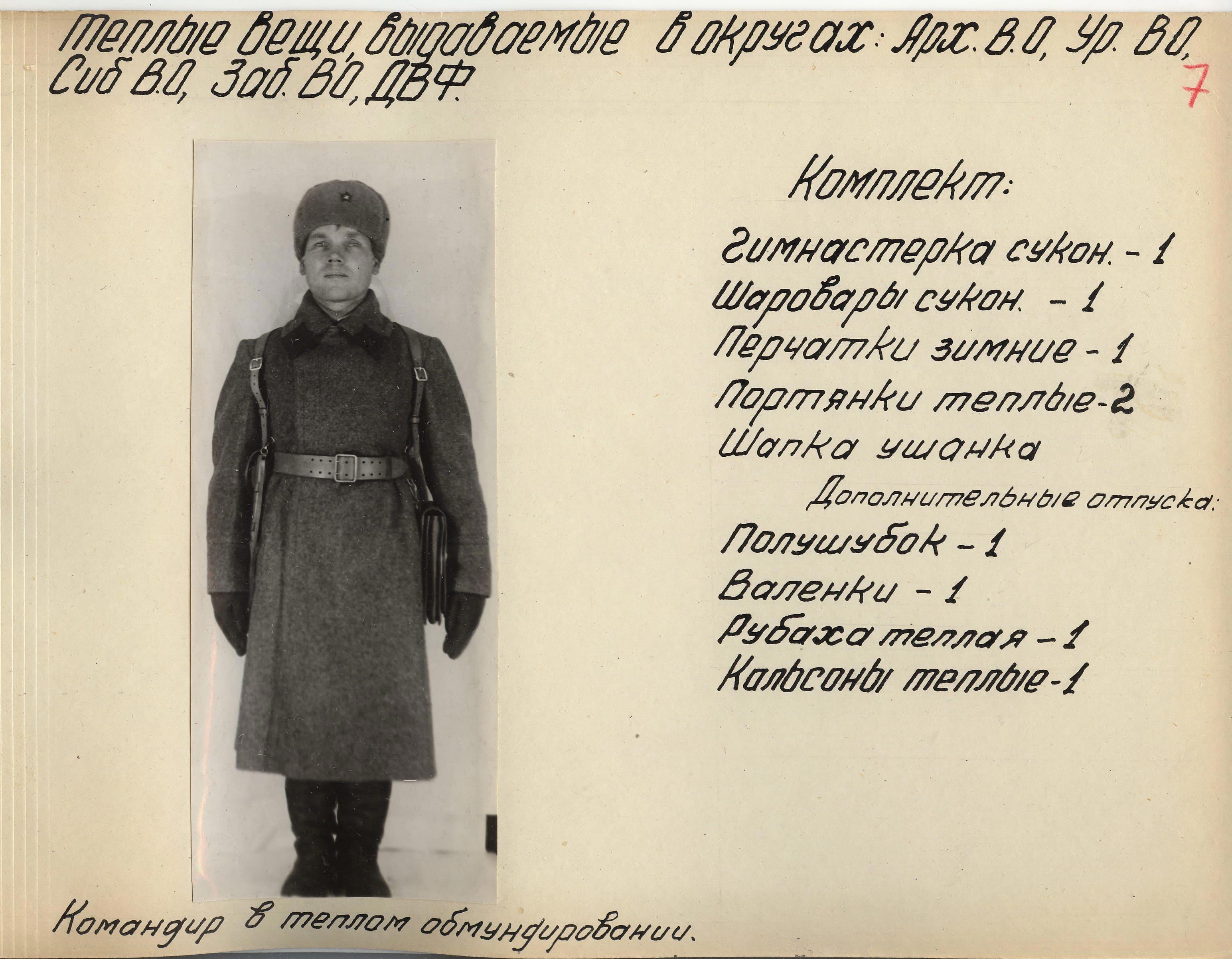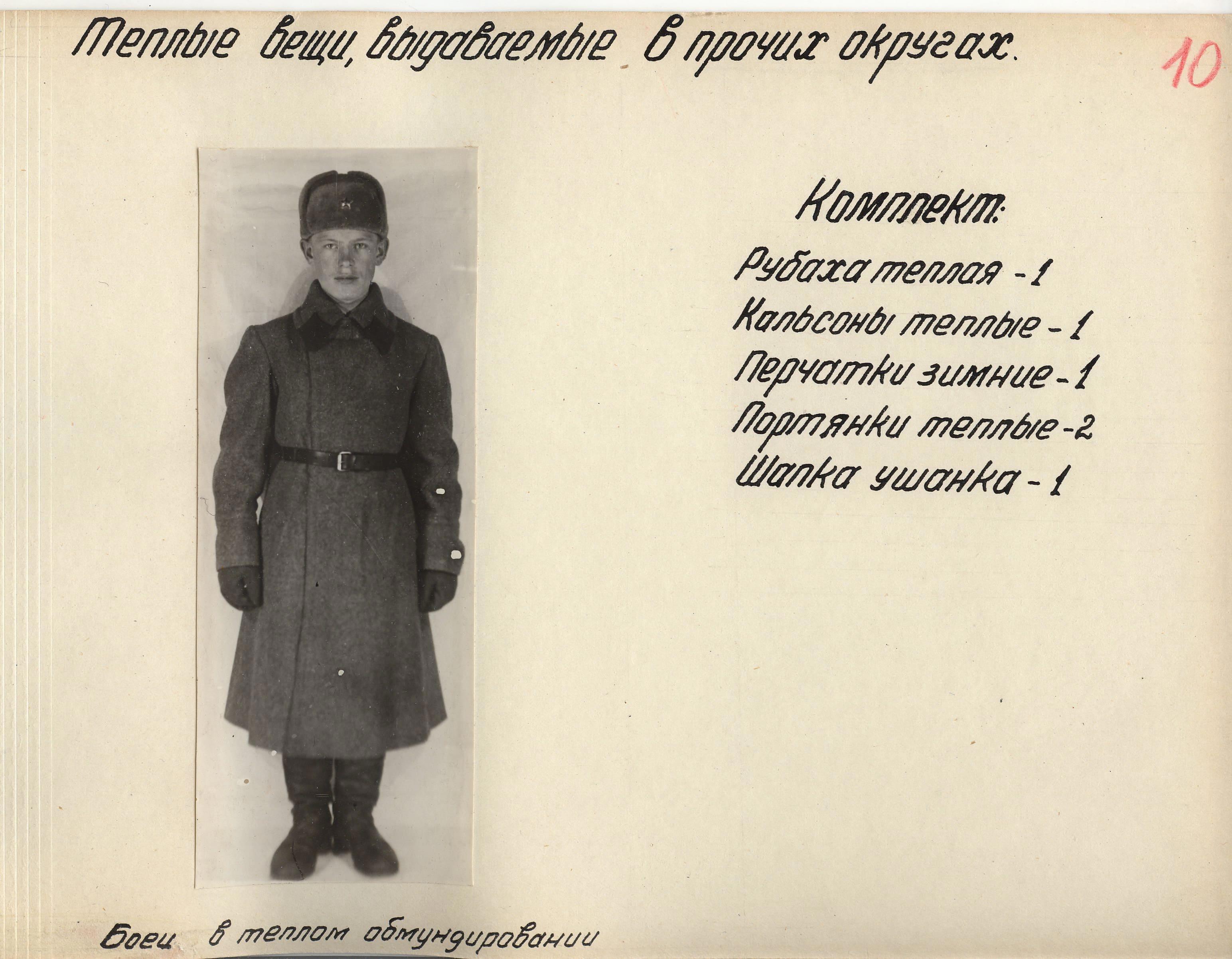 «Во время войны теплые вещи отпускались по особым нормам, которые утверждались ежегодно Государственным Комитетом Обороны. Нормы теплых вещей, объявленные в приказе НКО СССР № 145-42г. оказались практически не приемлемыми, вследствие разнообразных климатических условий и погоды для каждого фронта. Нормы отпуска теплых вещей по годам снабжения приведены в приложении № 10.».