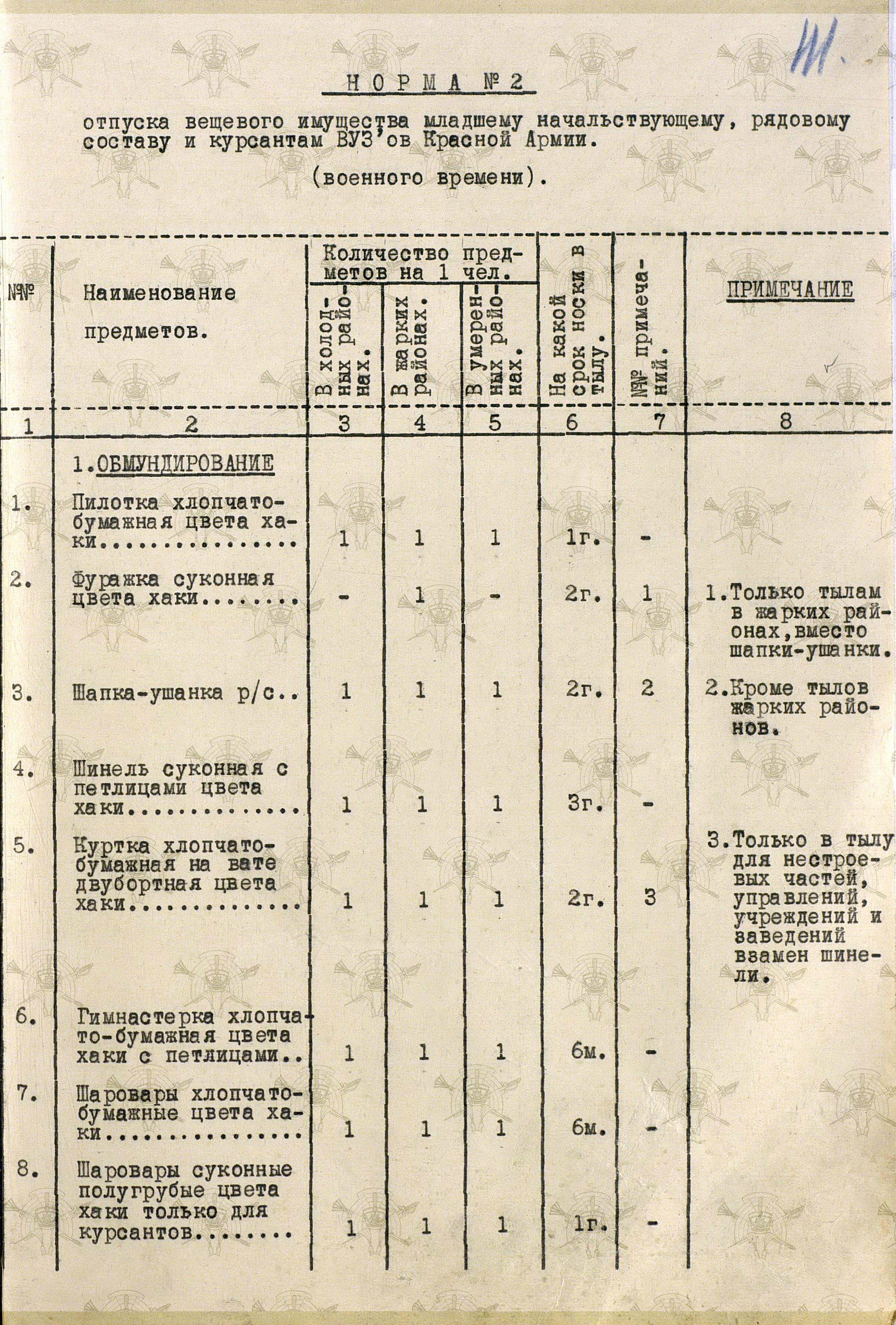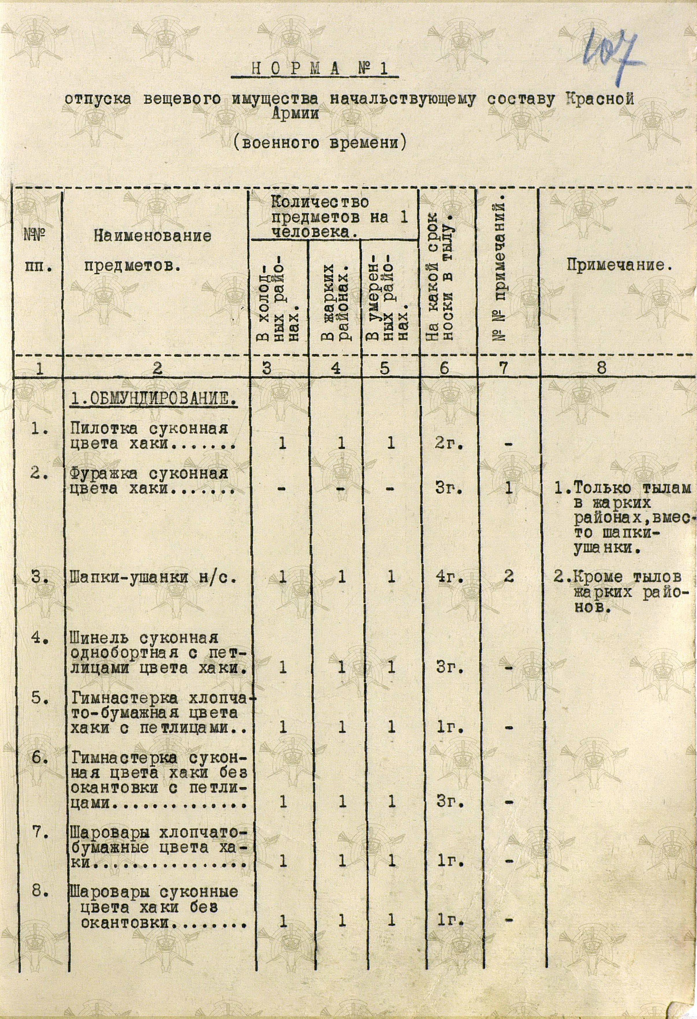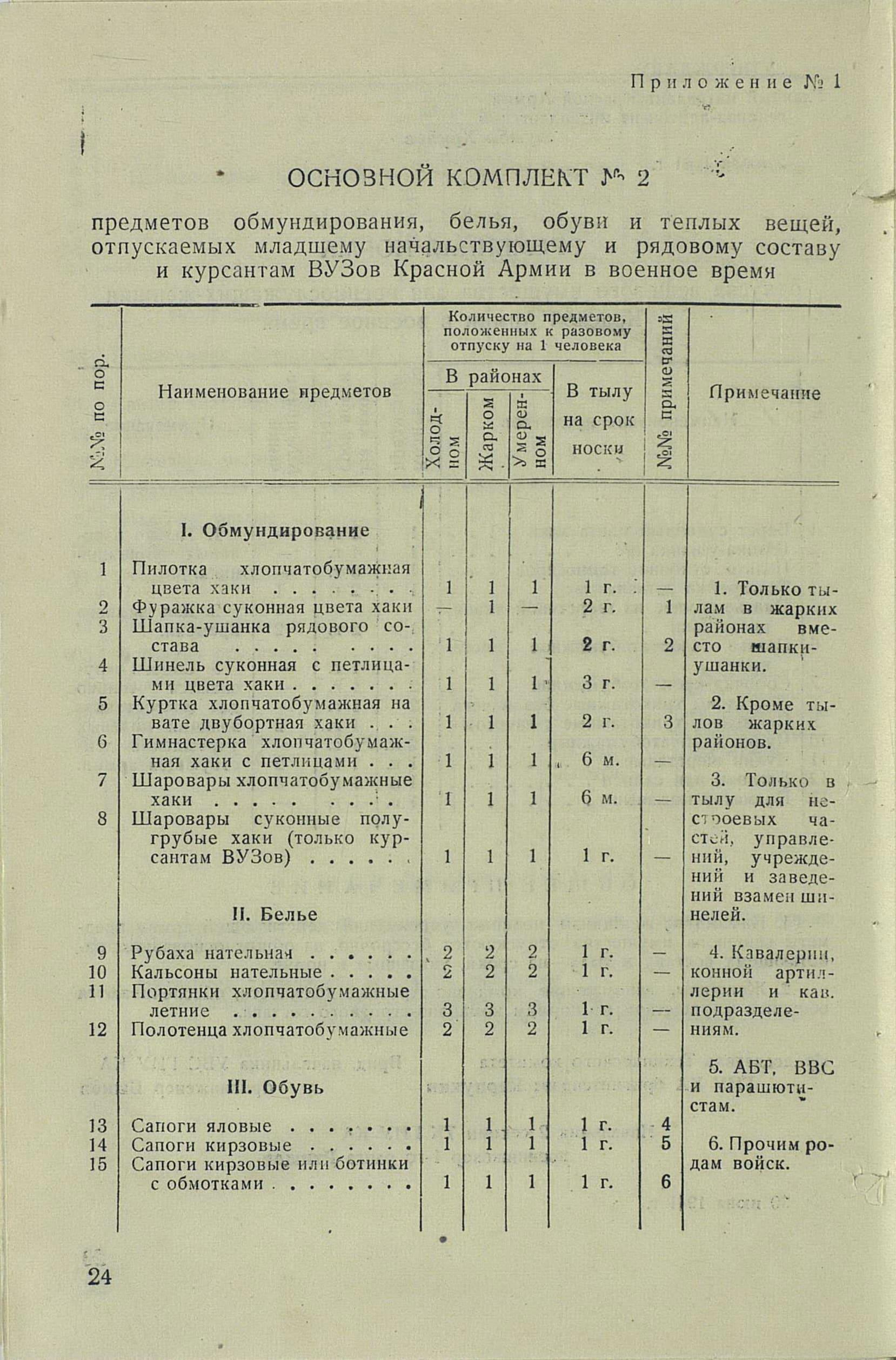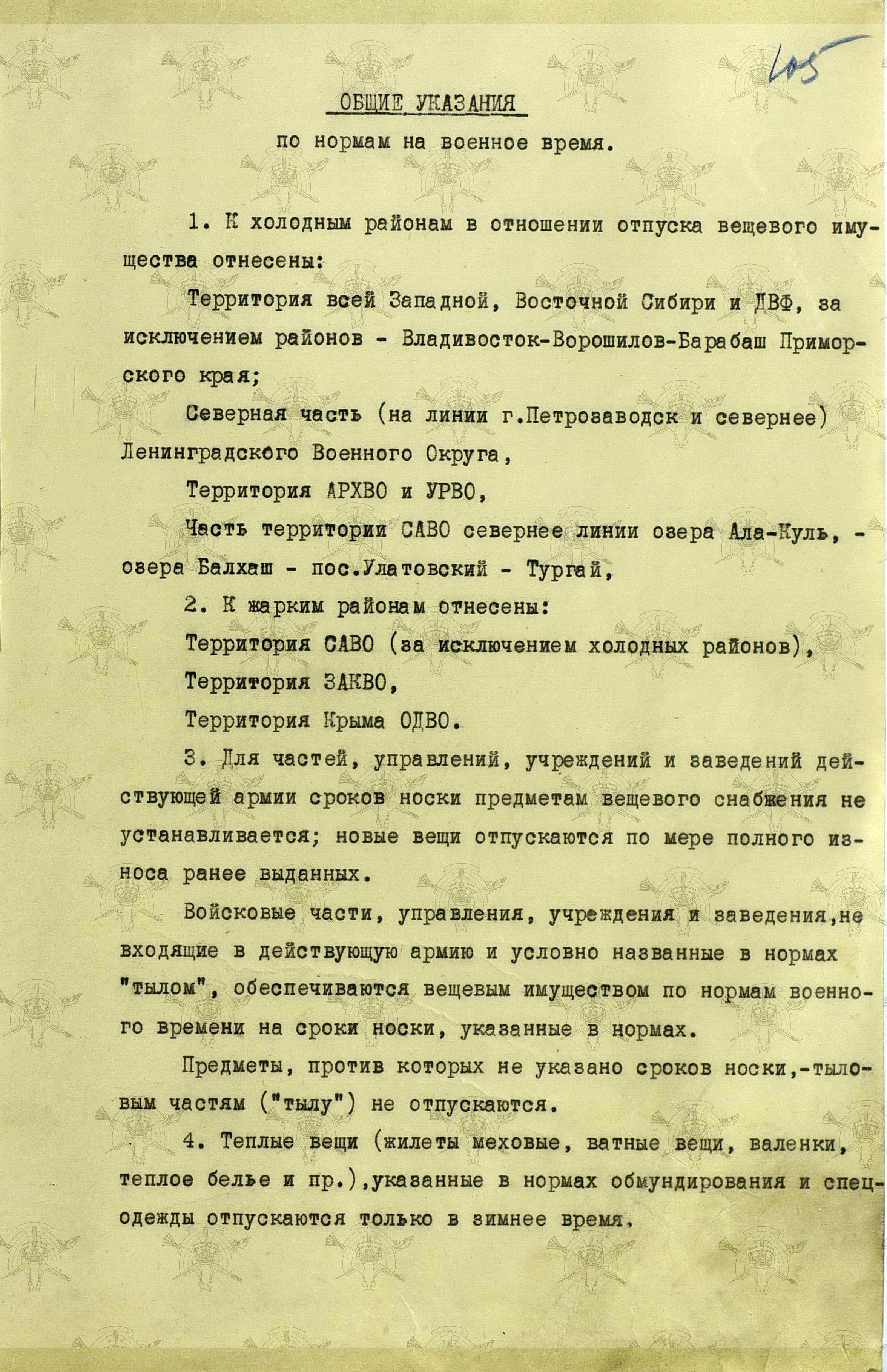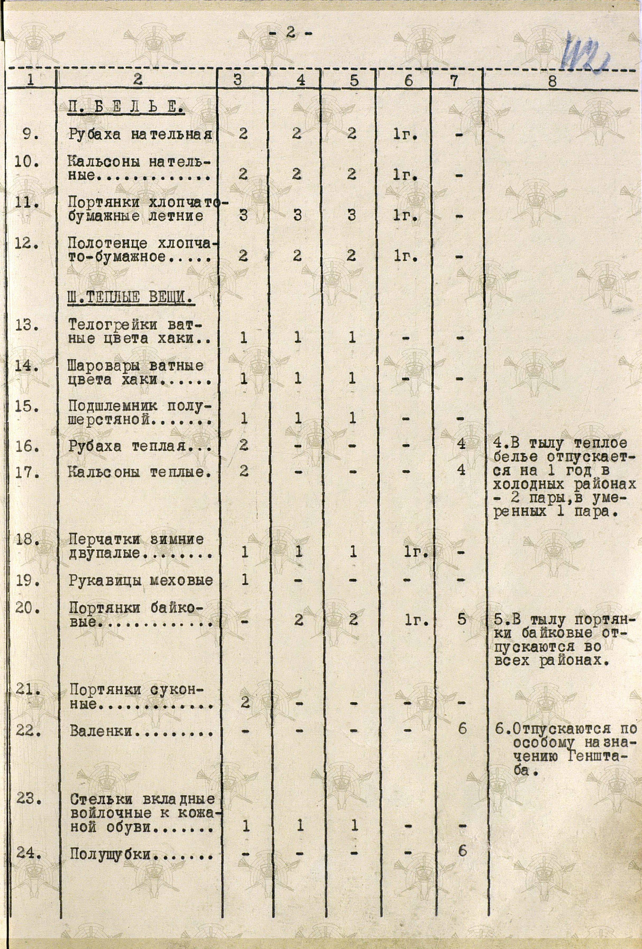 «Во время войны теплые вещи отпускались по особым нормам, которые утверждались ежегодно Государственным Комитетом Обороны. Нормы теплых вещей, объявленные в приказе НКО СССР № 145-42г. оказались практически не приемлемыми, вследствие разнообразных климатических условий и погоды для каждого фронта. Нормы отпуска теплых вещей по годам снабжения приведены в приложении № 10.».