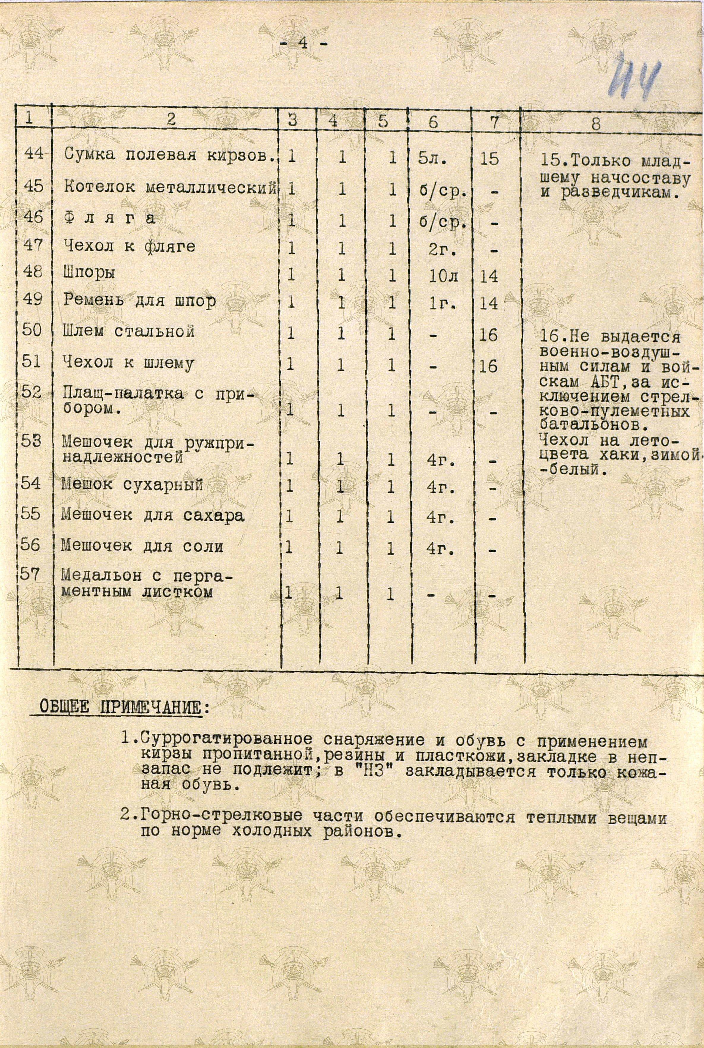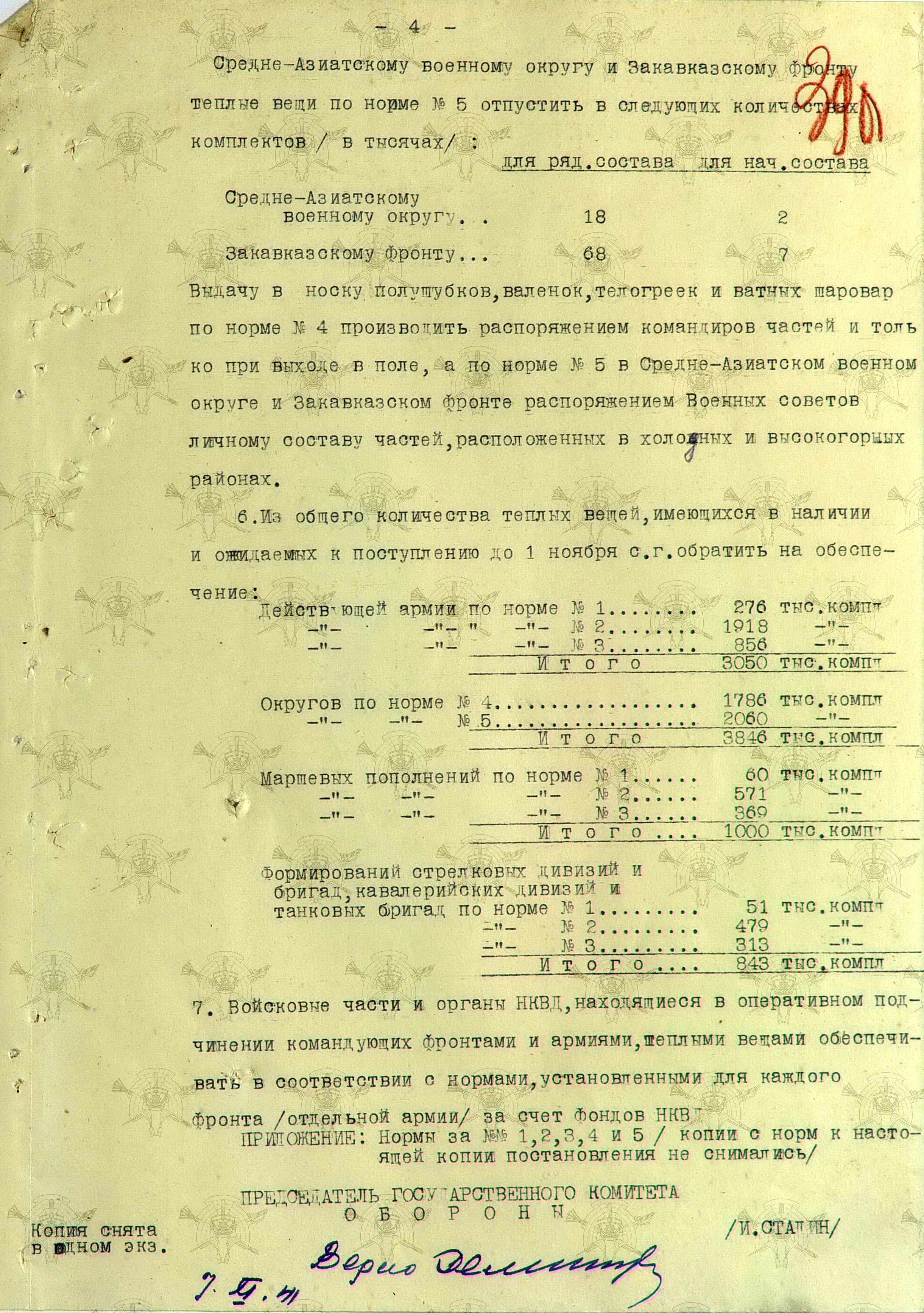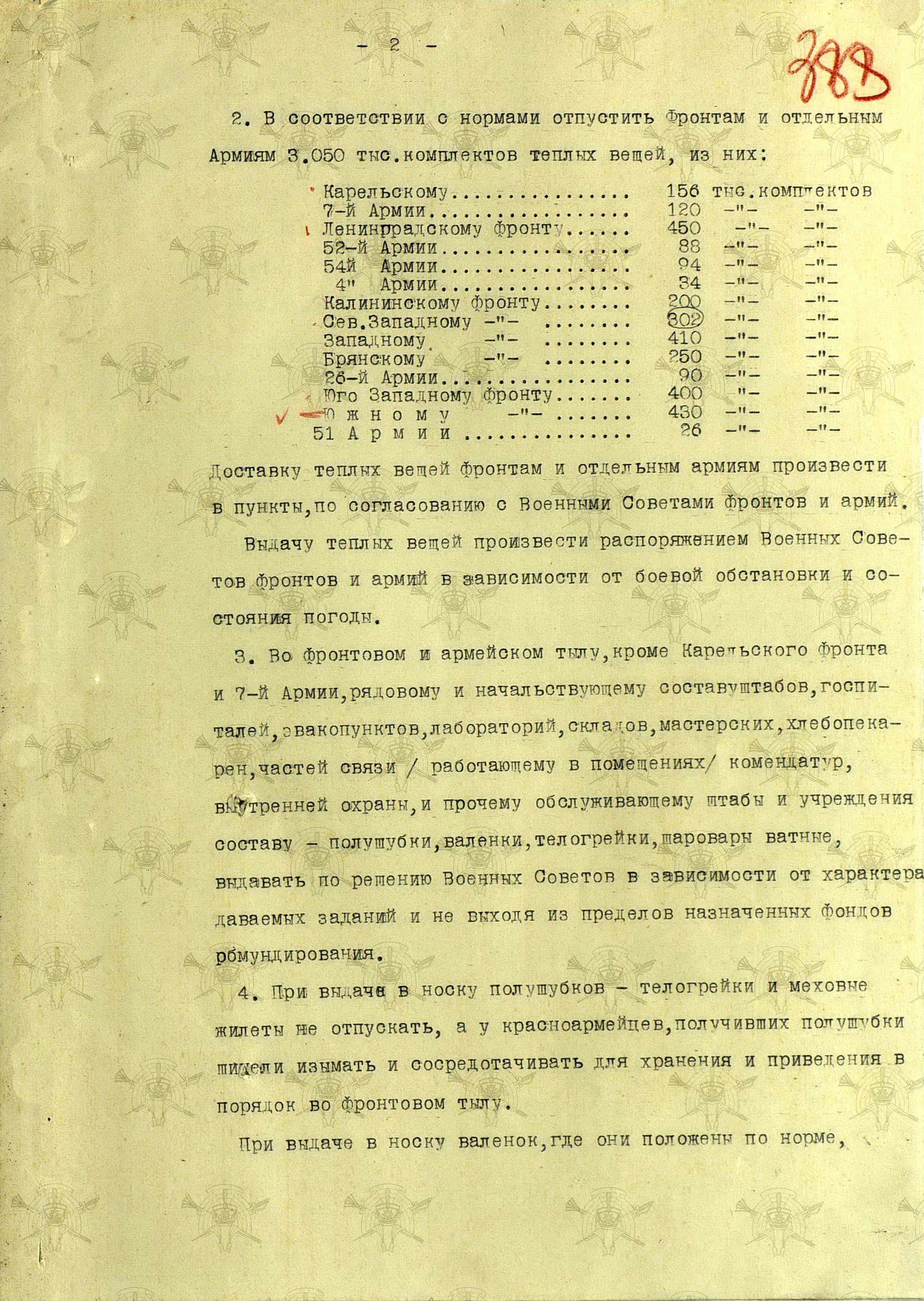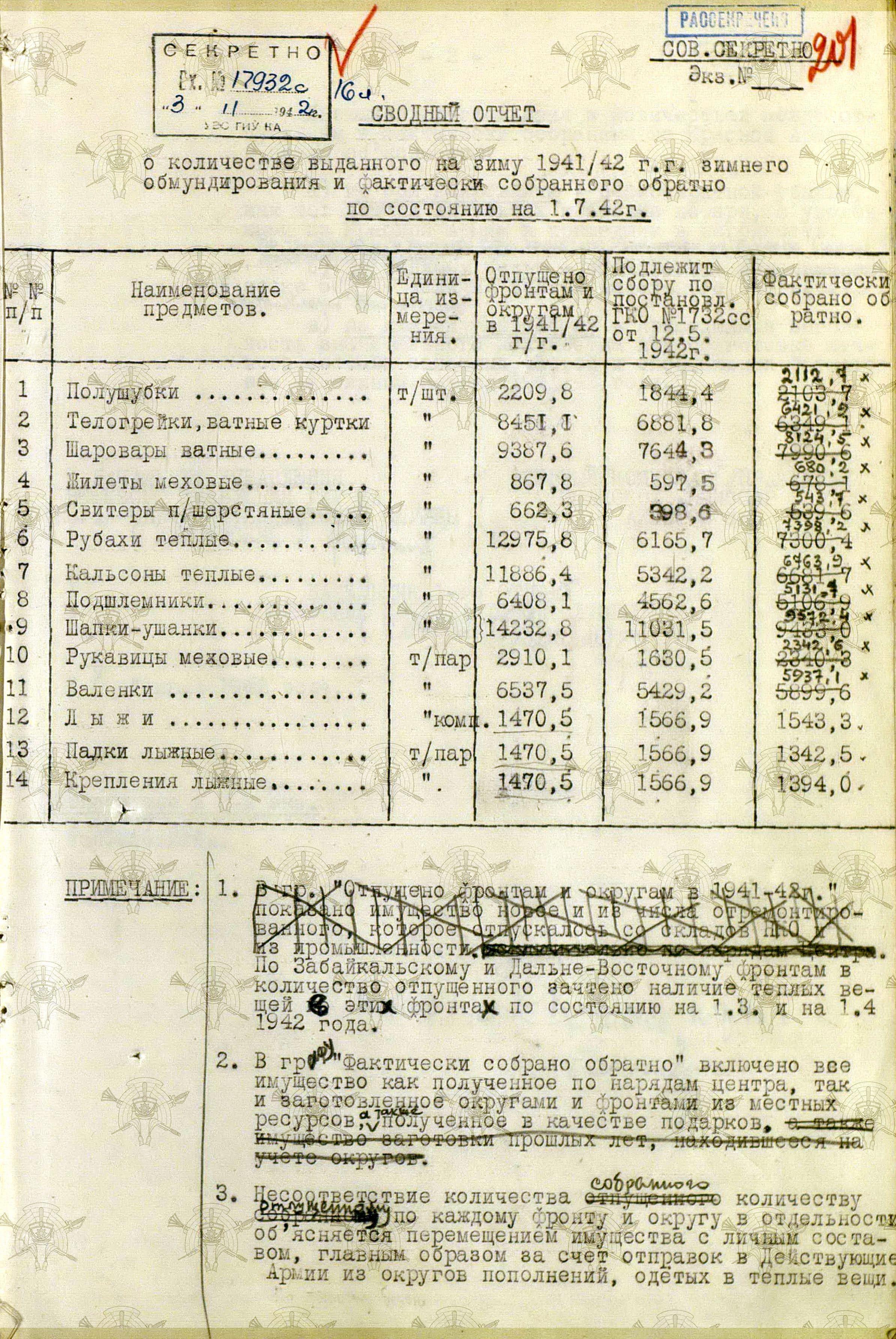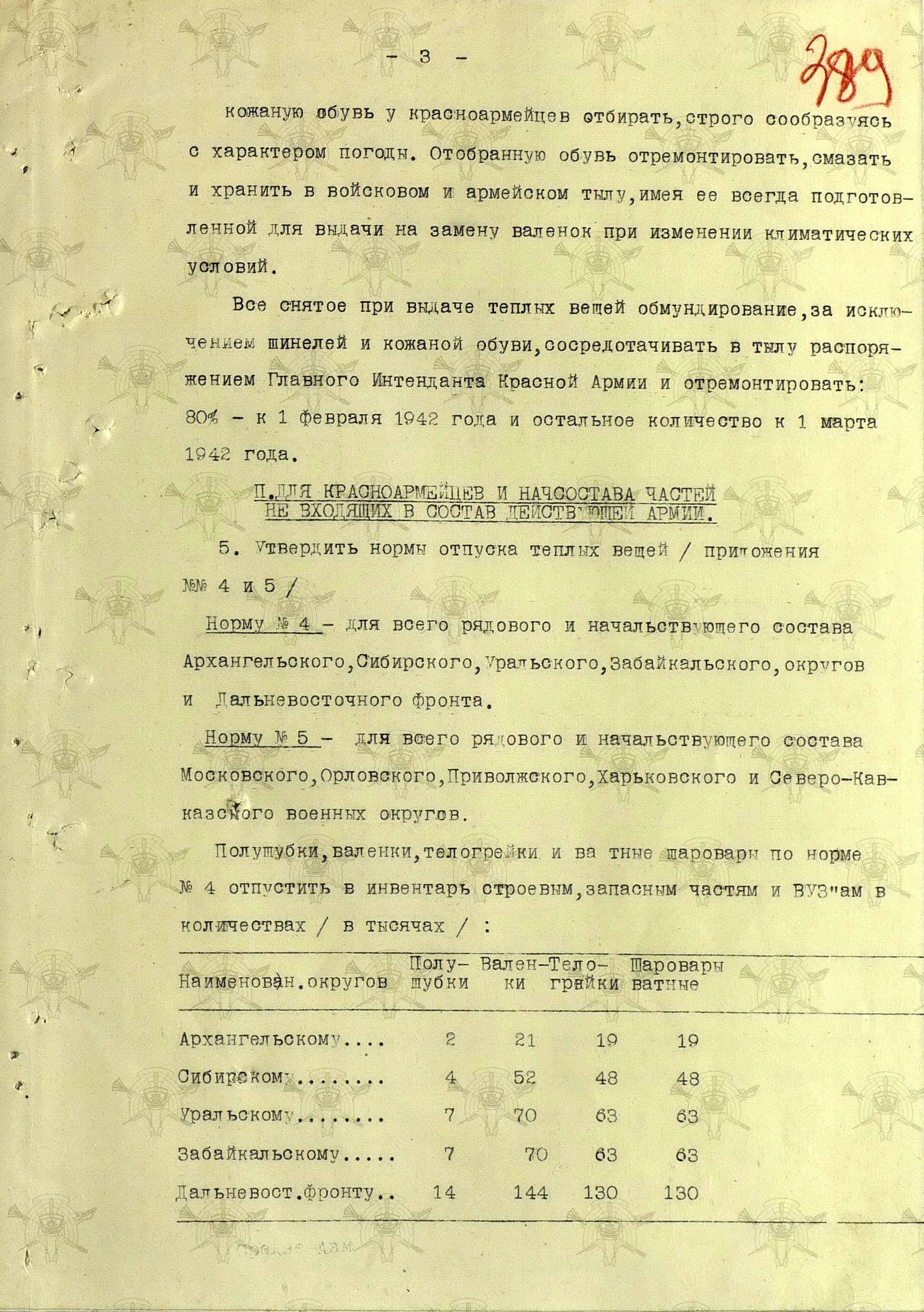 «Во время войны теплые вещи отпускались по особым нормам, которые утверждались ежегодно Государственным Комитетом Обороны. Нормы теплых вещей, объявленные в приказе НКО СССР № 145-42г. оказались практически не приемлемыми, вследствие разнообразных климатических условий и погоды для каждого фронта. Нормы отпуска теплых вещей по годам снабжения приведены в приложении № 10.».