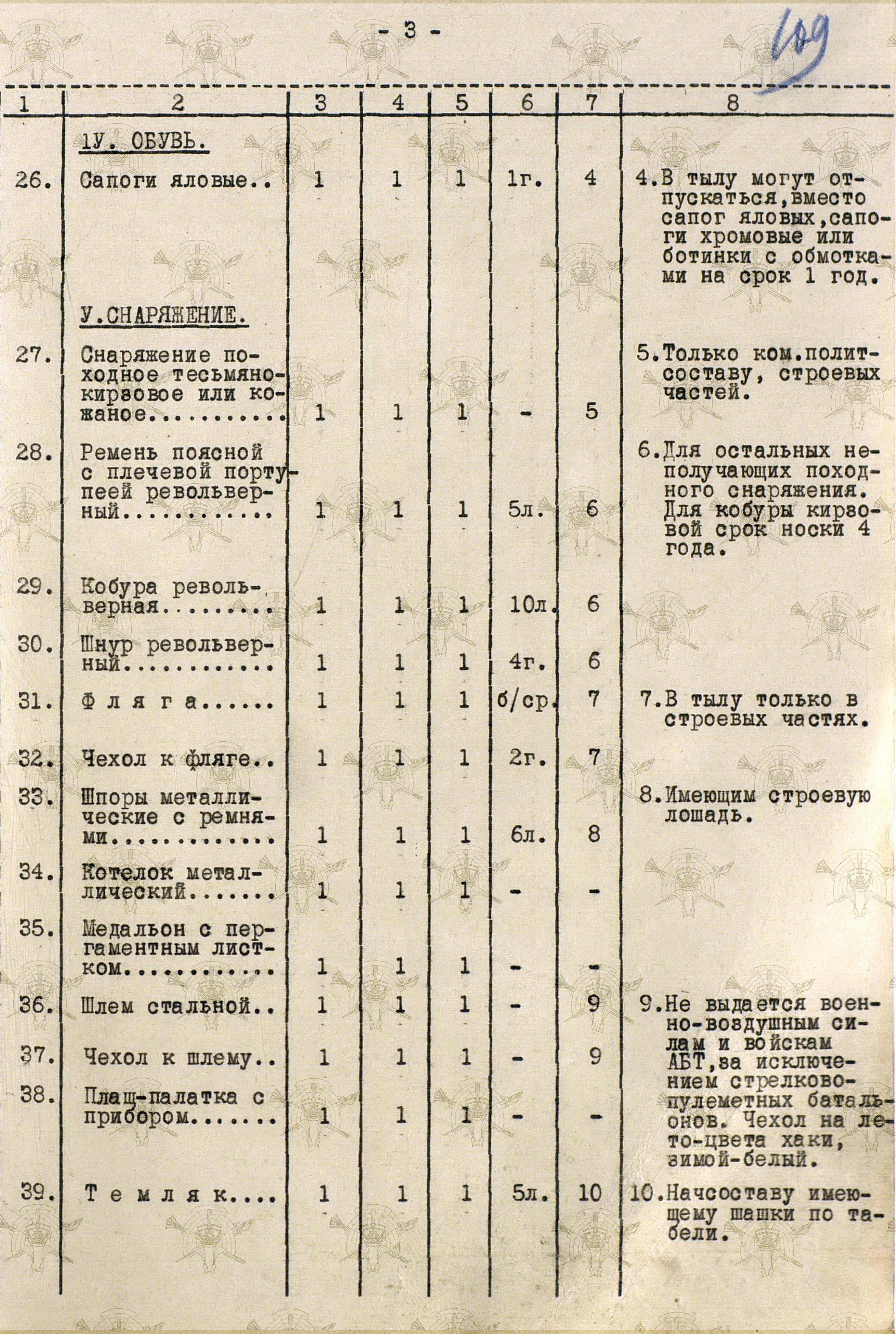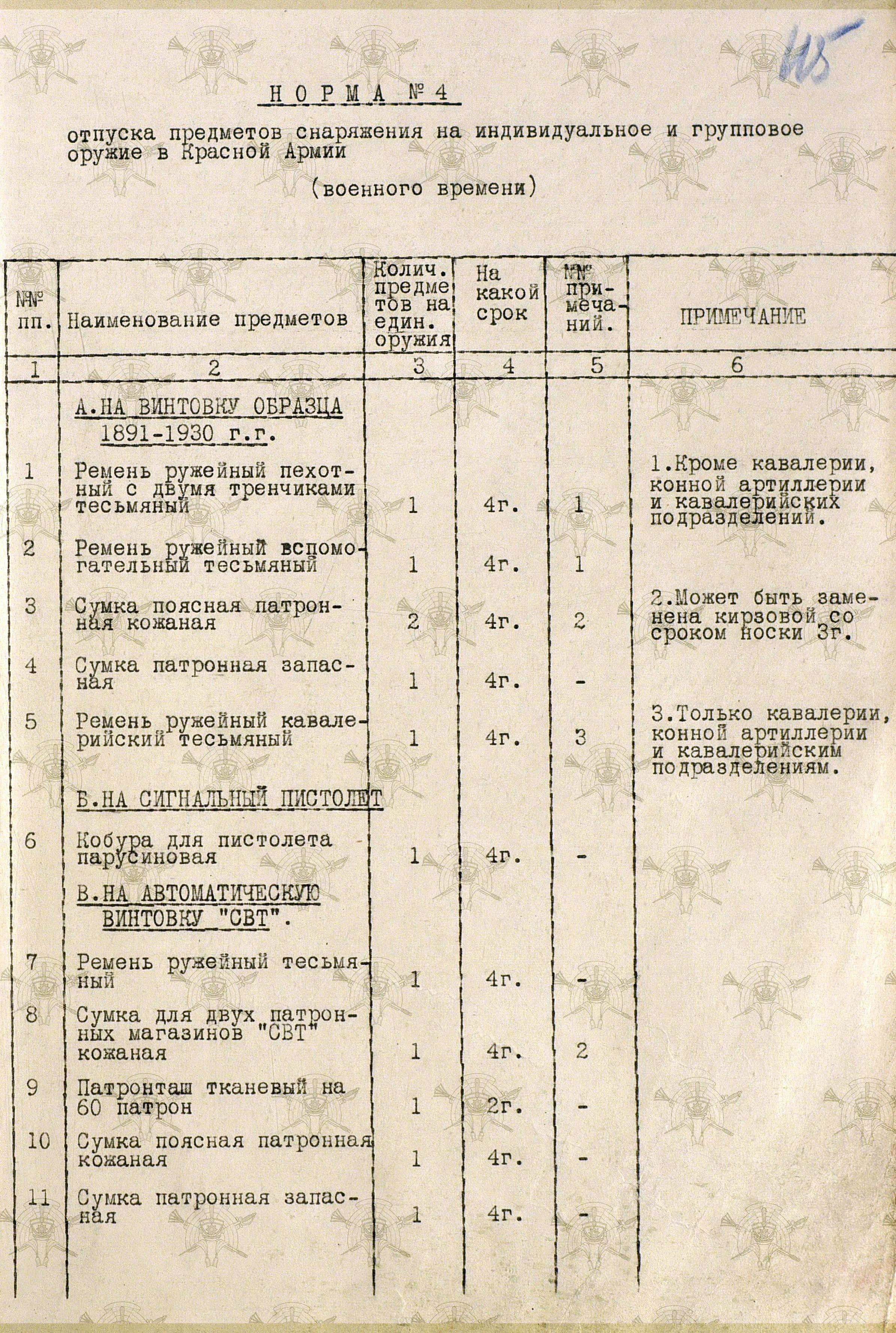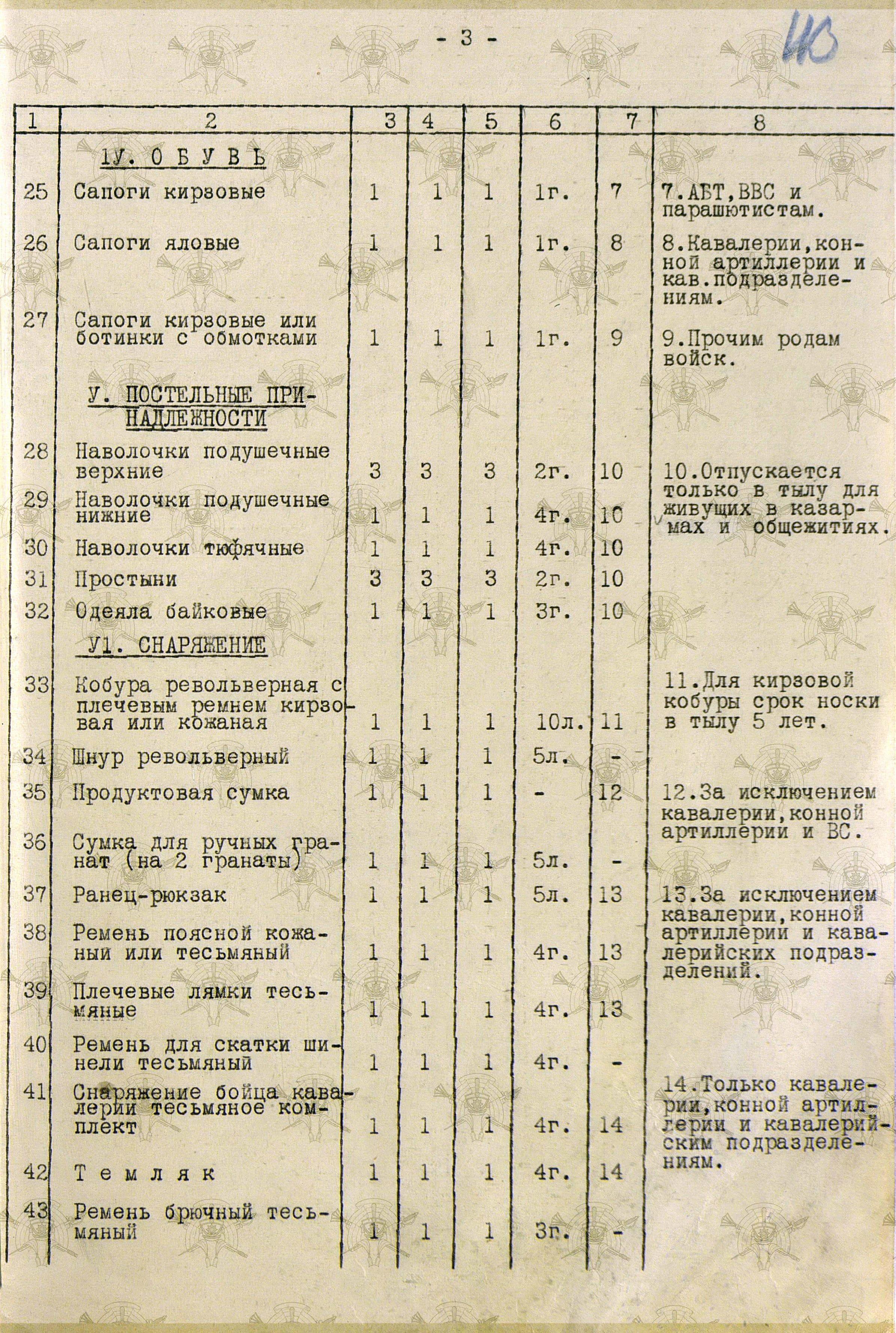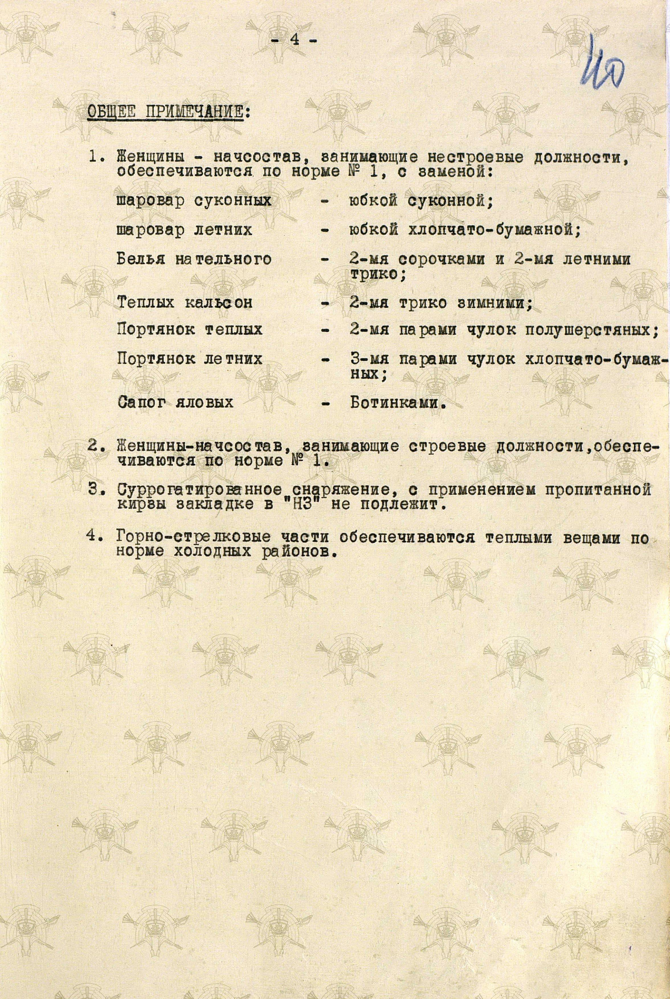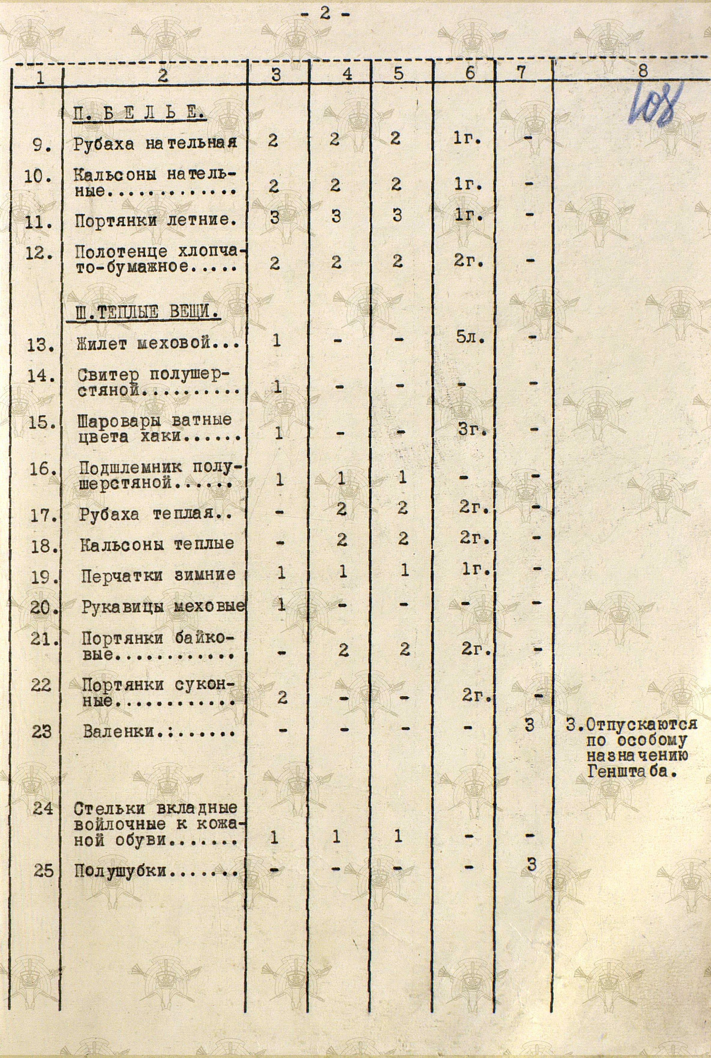«Во время войны теплые вещи отпускались по особым нормам, которые утверждались ежегодно Государственным Комитетом Обороны. Нормы теплых вещей, объявленные в приказе НКО СССР № 145-42г. оказались практически не приемлемыми, вследствие разнообразных климатических условий и погоды для каждого фронта. Нормы отпуска теплых вещей по годам снабжения приведены в приложении № 10.».