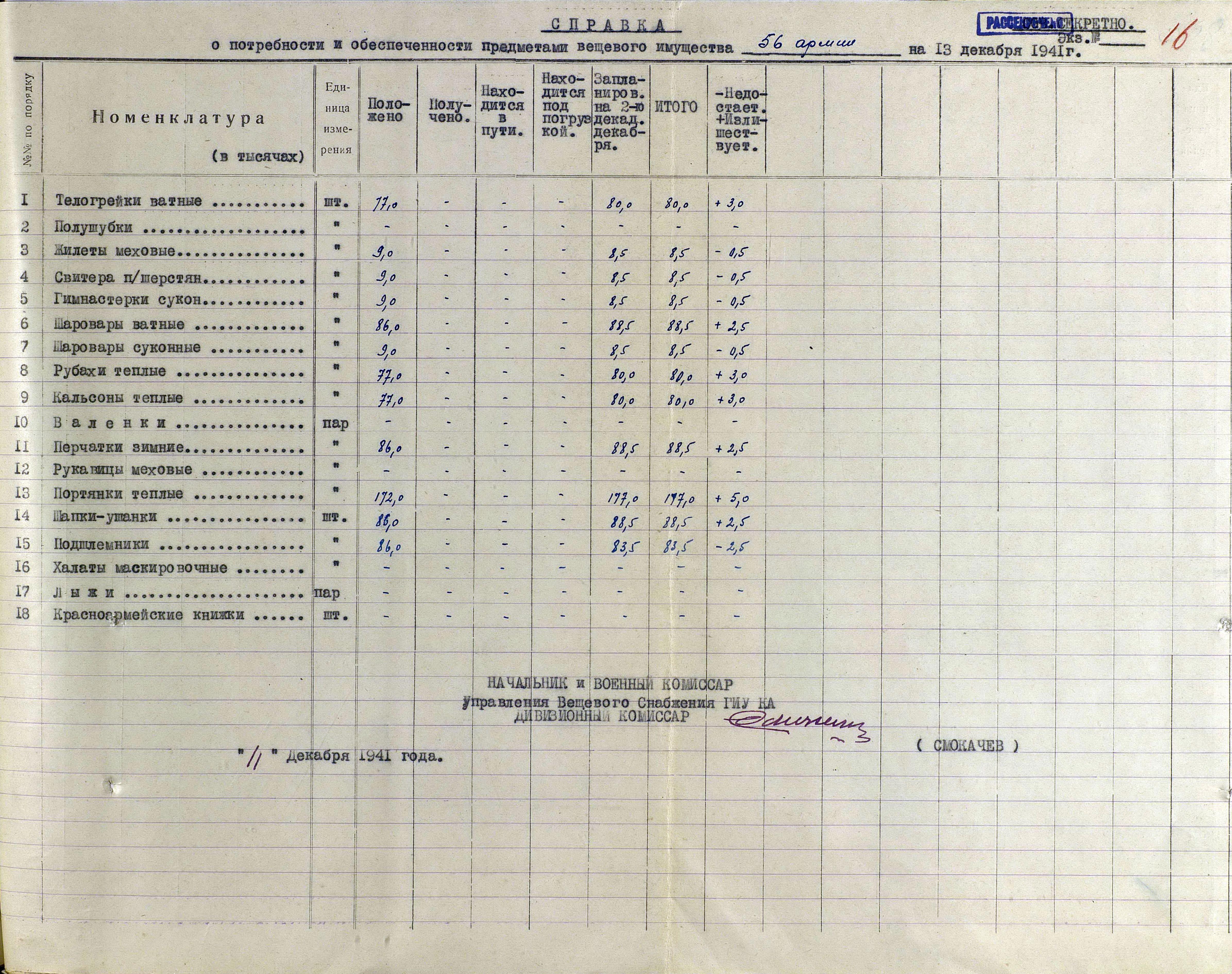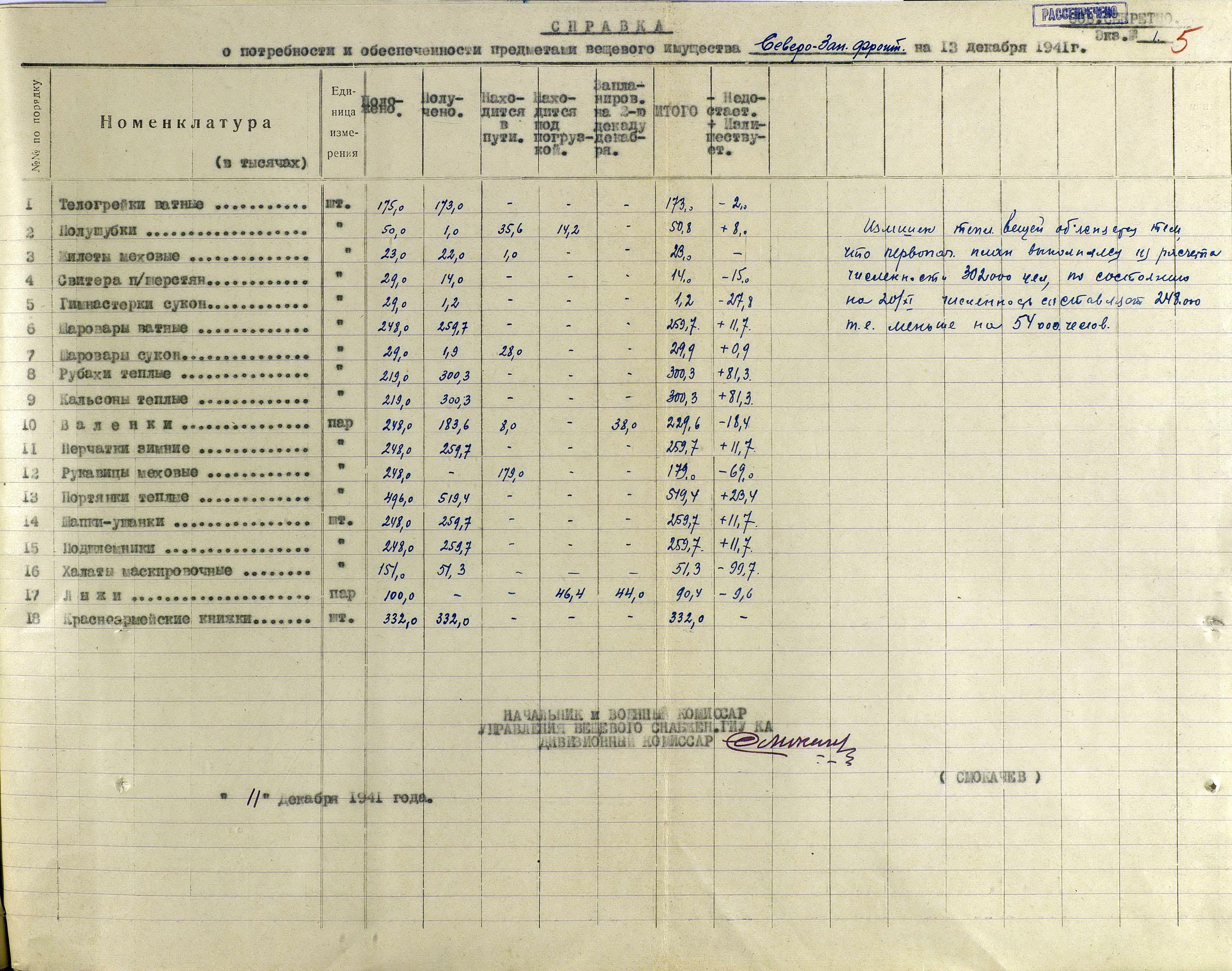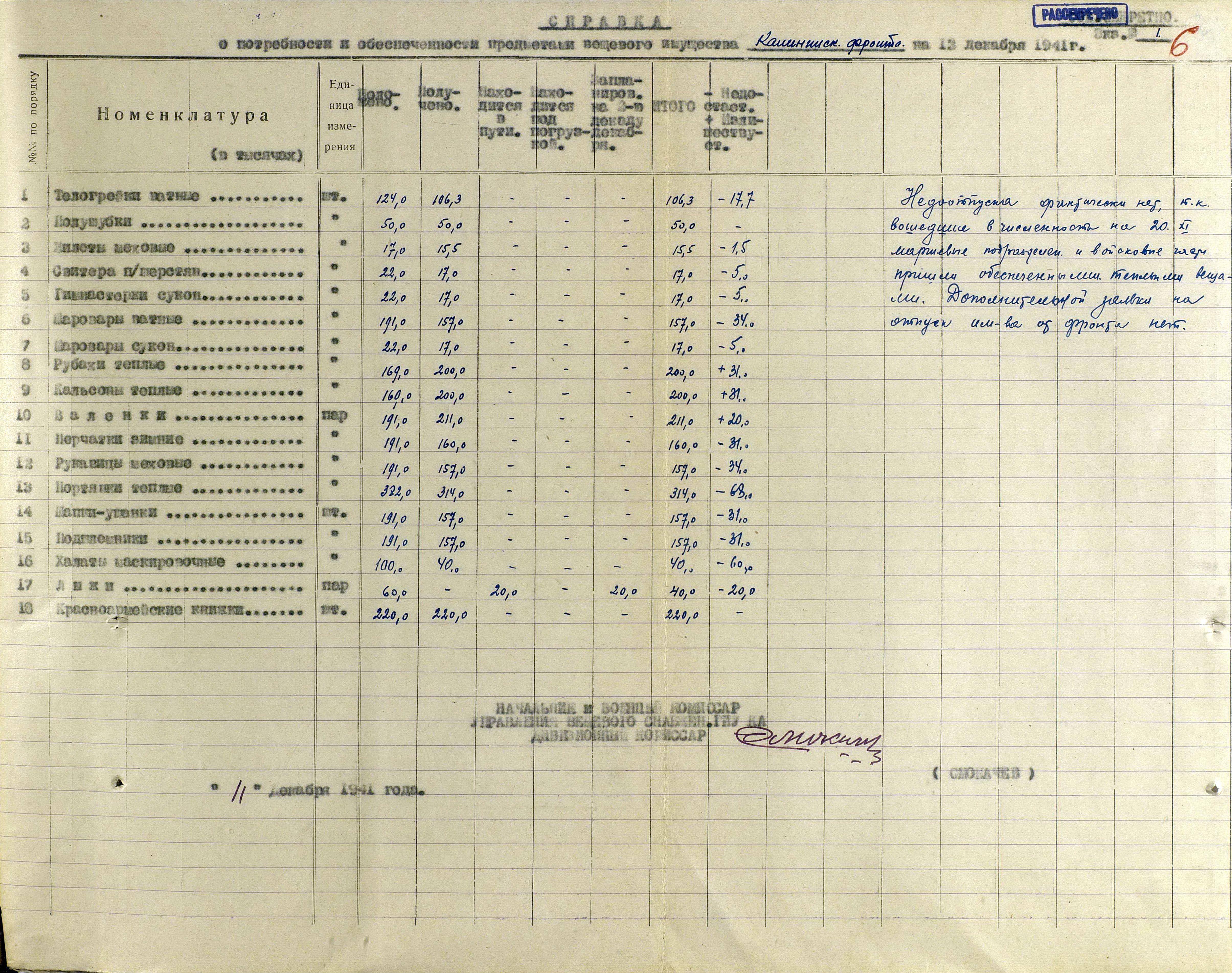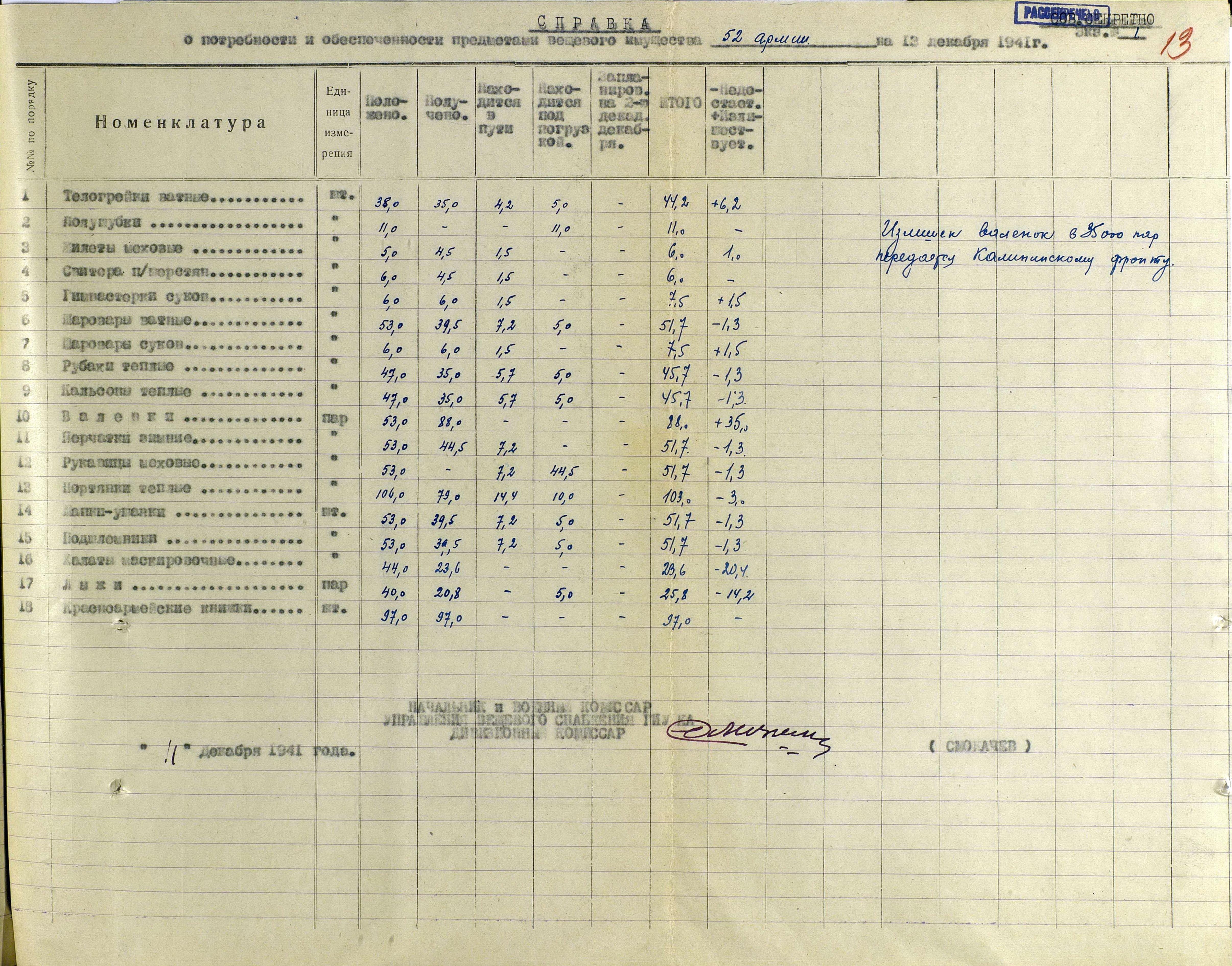 А о выполнении приказов Наркома обороны СССР и постановления ГКО, можно судить по Справке потребности – обеспеченности тёплыми вещами фронтов, по состоянию на 13 декабря 1941 г.