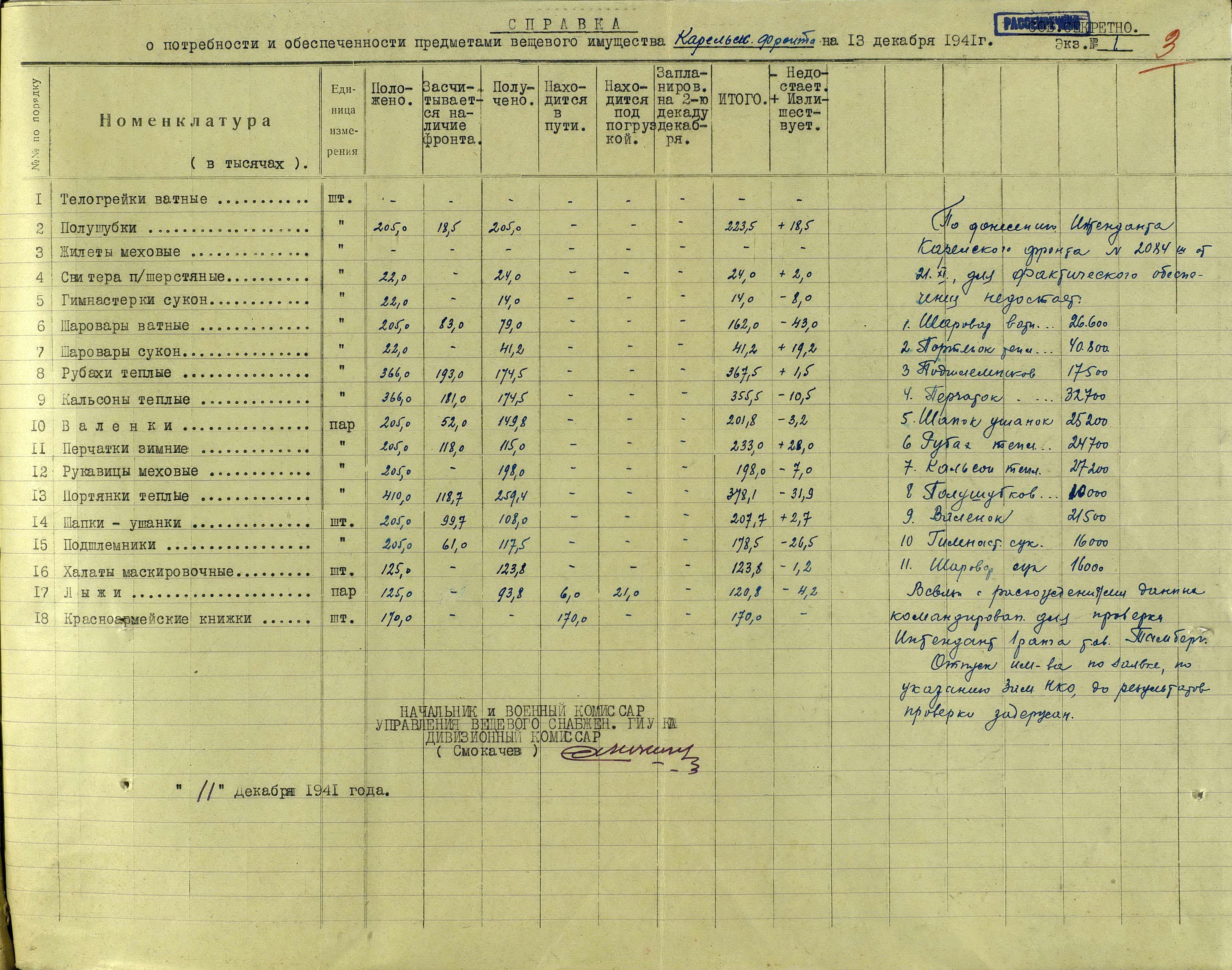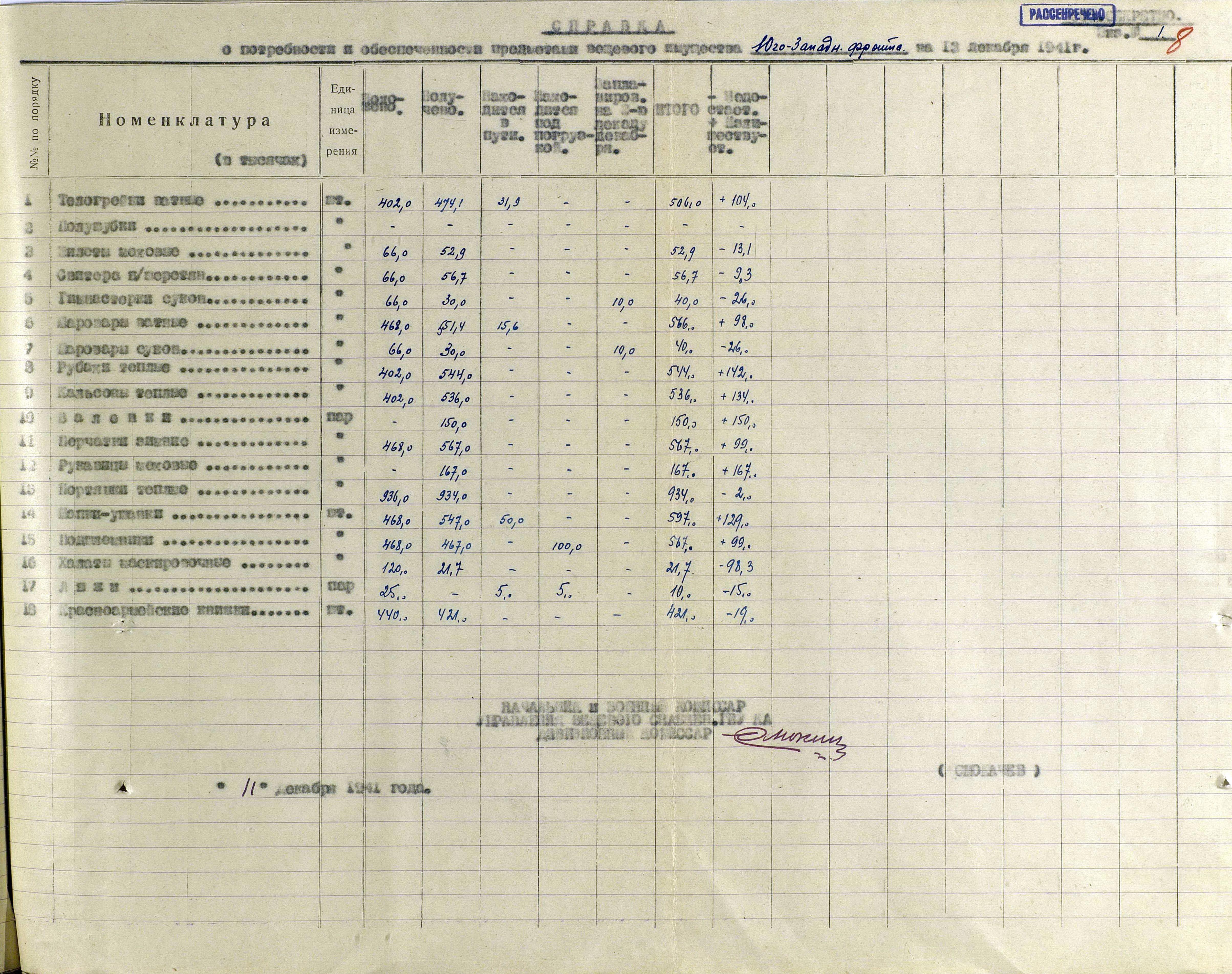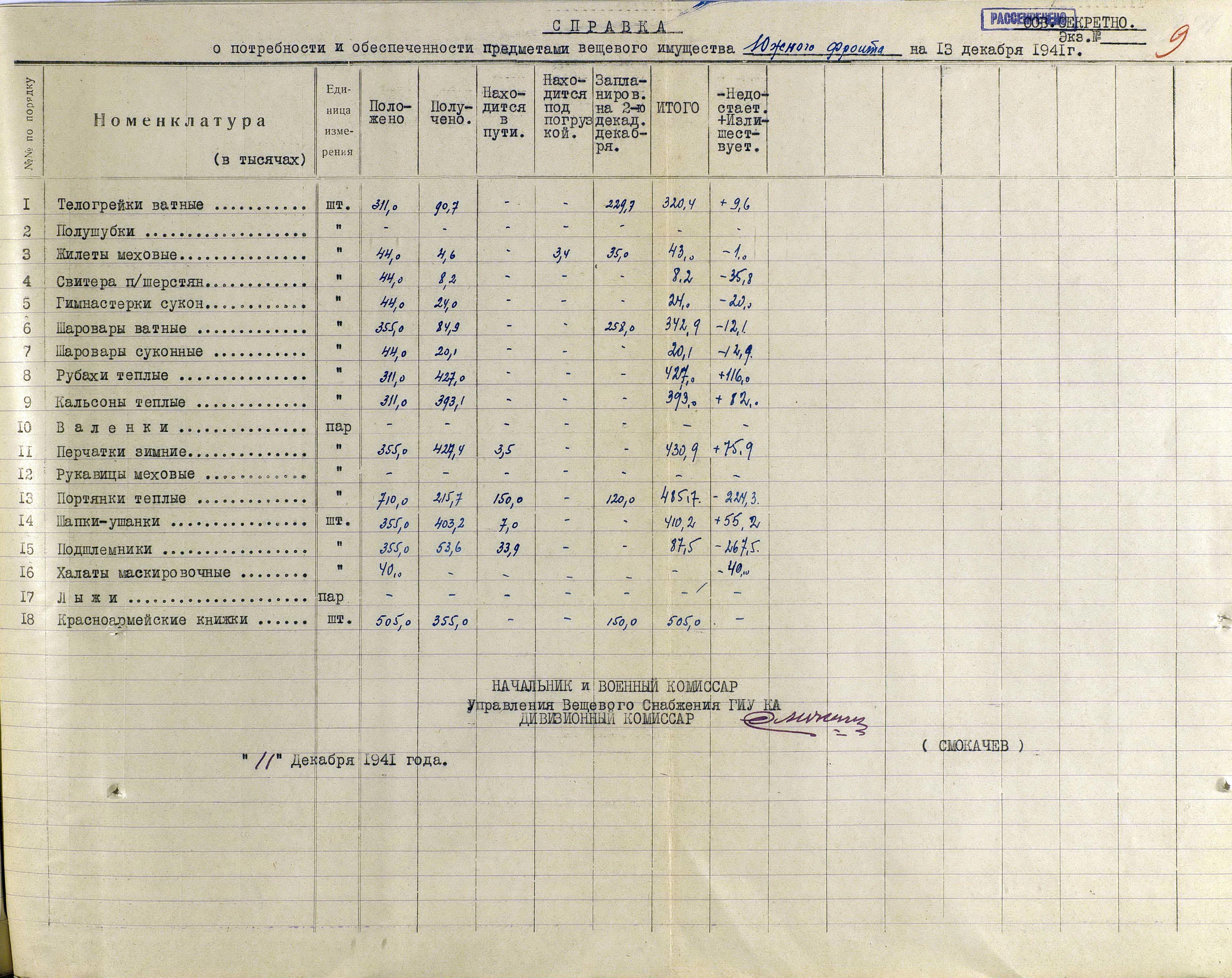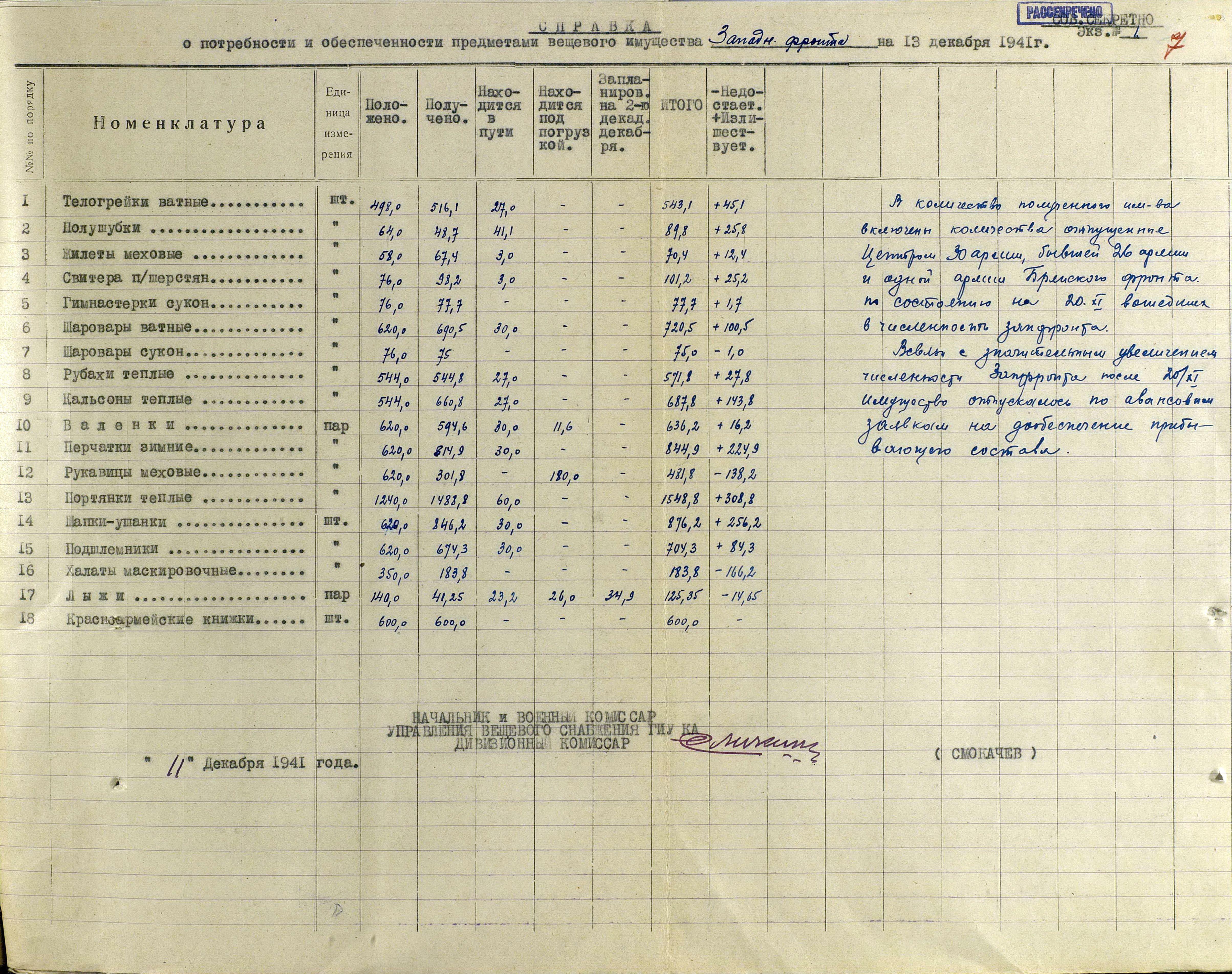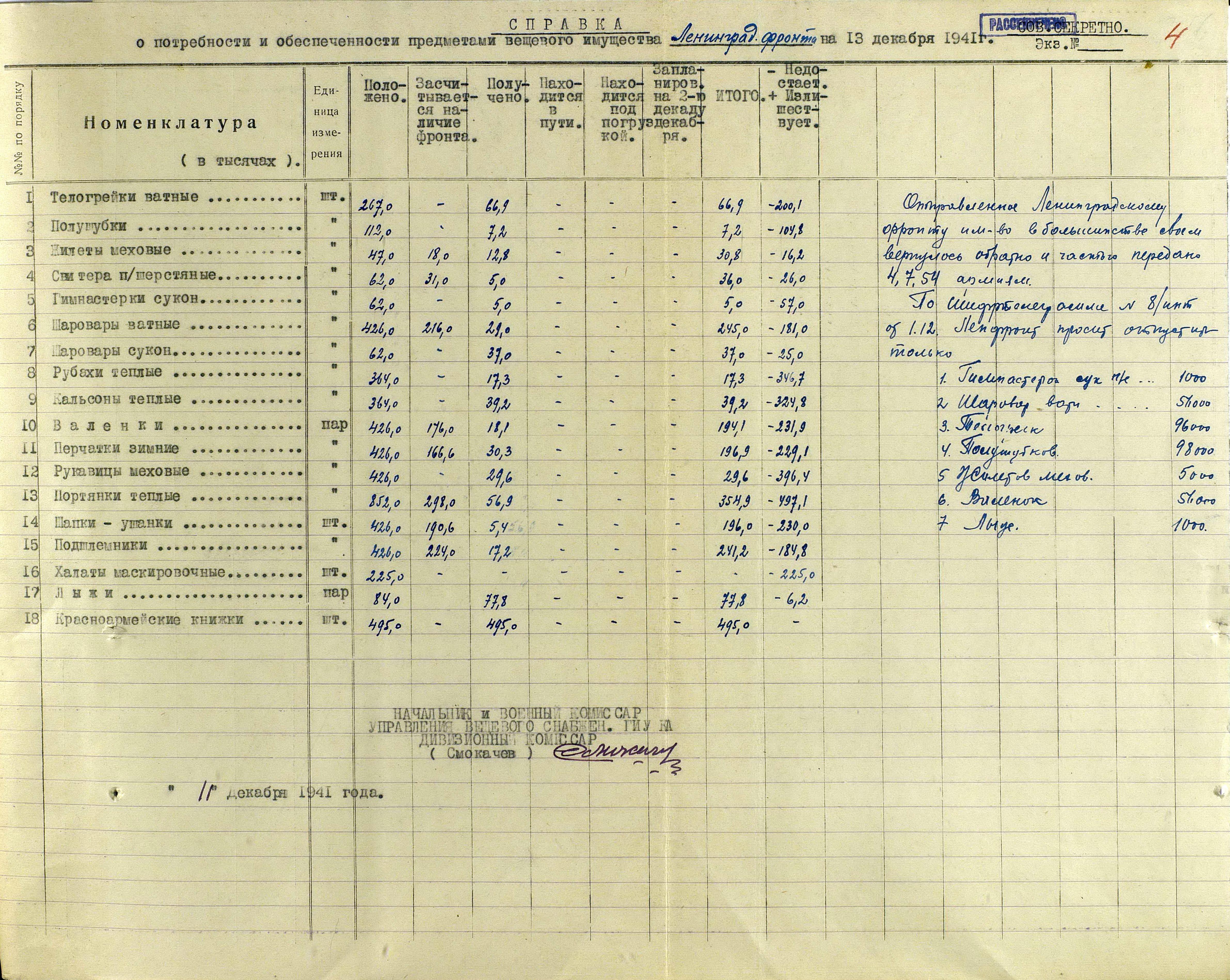 А о выполнении приказов Наркома обороны СССР и постановления ГКО, можно судить по Справке потребности – обеспеченности тёплыми вещами фронтов, по состоянию на 13 декабря 1941 г.