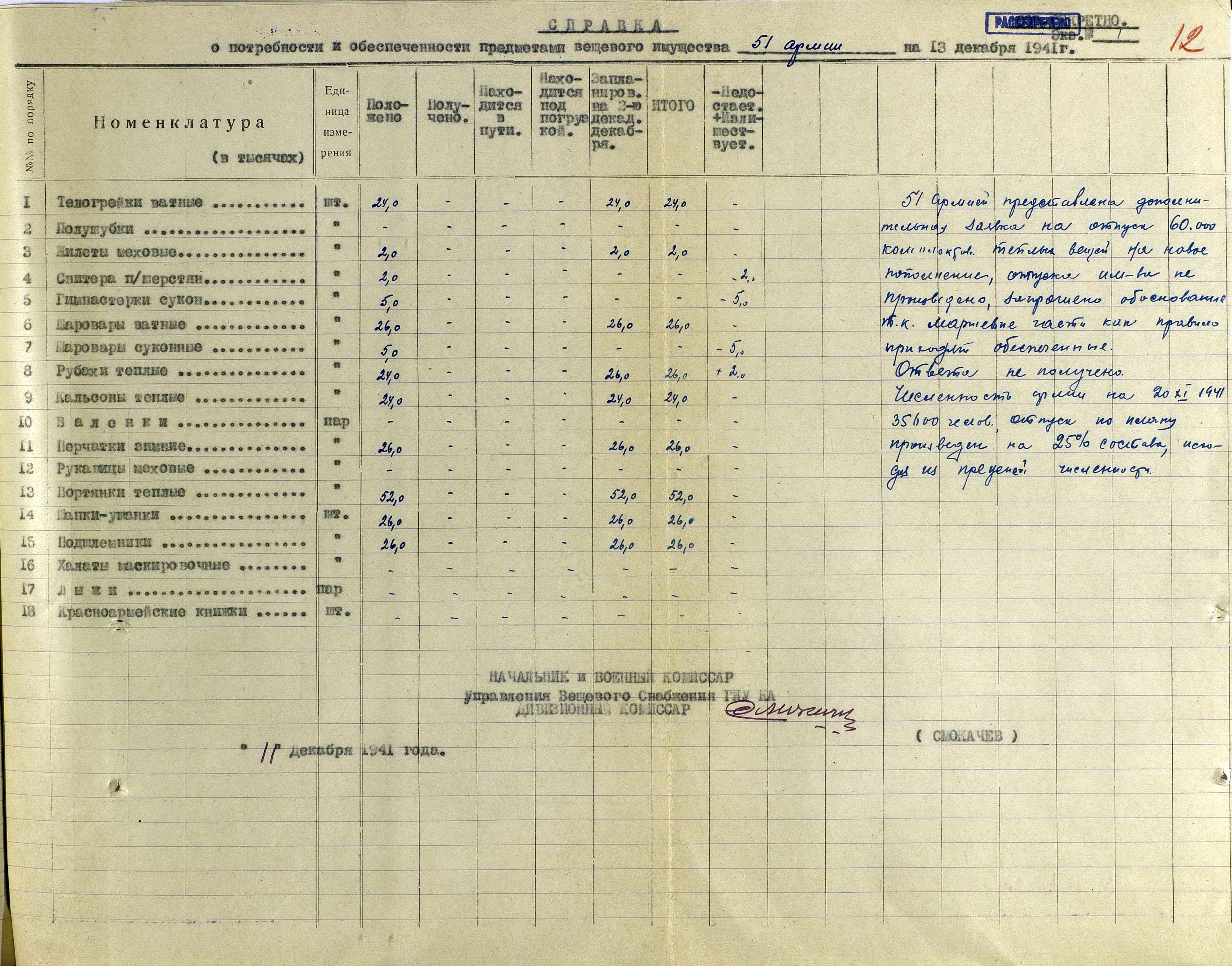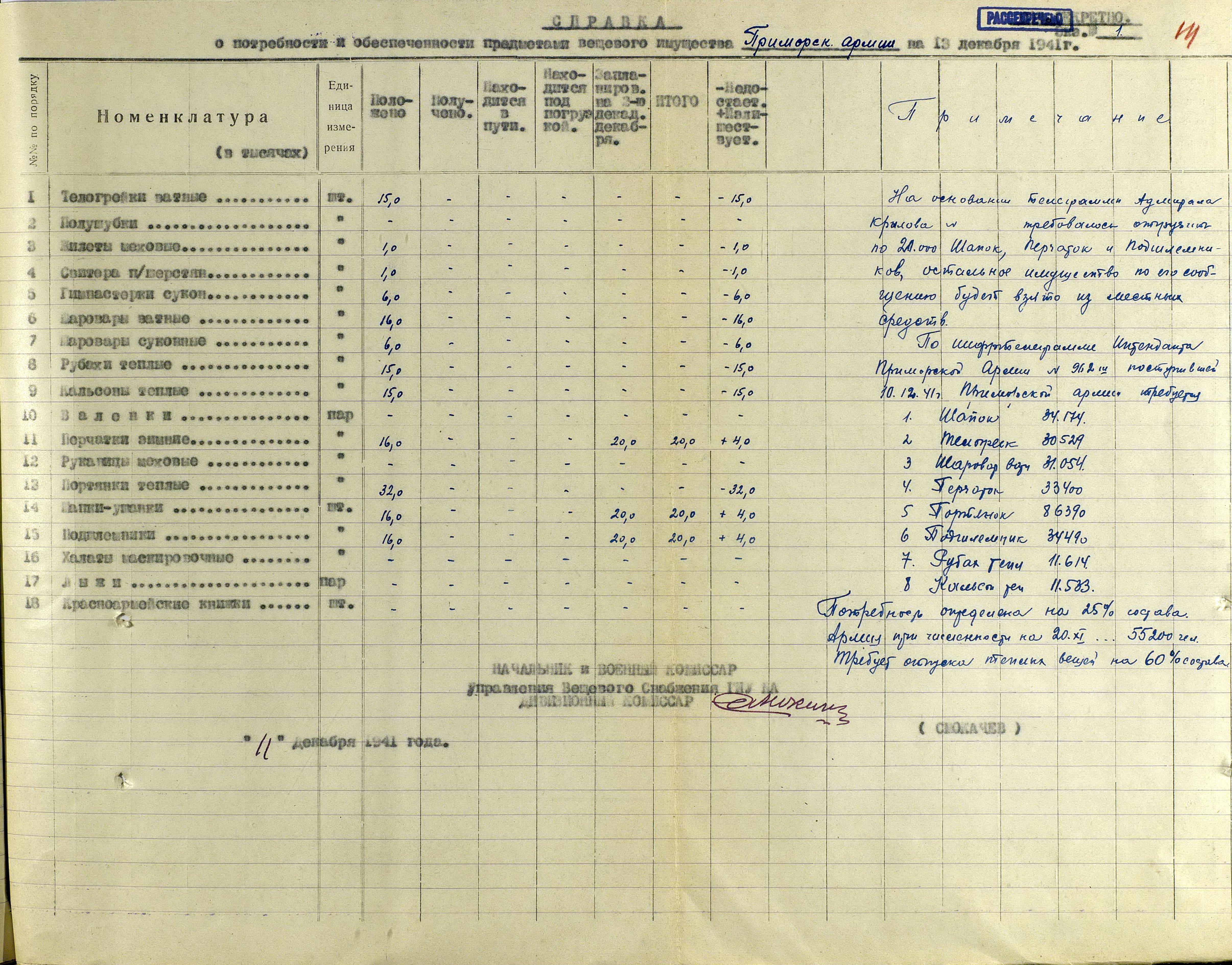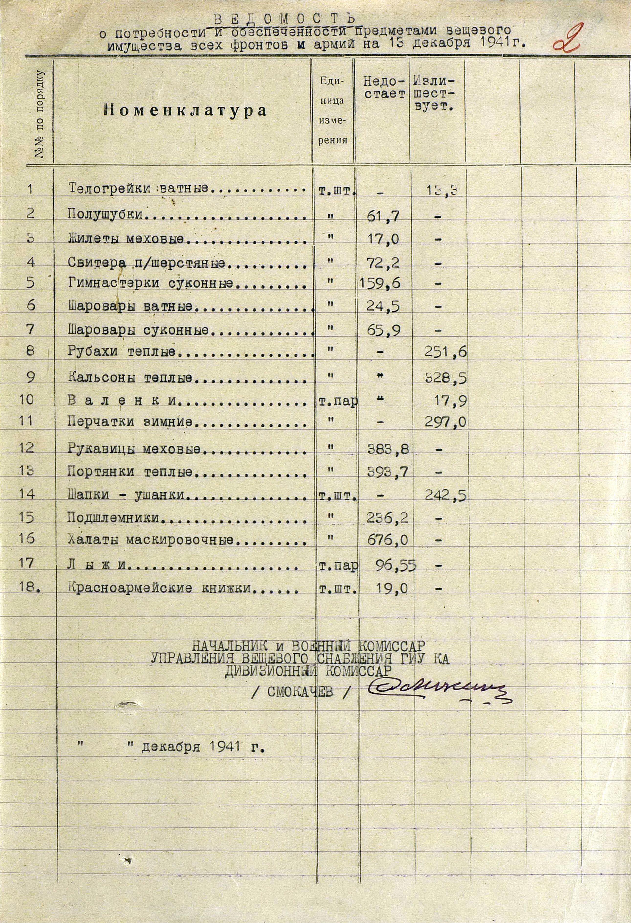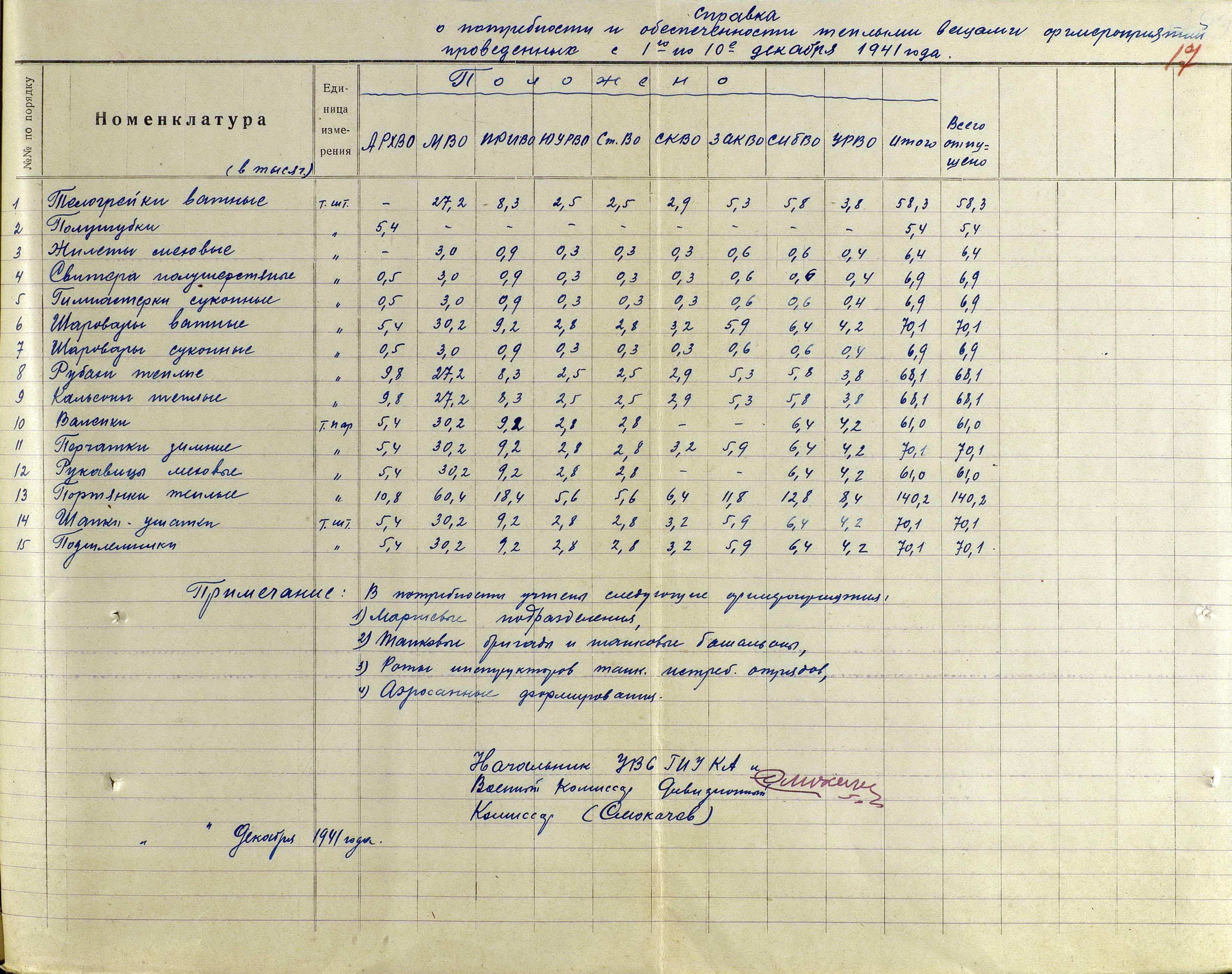 А о выполнении приказов Наркома обороны СССР и постановления ГКО, можно судить по Справке потребности – обеспеченности тёплыми вещами фронтов, по состоянию на 13 декабря 1941 г.